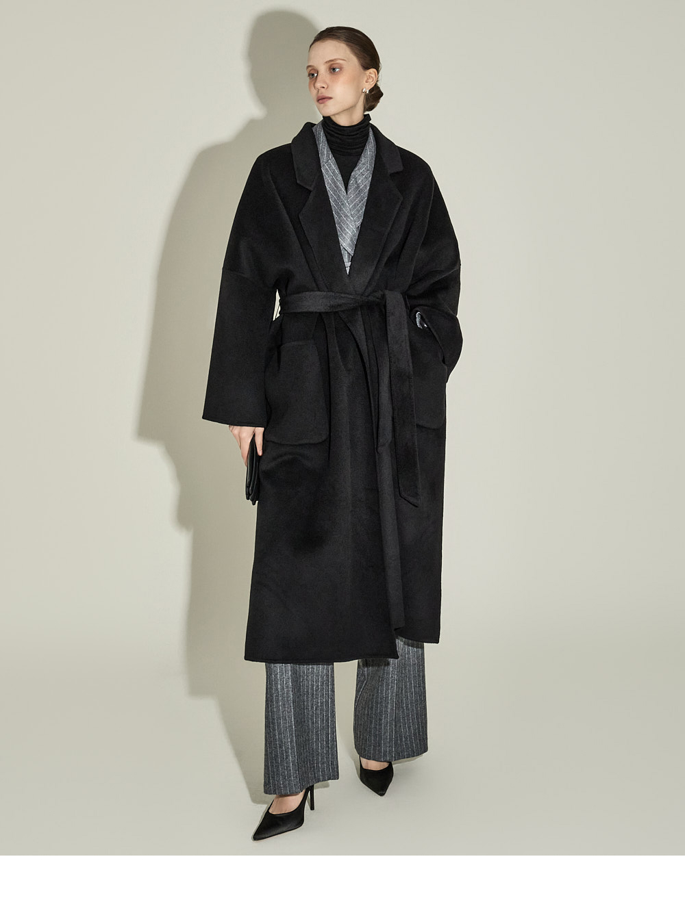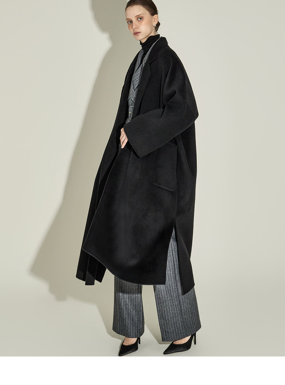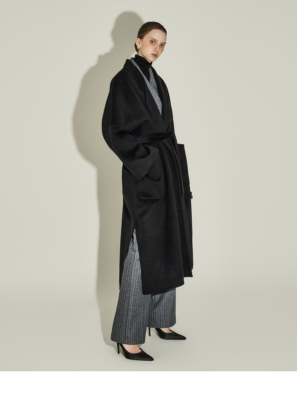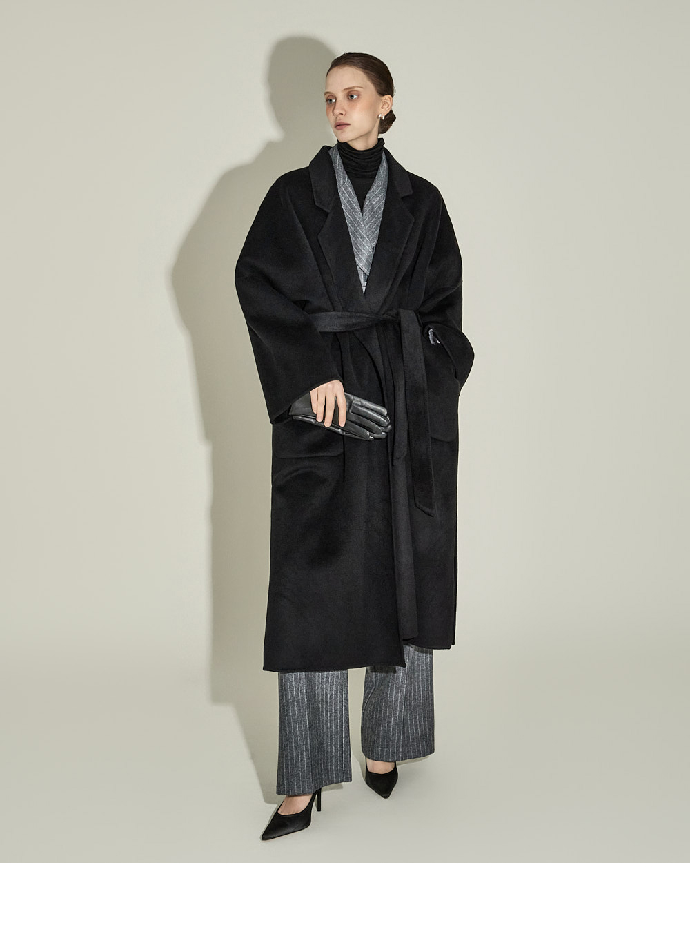 现代感十足的西装套装(夹克+西裤)。 采用聚酯纤维与羊毛混纺面料制作,兼具挺括感与柔韧性,细腻的条纹图案增添现代气息。 夹克为修身风格的风衣款式,配有翻领和腰带套装设计,可收紧腰线,塑造女性化且立体的剪裁效果。前襟纽扣及两侧口袋提升实用性,适中的肩垫让肩线更为稳固。 西裤为高腰设计,修身剪裁修饰腿部线条,侧边拉链与口袋设计简洁实用。 整套搭配可呈现精致的现代感造型,非常适合正式场合或办公穿着。 174CM 模特,夹克 ONE 码 / 西裤 S 码,灰色。