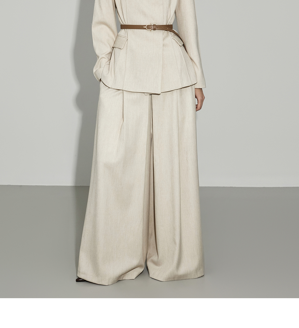这是一套散发精致气息的西装外套与西裤套装。