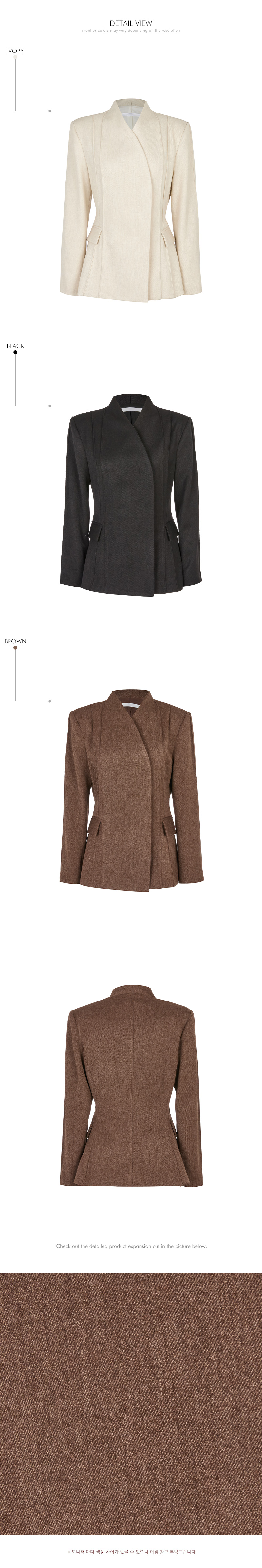 外套为无领设计,辅以裁剪线条,