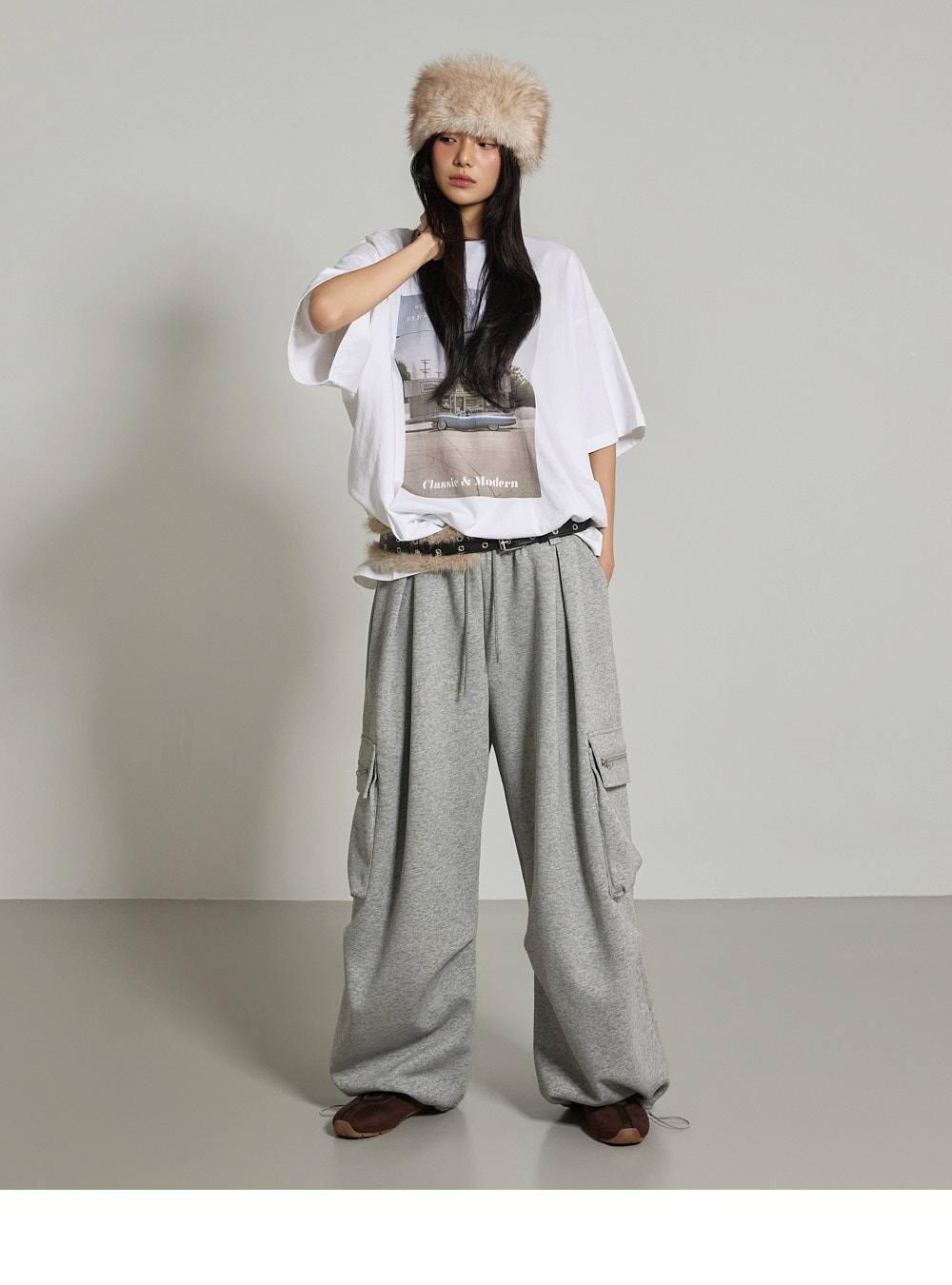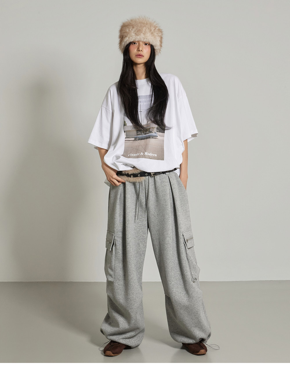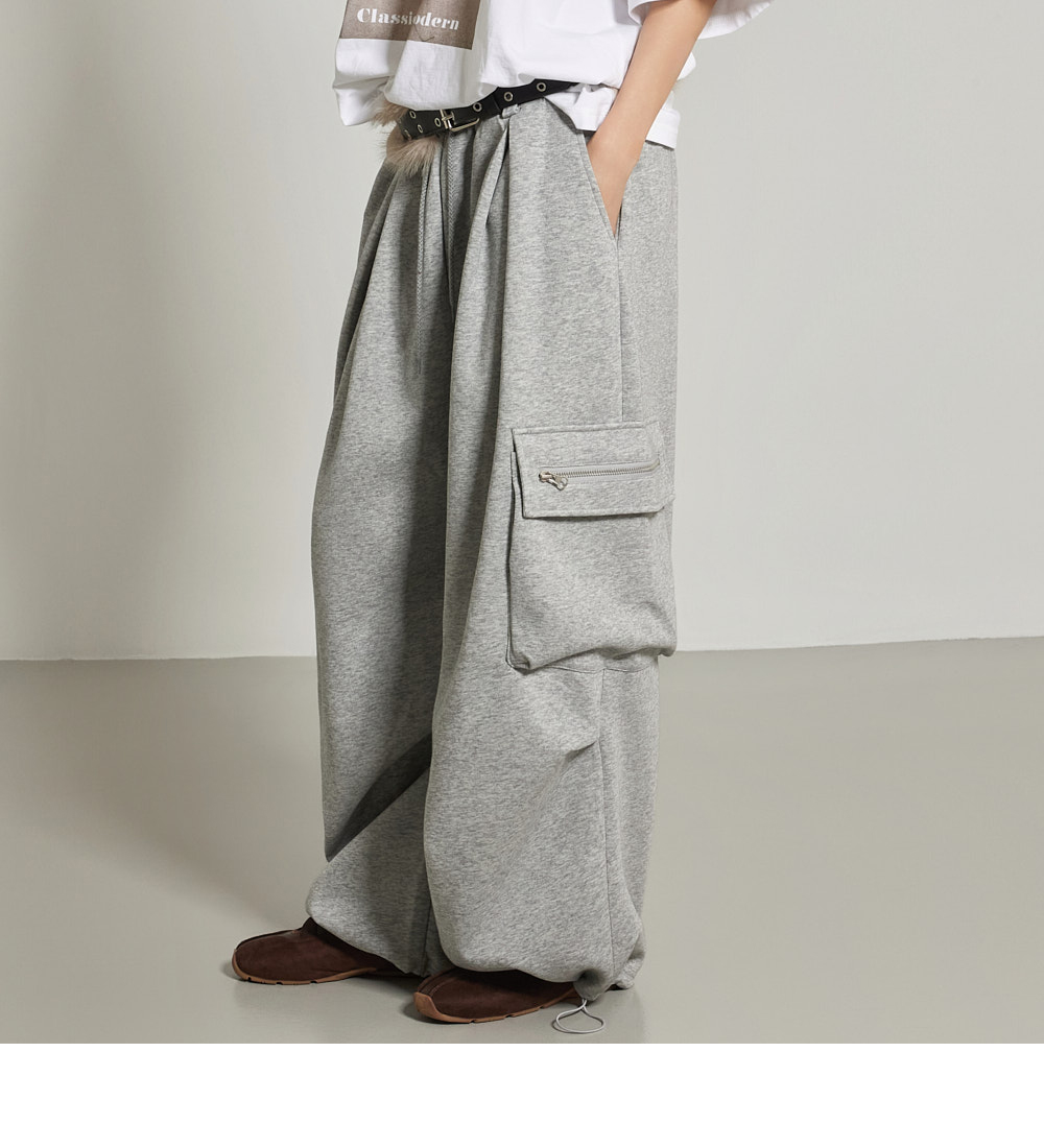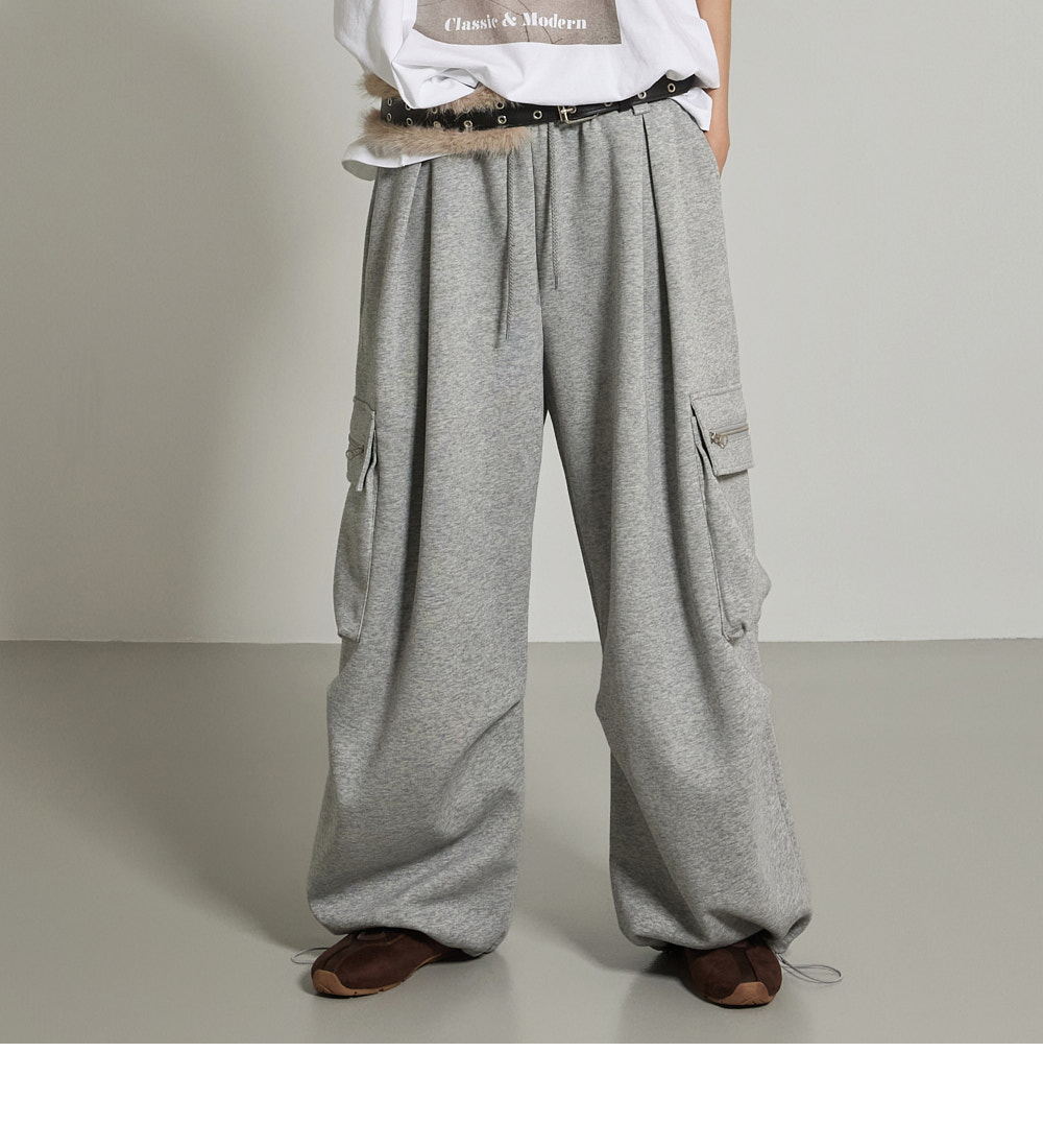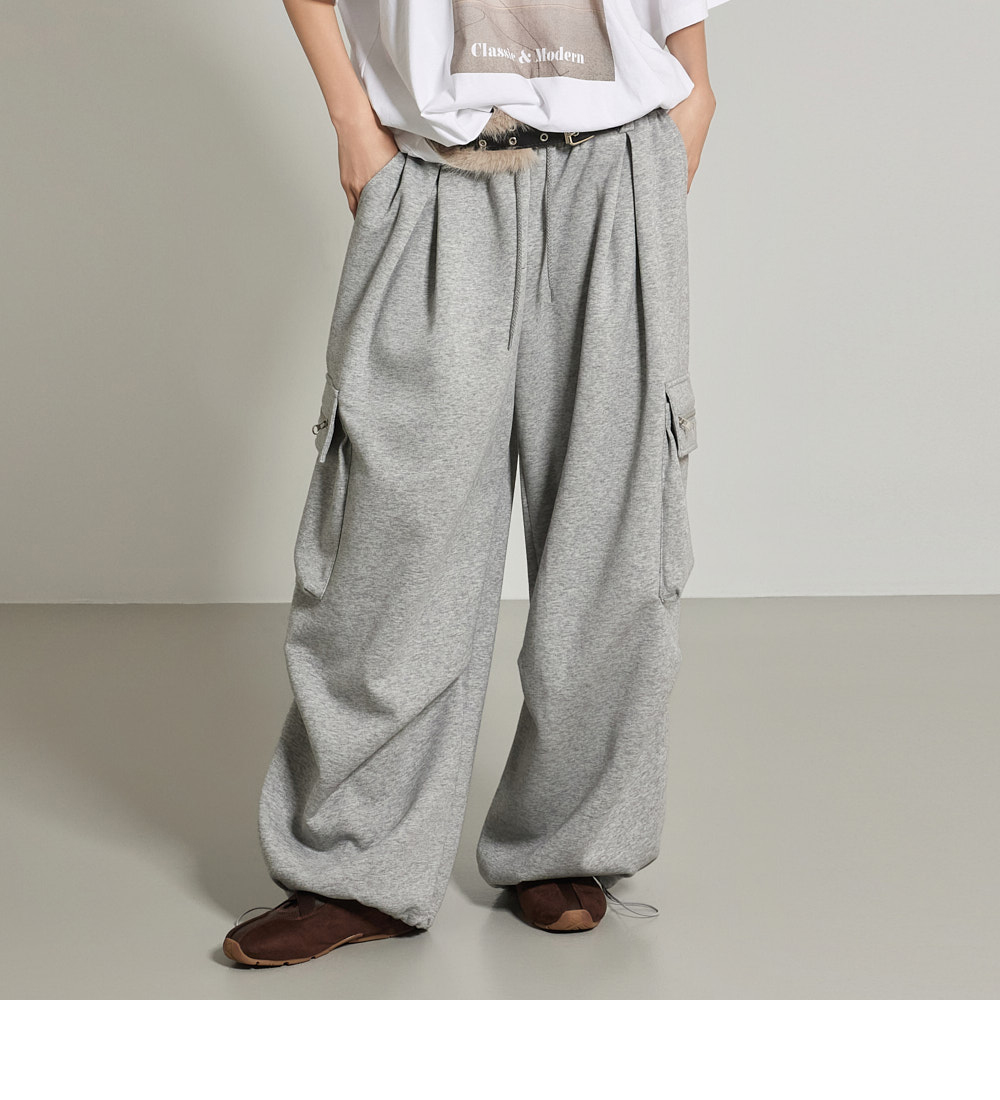 와이드핏 실루엣에 카고 포켓과 전면 핀턱 디테일