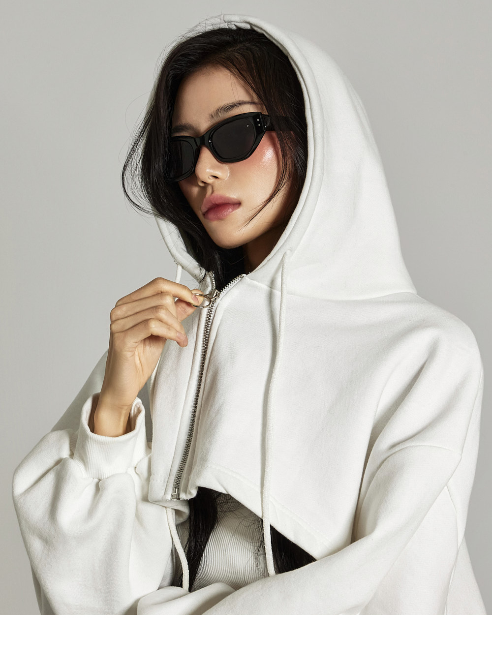 休闲风格的短款披肩拉链外套。 采用棉质面料制作,提供舒适的穿着感,内里加绒提升保暖性。 短款披肩版型呈现轻快氛围,不对称下摆与环形拉链增添时尚感,连帽丝绒抽绳与袖口弹性收口提升整体细节感,适度弹性保证舒适的活动性。 是一款日常穿搭中非常实用的休闲基础单品。 171CM 模特穿 ONE 尺码,白色。