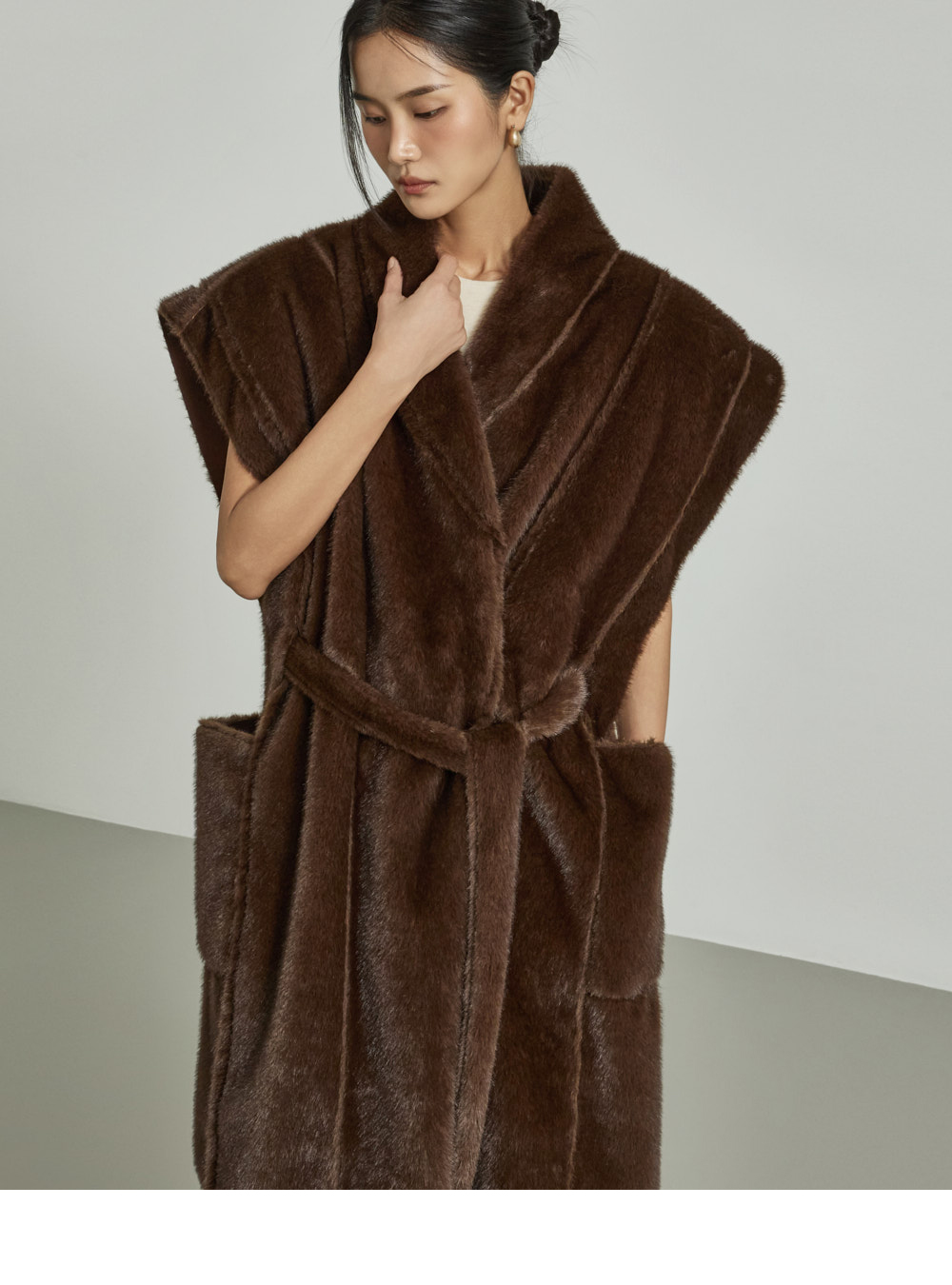 这是一款自然散发优雅气息的毛绒大衣。 采用高档触感的聚酯纤维面料制成,ONE尺码设计,适合所有人舒适穿着。 具有如真毛般丰盈柔软的质感,穿着时提供出色的保暖性,非常适合F/W季节。 整体呈现饱满的轮廓,搭配附带的腰带可收紧腰线,打造更具女性感和优雅氛围的造型。 取下腰带后,也可作为自然又精致的点缀外套使用,适合从正式场合到日常亮点穿搭的多种场合。 173CM模特穿着ONE尺码,颜色为DARK BROWN。