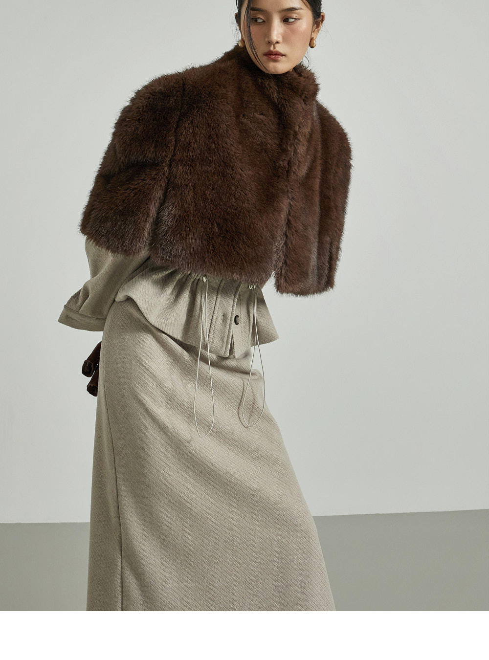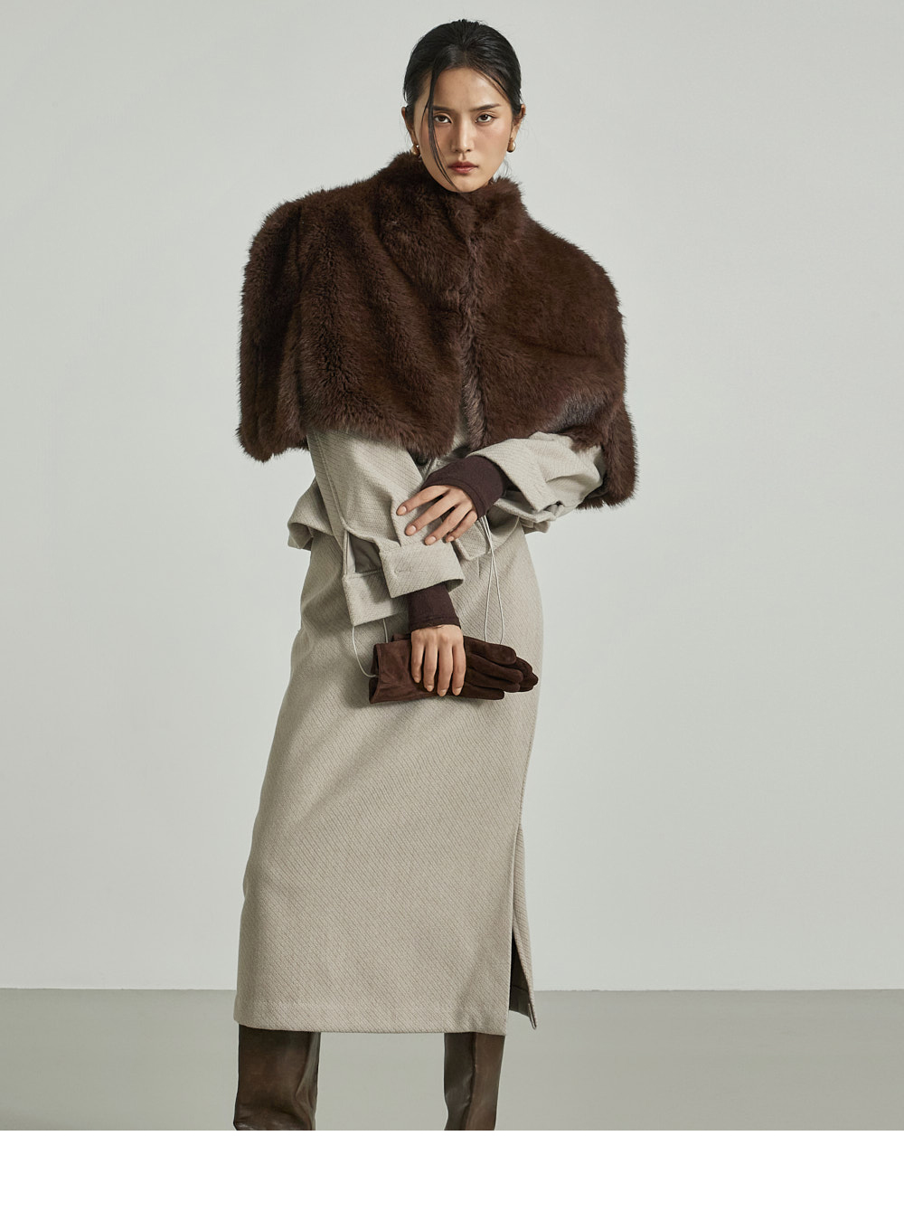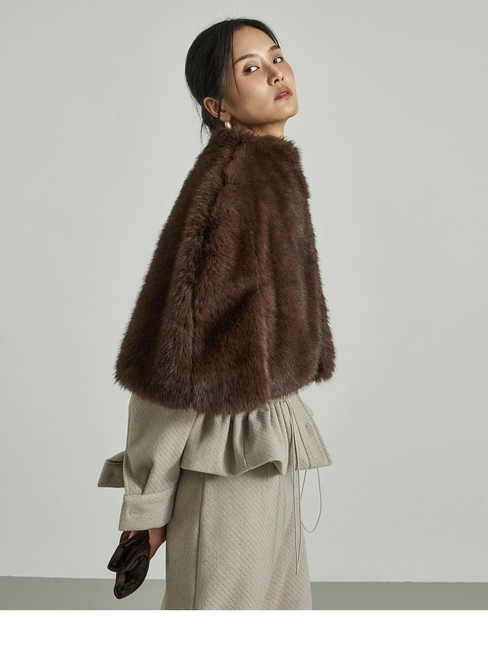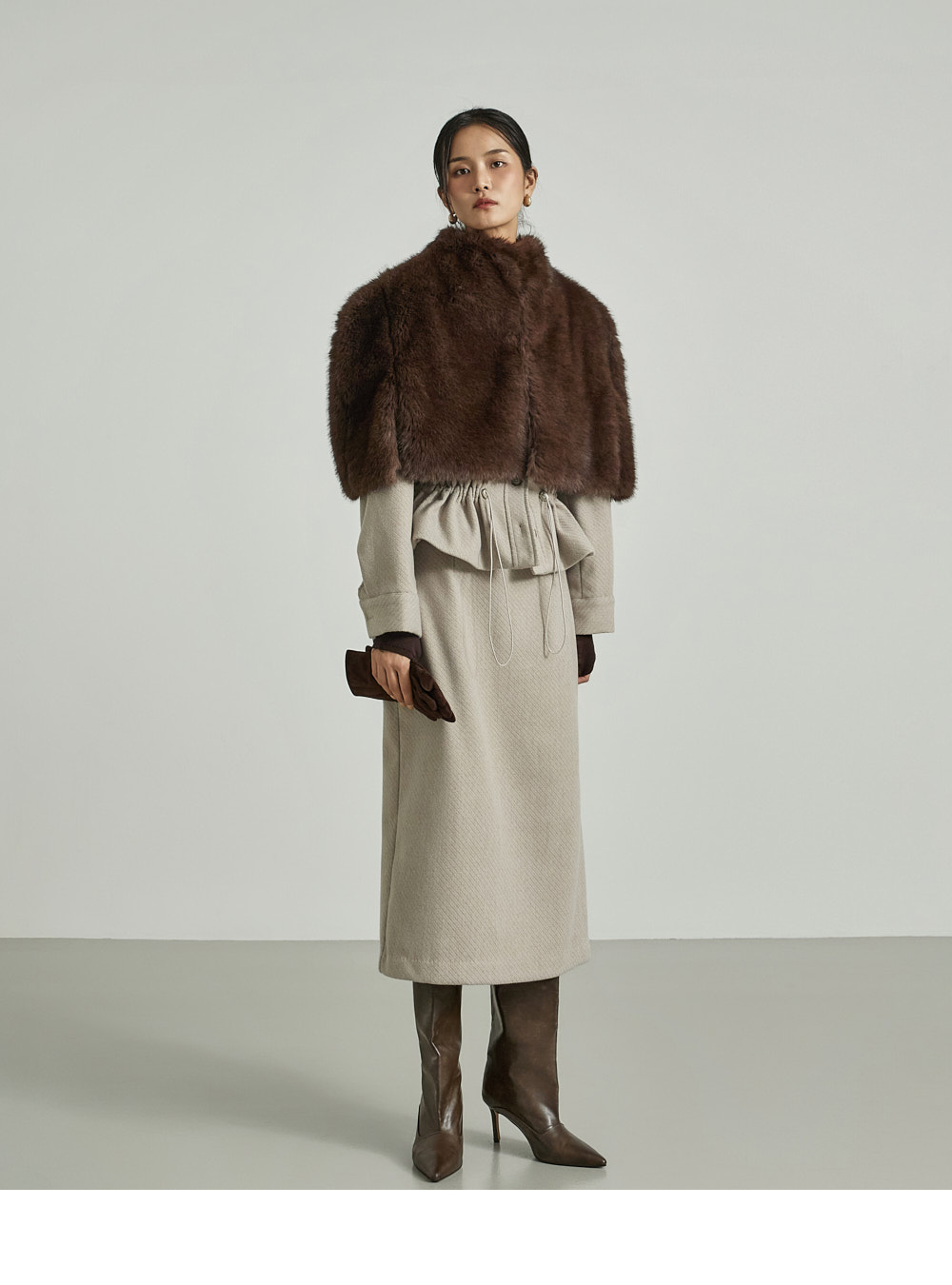 模特身高173CM,穿着ONE尺码,颜色为DARK BROWN。