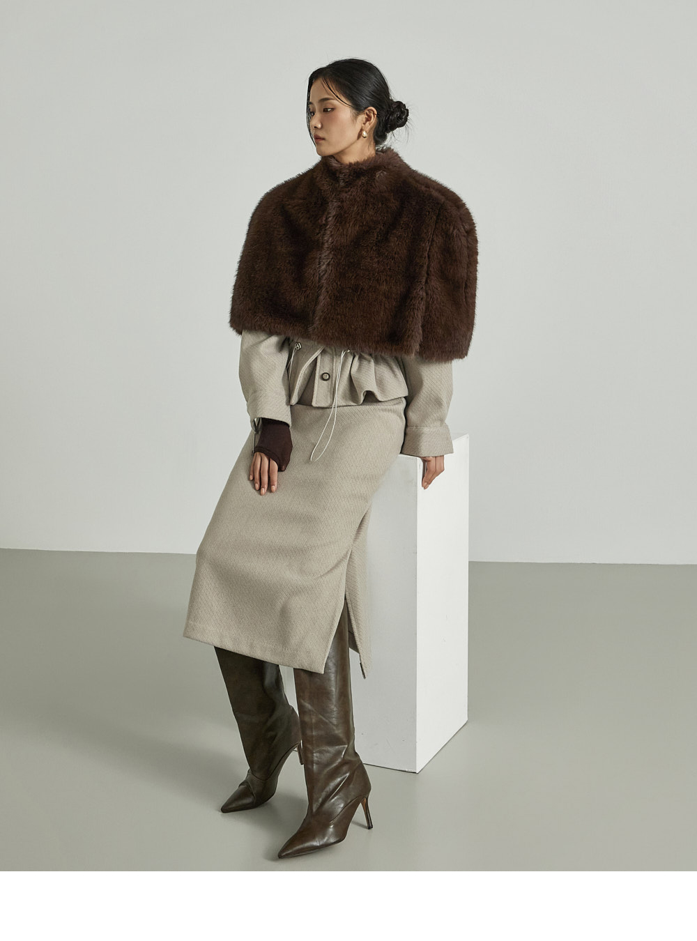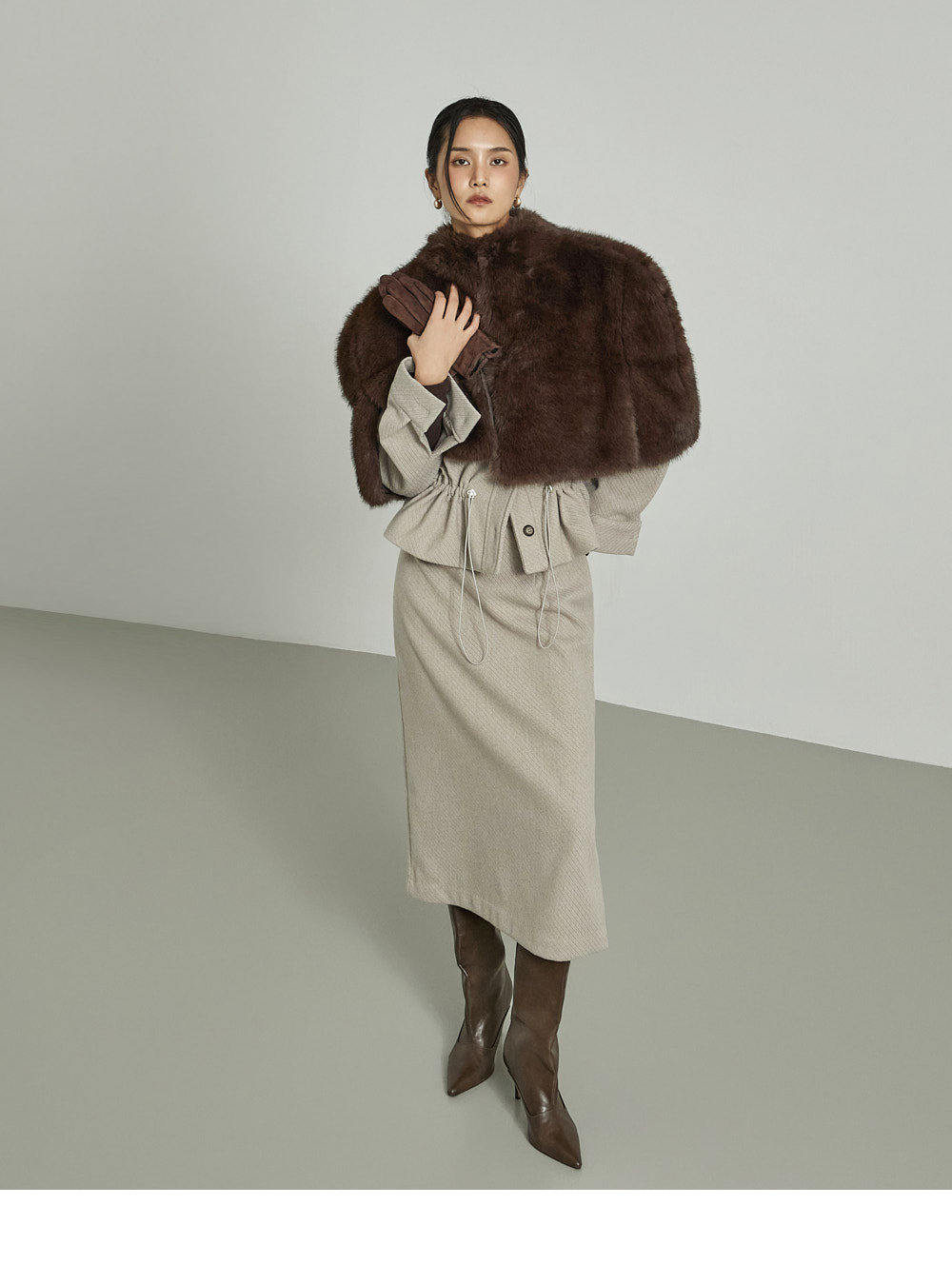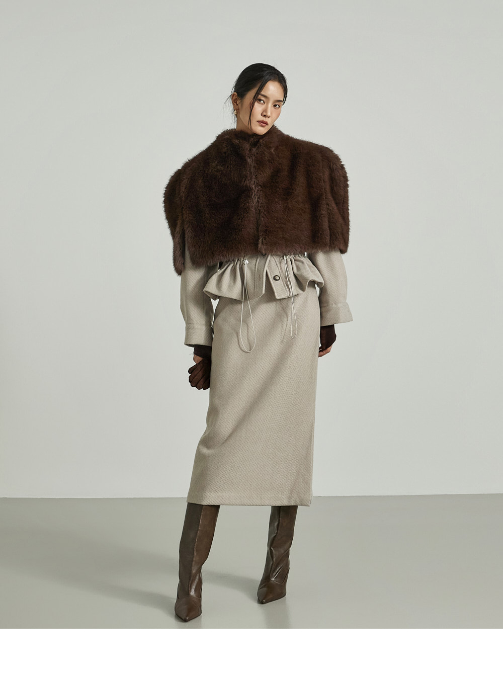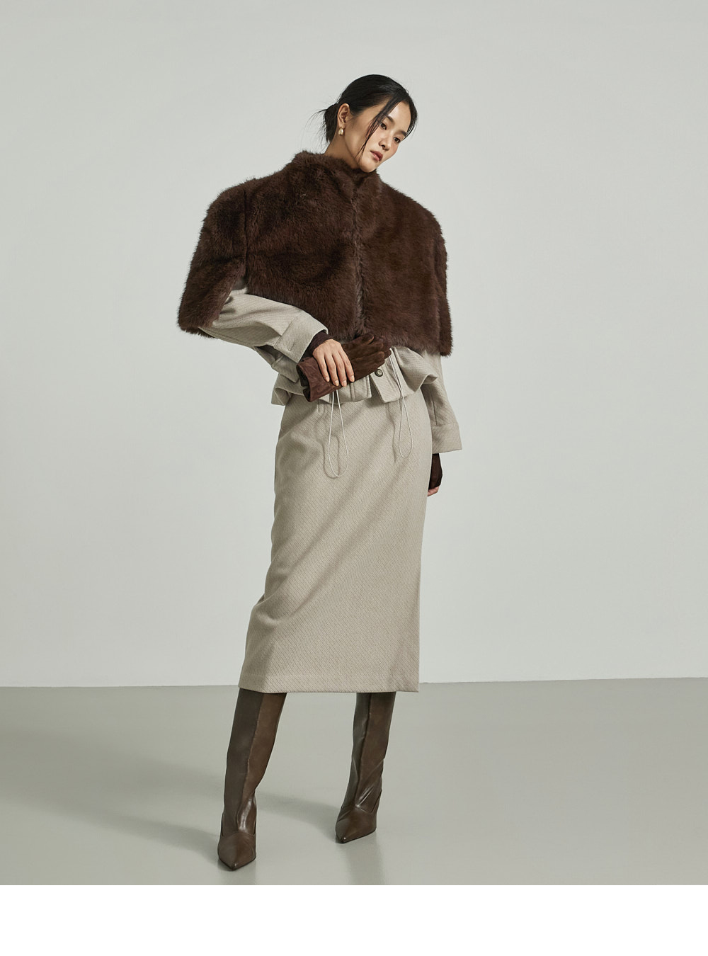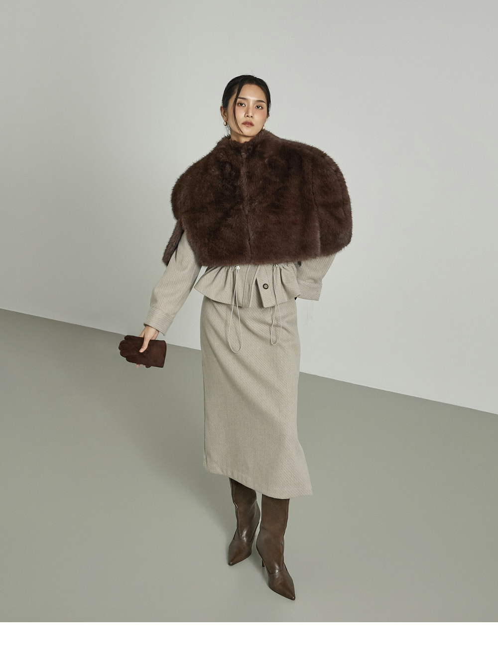 模特身高173CM,穿着ONE尺码,颜色为DARK BROWN。