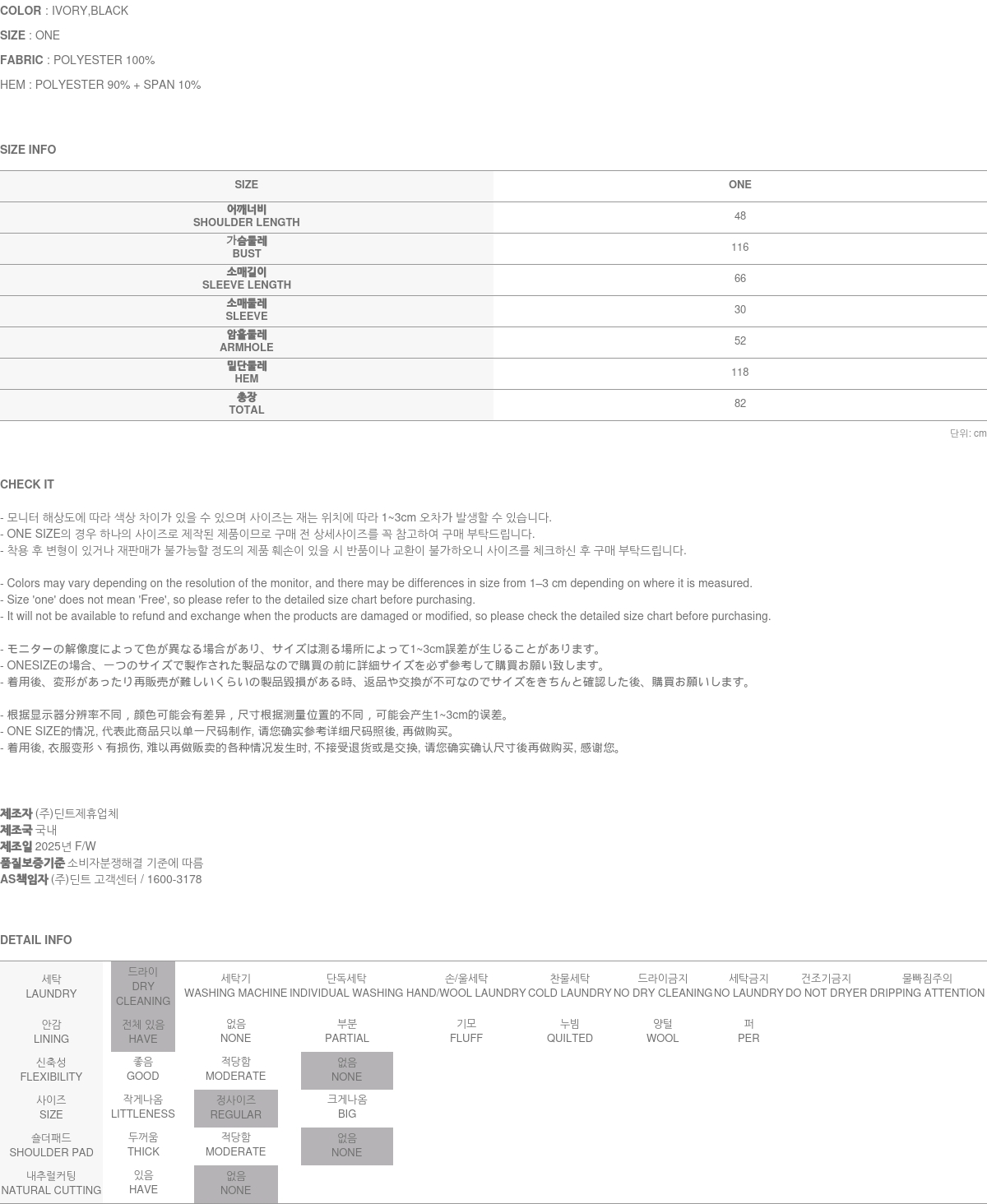 換貨 與 退貨 收到商品後, 7日內能在我的頁面申請交換或退貨, 申請後請將商品寄回DINT. 申請後, 請填寫包裹裡一同寄去的撤回申請書, 再將包裹包裝成一開始您收到時的狀態(包裝袋、衣架、贈品皆要一起寄送回來)發送至DINT即可. 因爲顧客變心所申請的換貨與退貨, 運費將由顧客負擔;誤送或是商品瑕疵的部分, 將由DINT負擔運費. 退貨住所爲:首爾市 衿川區 加山洞 459-8號 大韓通運 7樓 DINT股份有限公司 品質保證標準說明:符合電子商務等有關消費者保護法律規定的消費者可申請交換或是退貨.