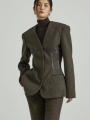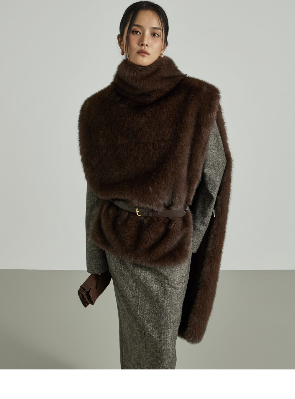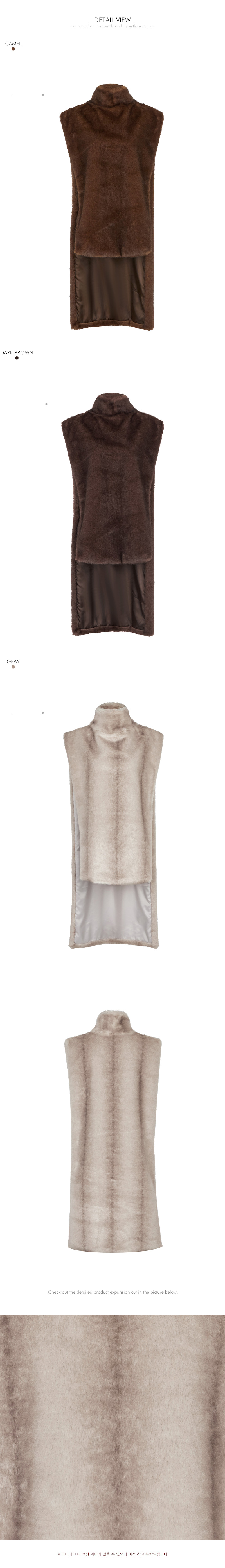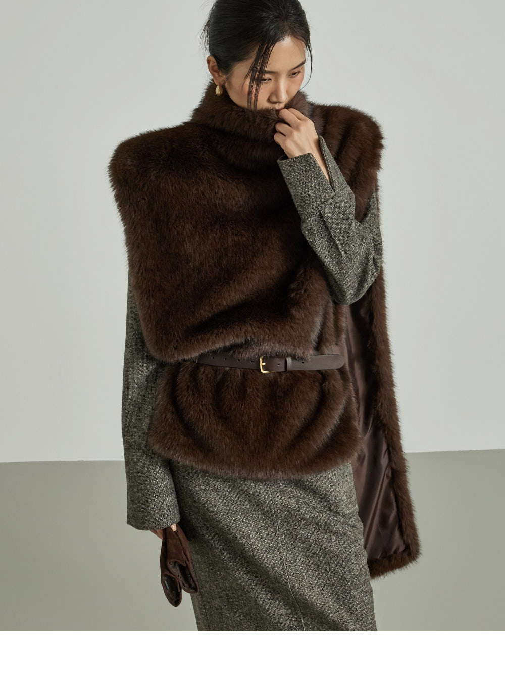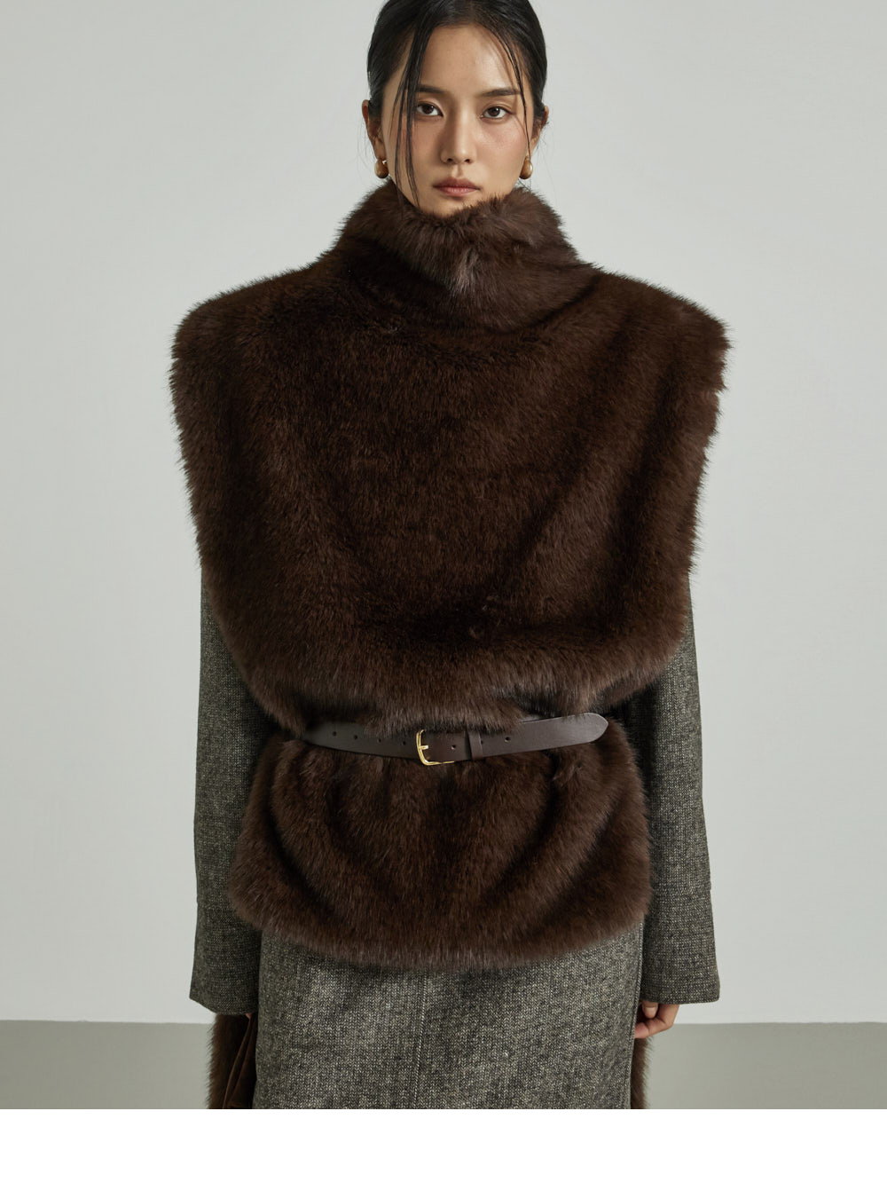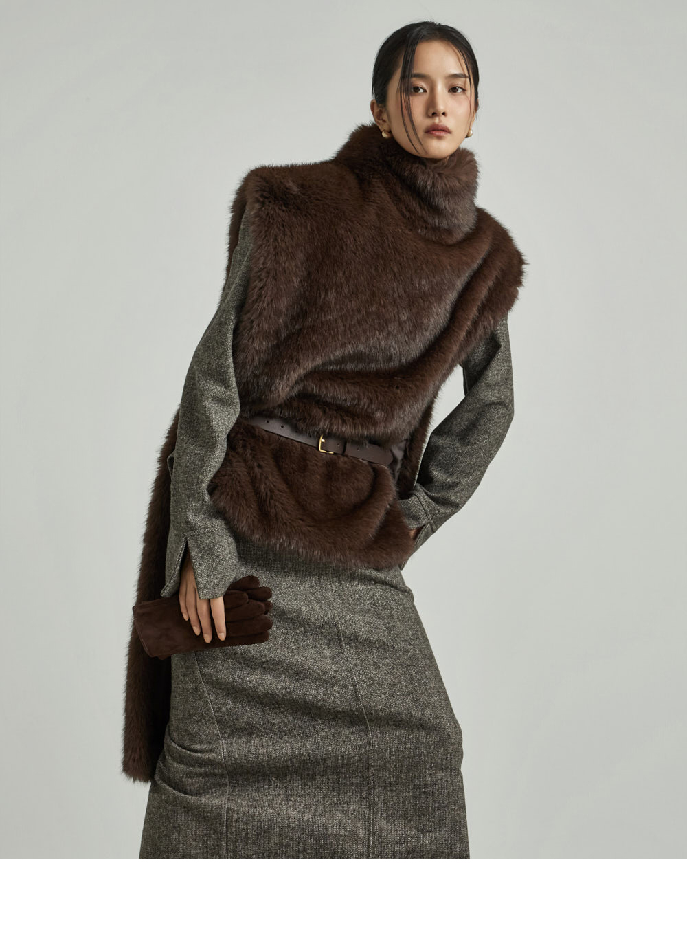 这是一款散发优雅气息的高领毛绒背心。 采用聚酯毛绒面料制作,质地柔软且丰盈的纹理十分突出,高高立起的高领设计展现精致的轮廓。 长款版型自然下垂,为整体造型增添高级感与优雅氛围,两侧深开叉设计,在叠搭时更能展现美丽轮廓。 全内衬设计,穿着稳固舒适,搭配衬衫或针织衫时,成为造型的亮点单品。 模特身高173CM,穿着ONE尺码,颜色为DARK BROWN。