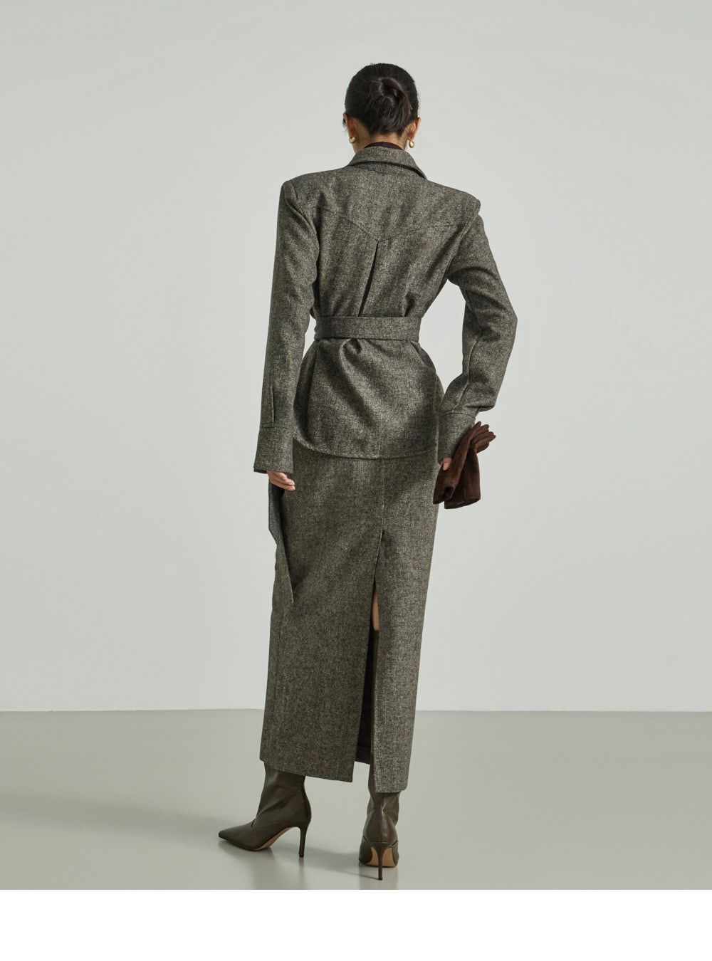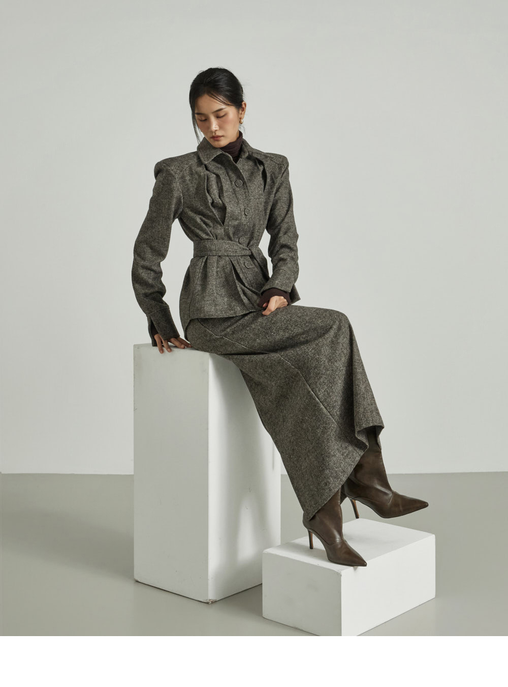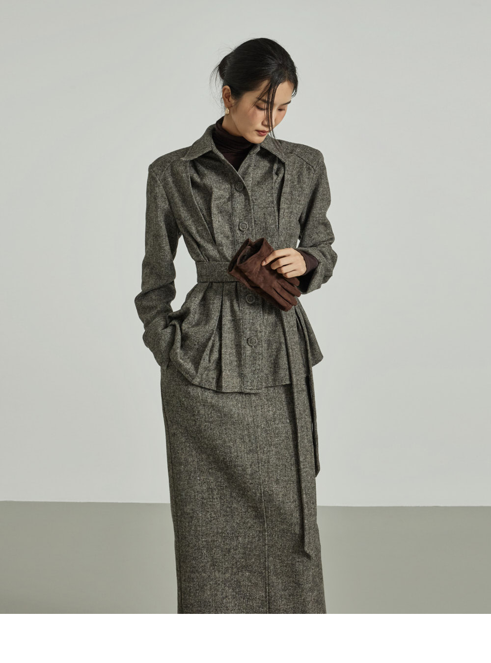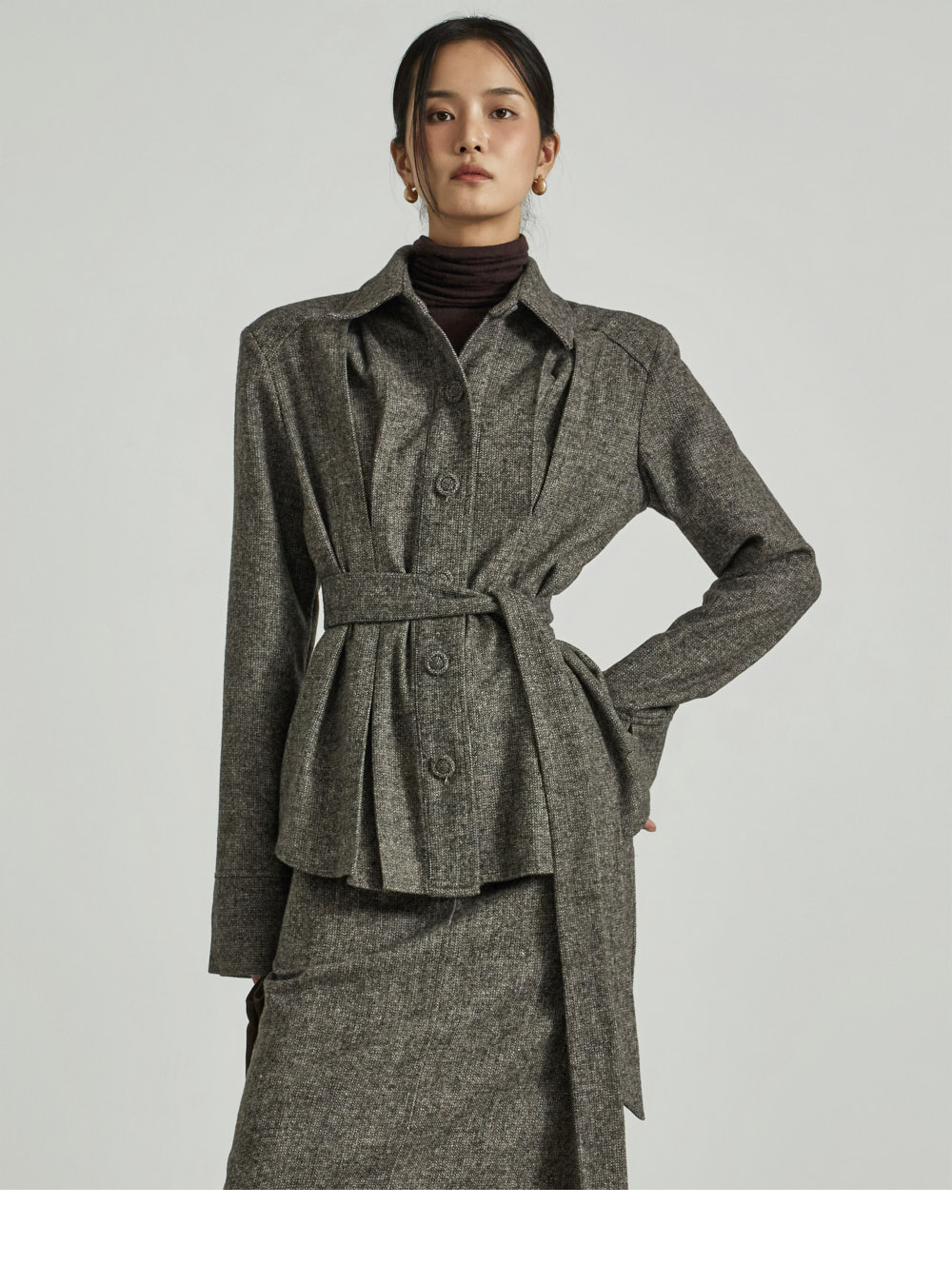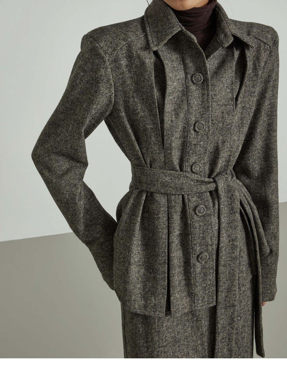单排领设计,搭配腰带套装,可进行多样搭配。
