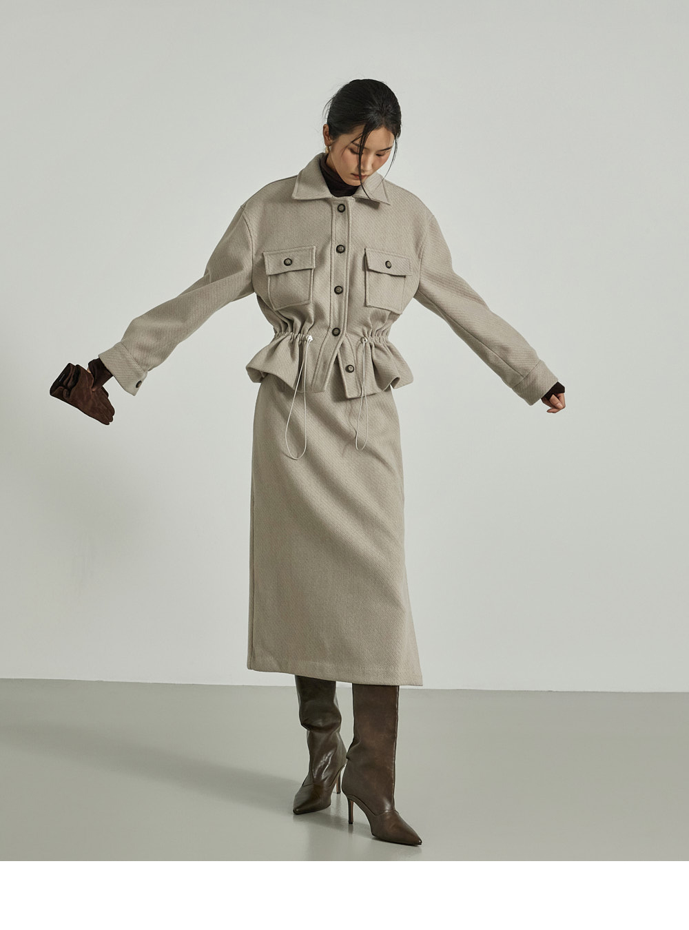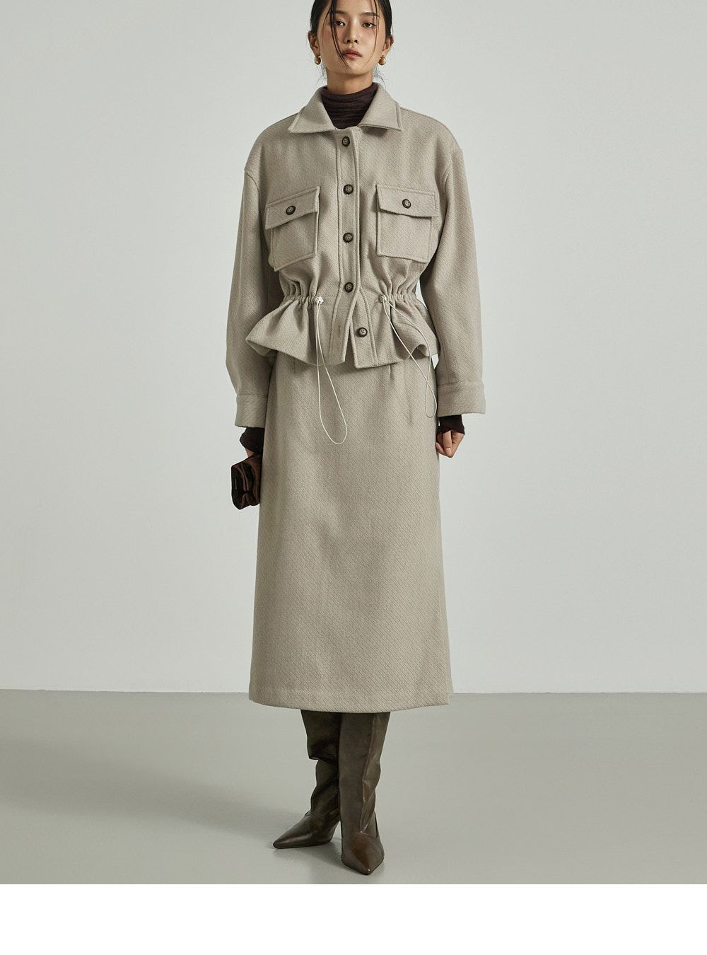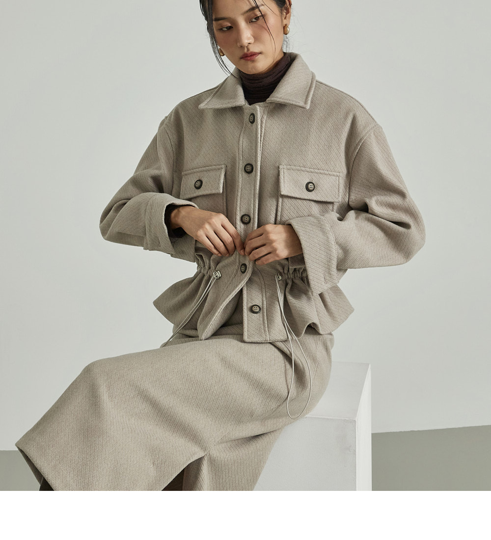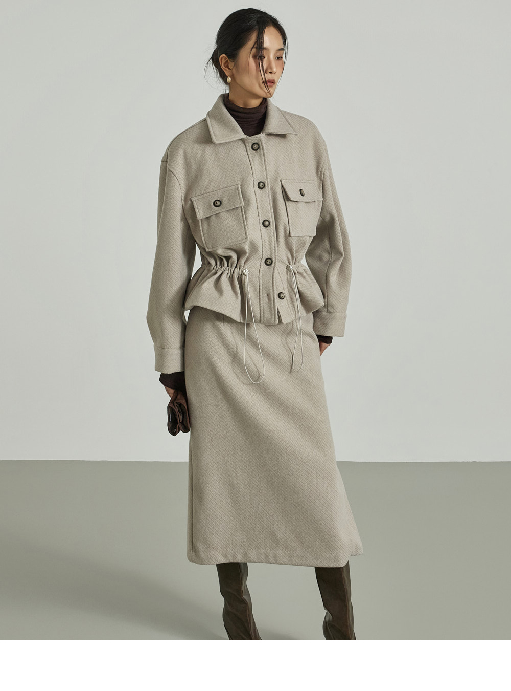 模特身高173CM,夹克穿ONE尺码,裙子穿S尺码,颜色为BEIGE。