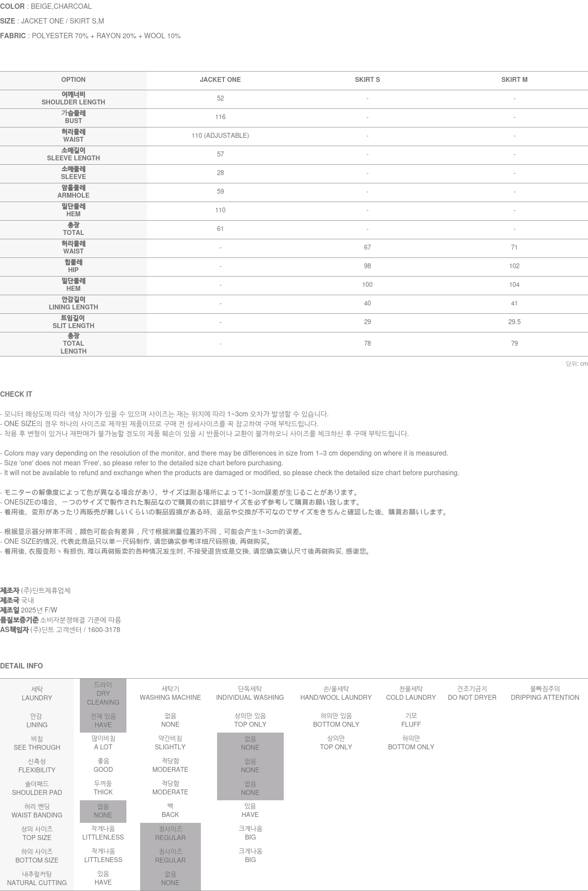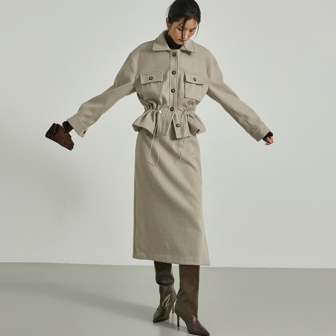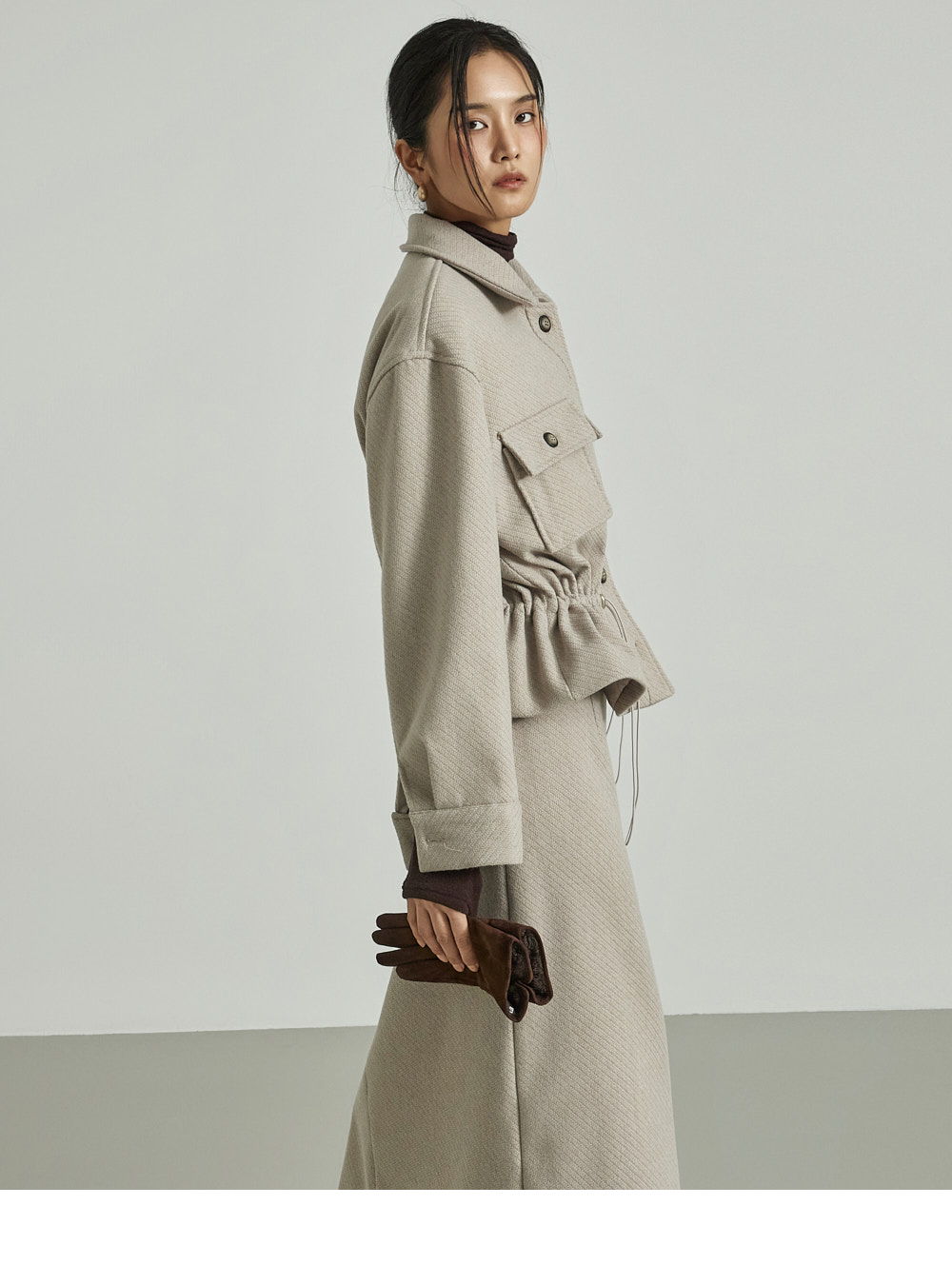 模特身高173CM,夹克穿ONE尺码,裙子穿S尺码,颜色为BEIGE。