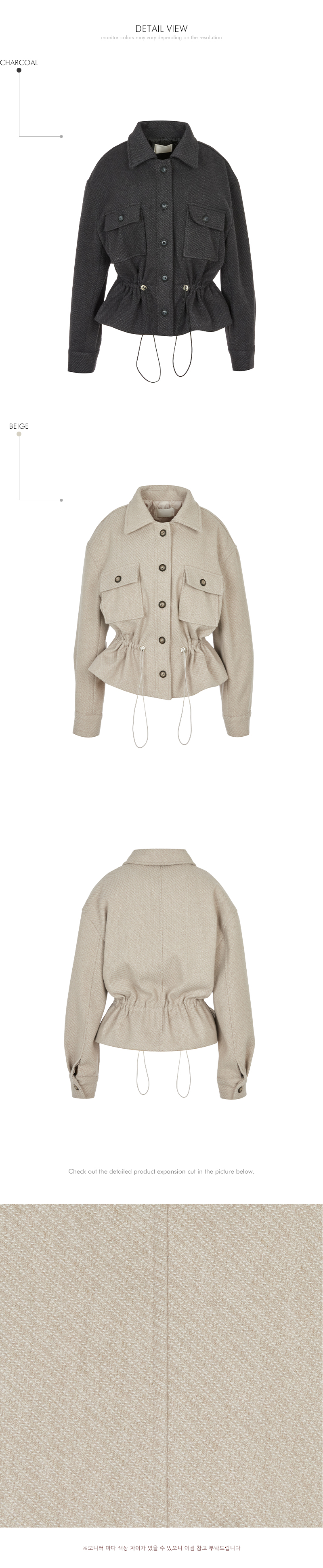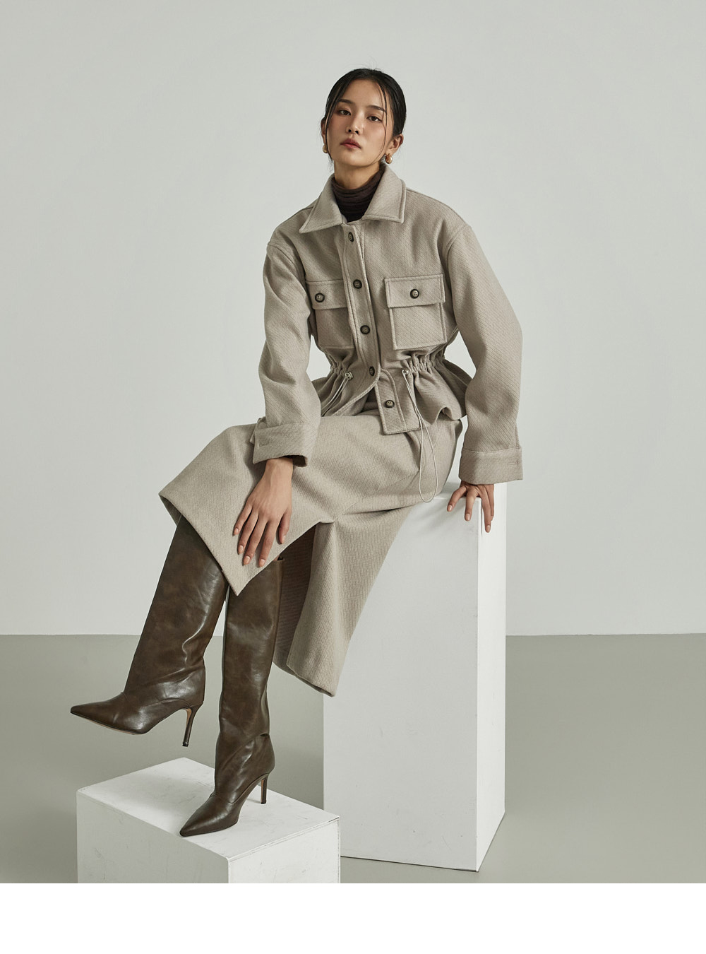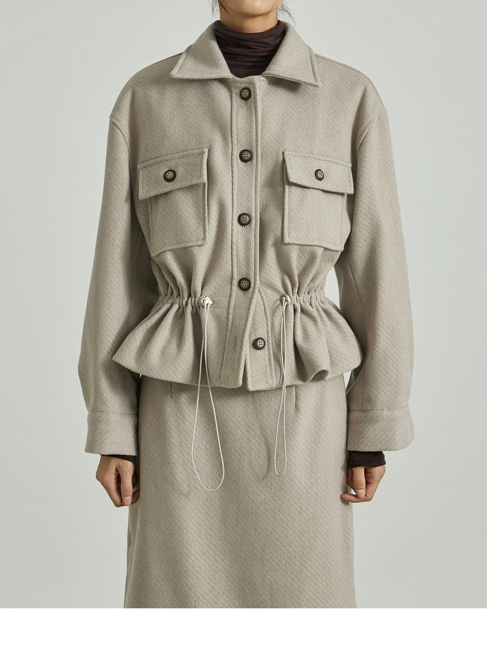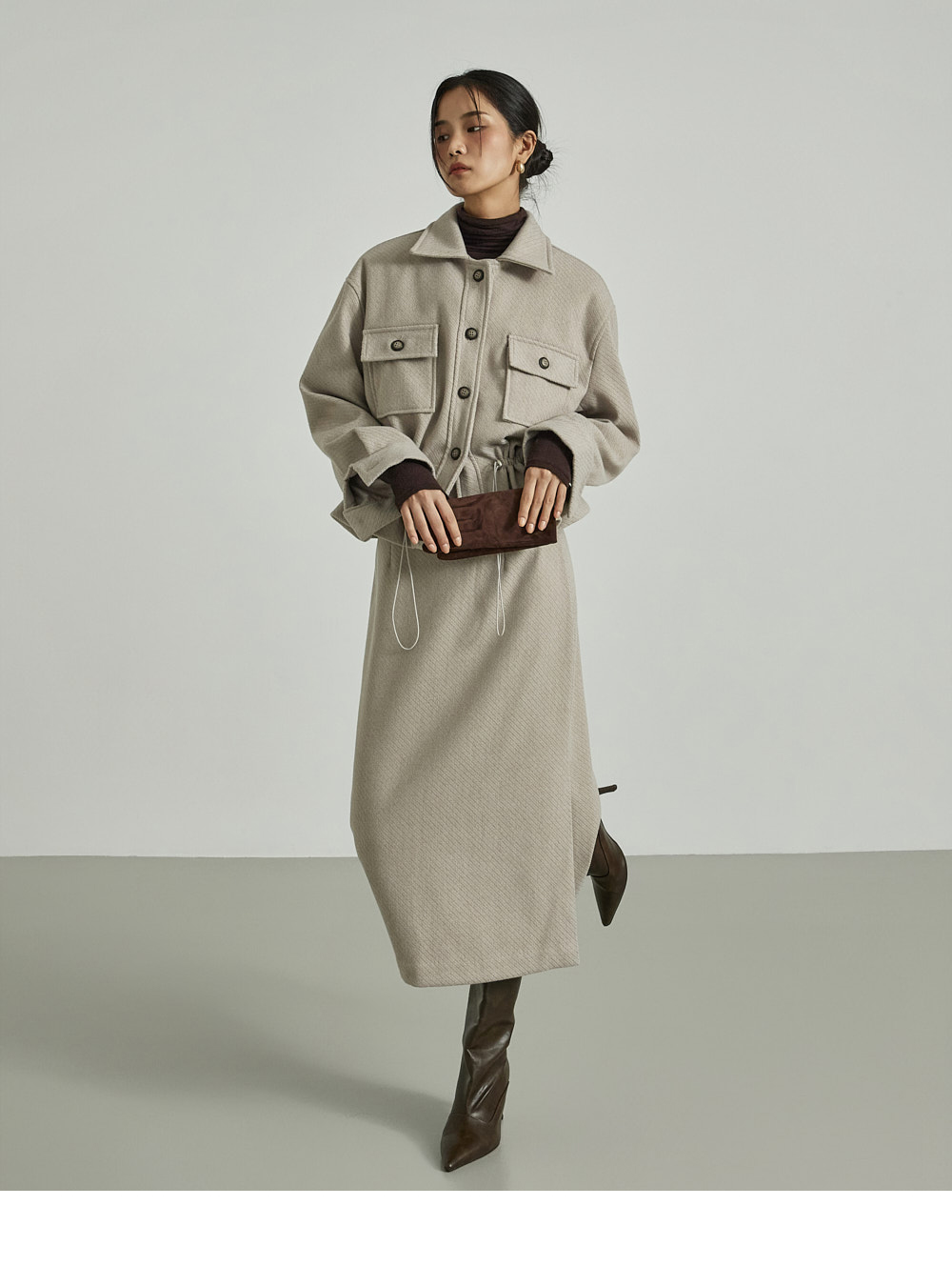 模特身高173CM,夹克穿ONE尺码,裙子穿S尺码,颜色为BEIGE。