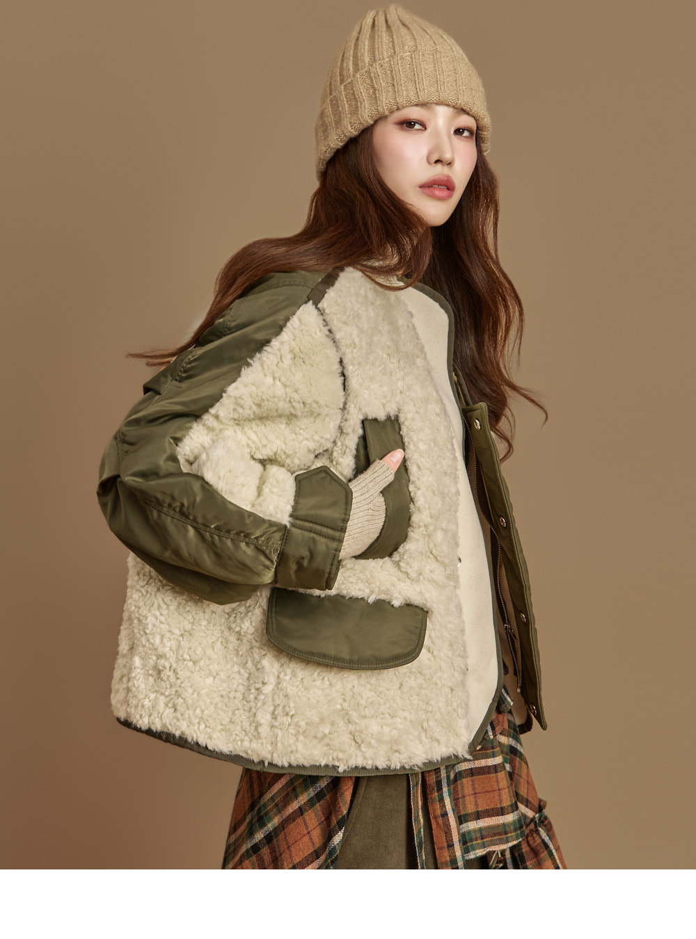 这是可爱休闲风格的羊羔毛飞行员夹克。