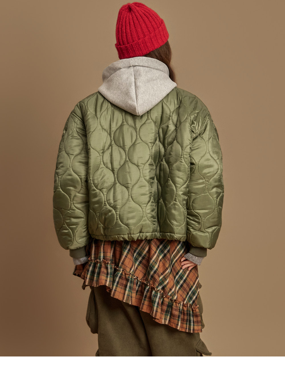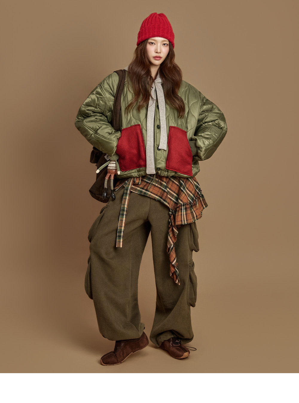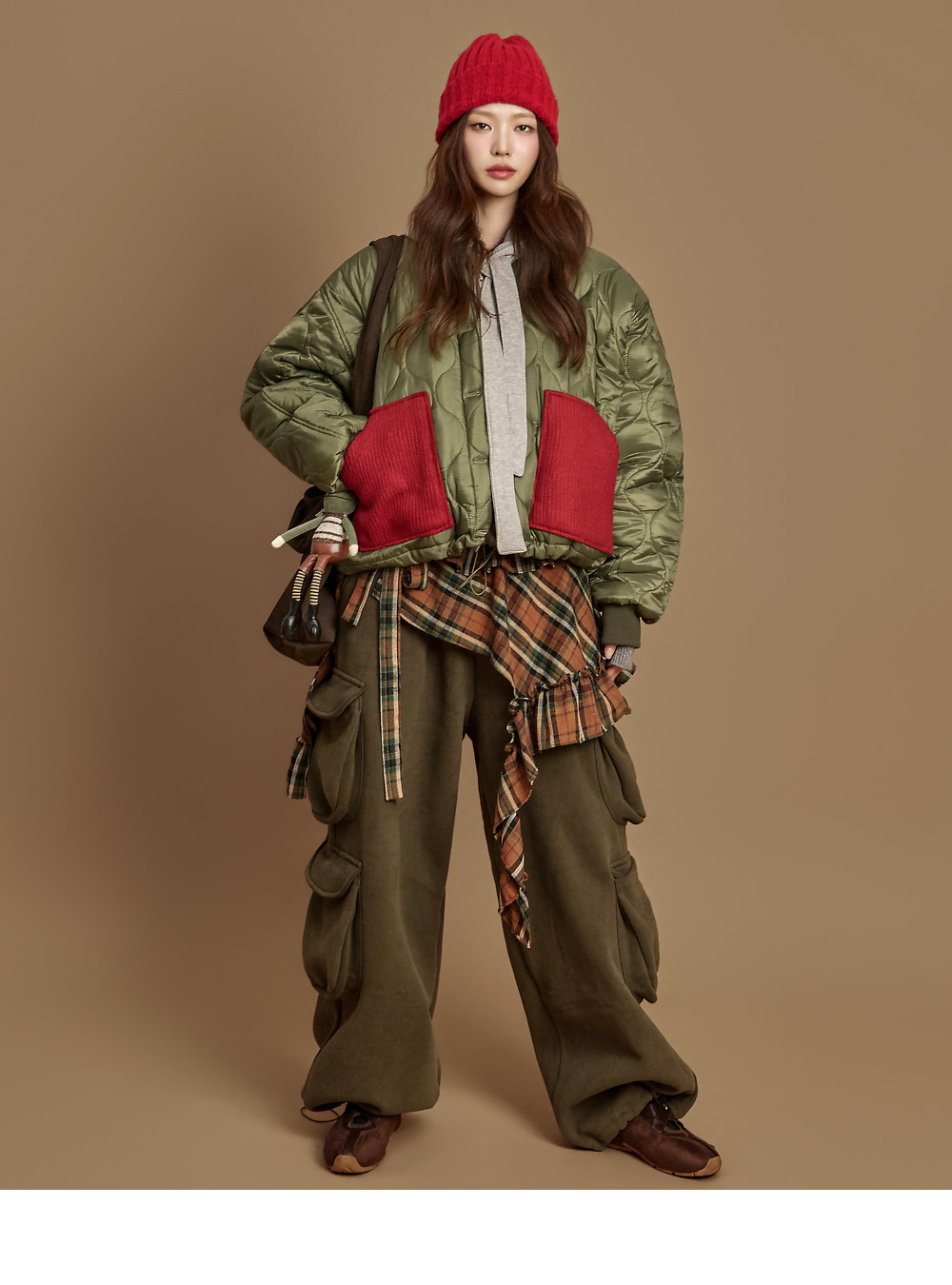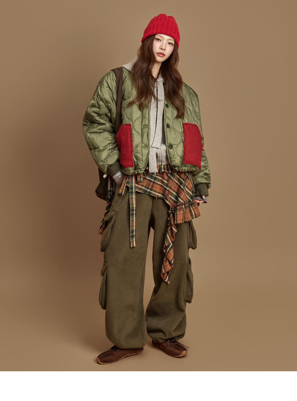 171CM 模特,ONE 尺码,卡其色穿着。