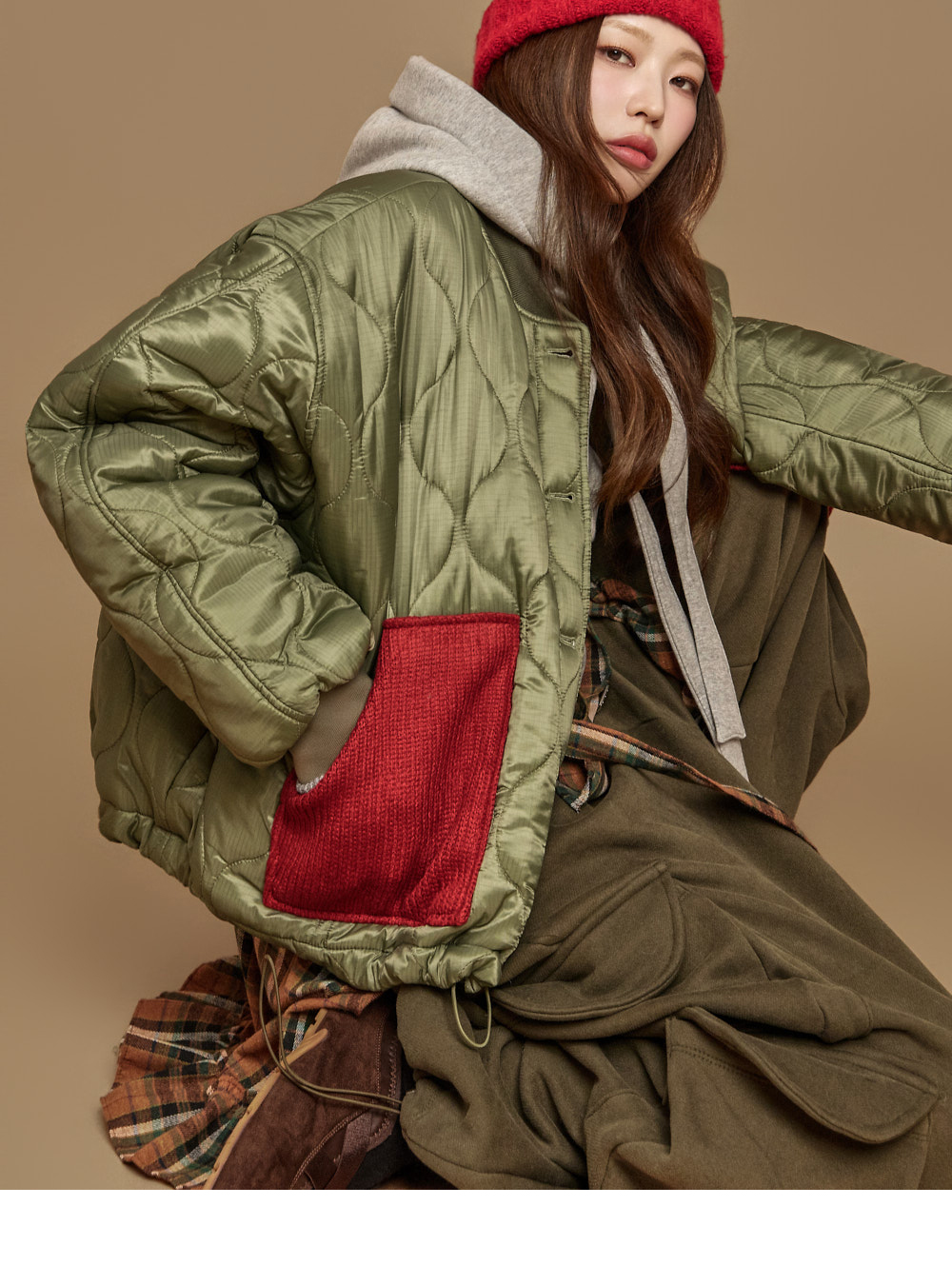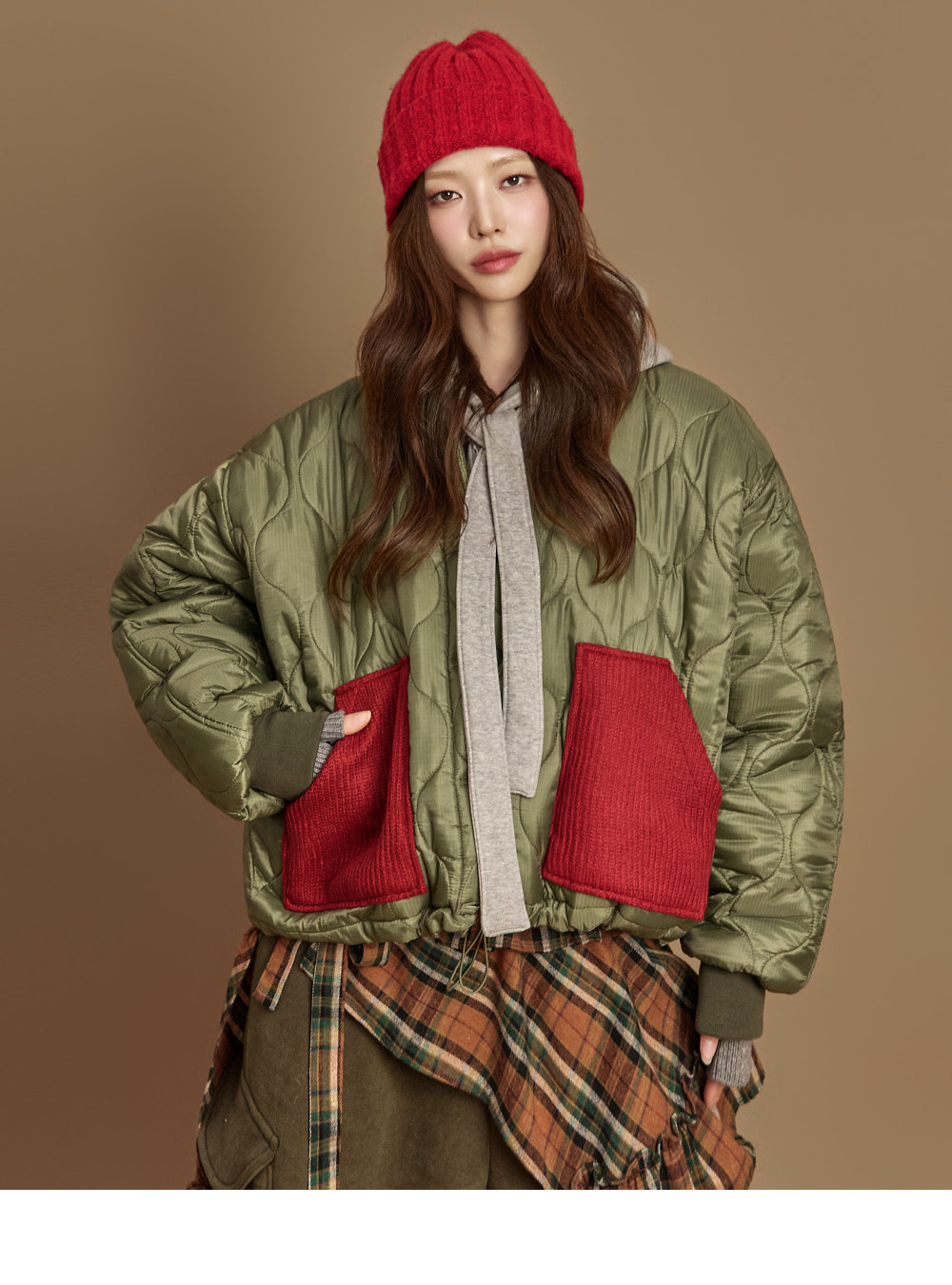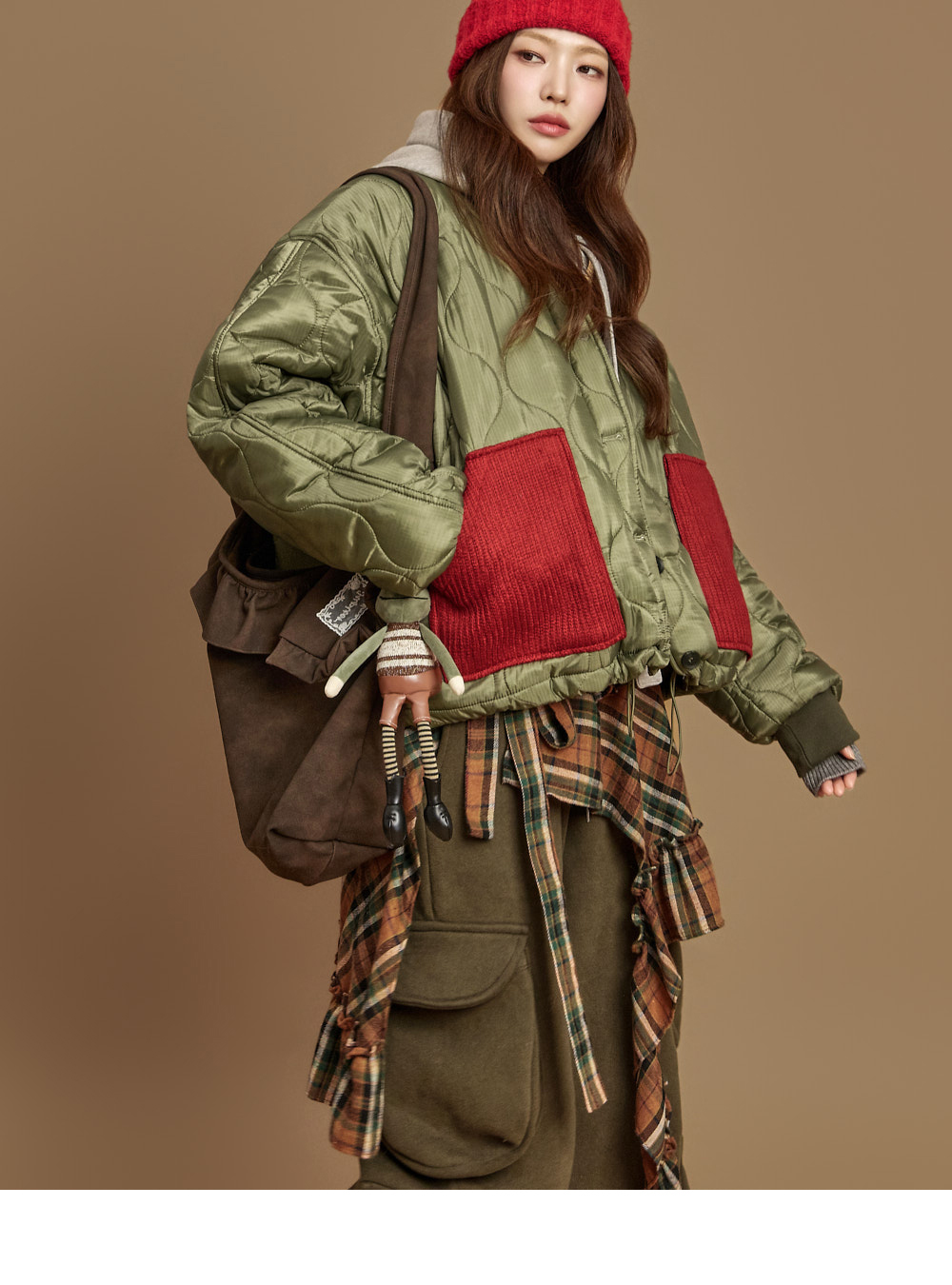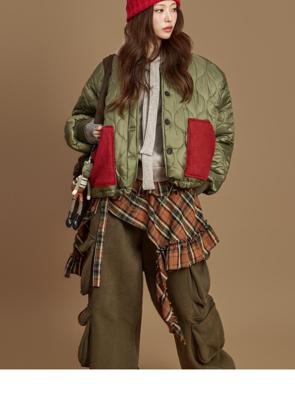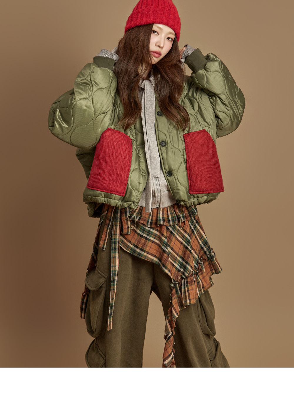 171CM 模特,ONE 尺码,卡其色穿着。
