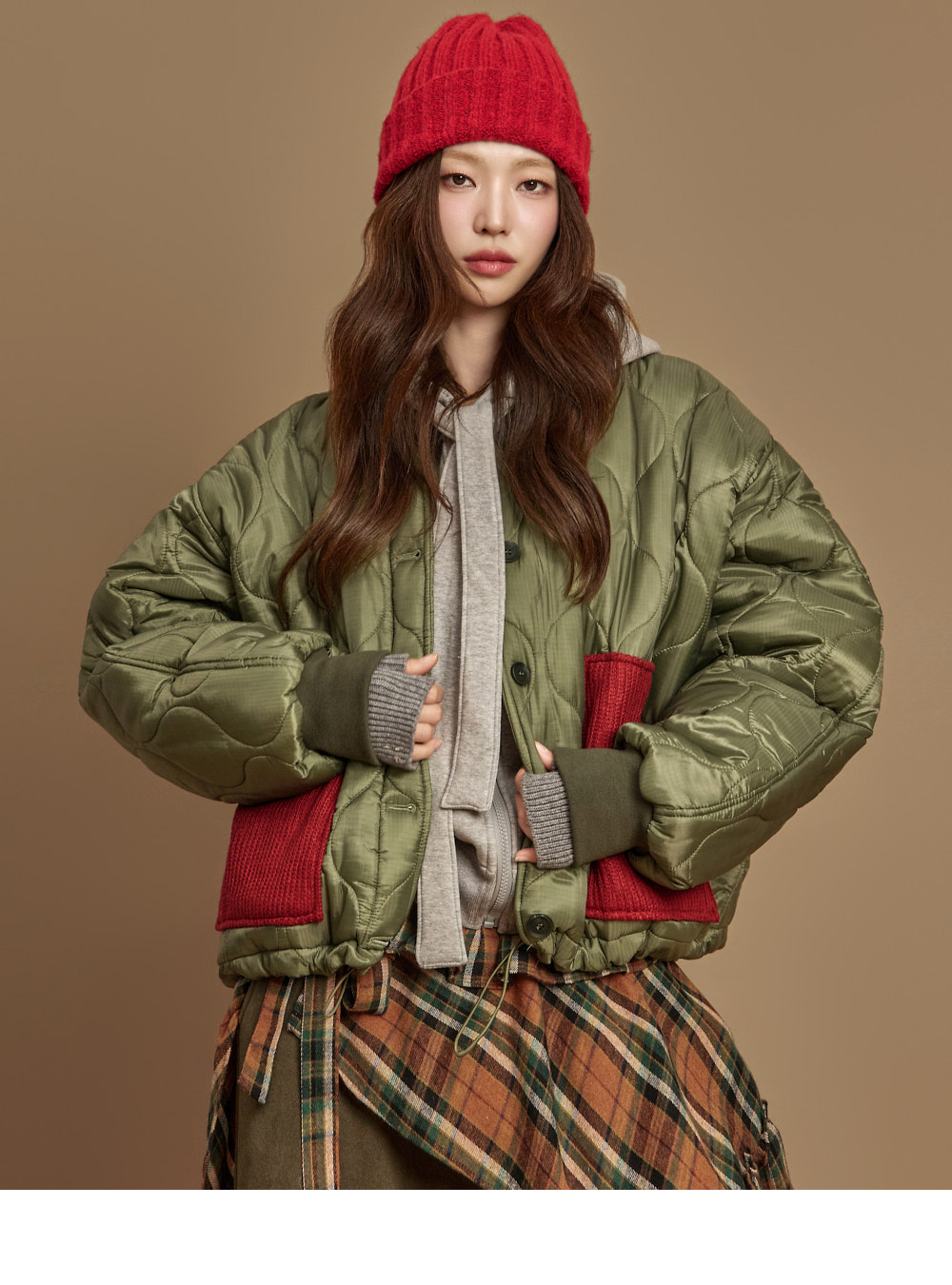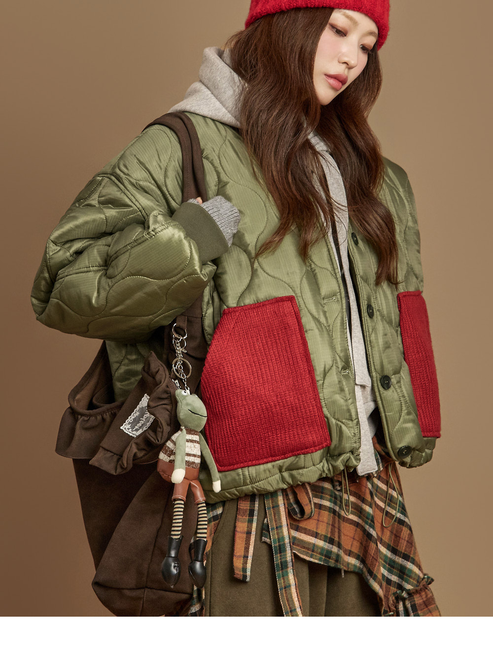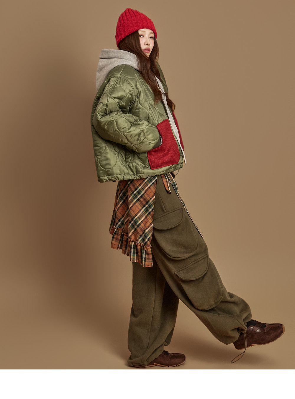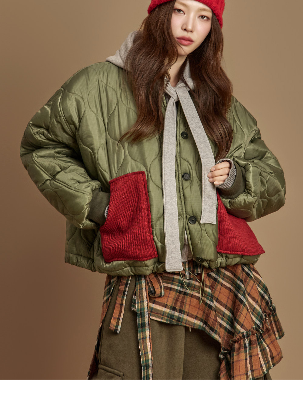 171CM 模特,ONE 尺码,卡其色穿着。