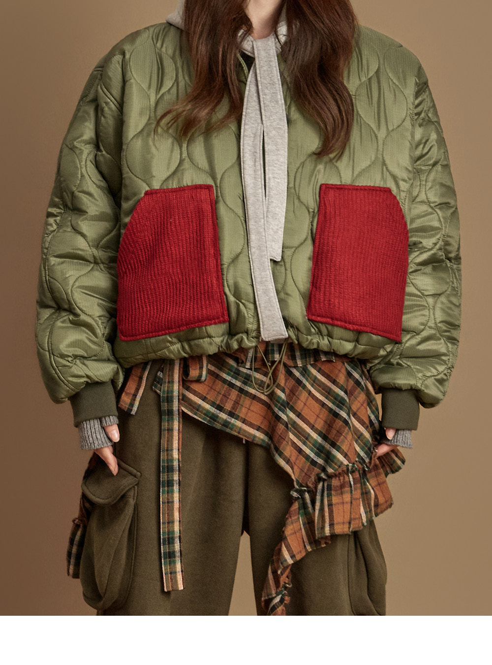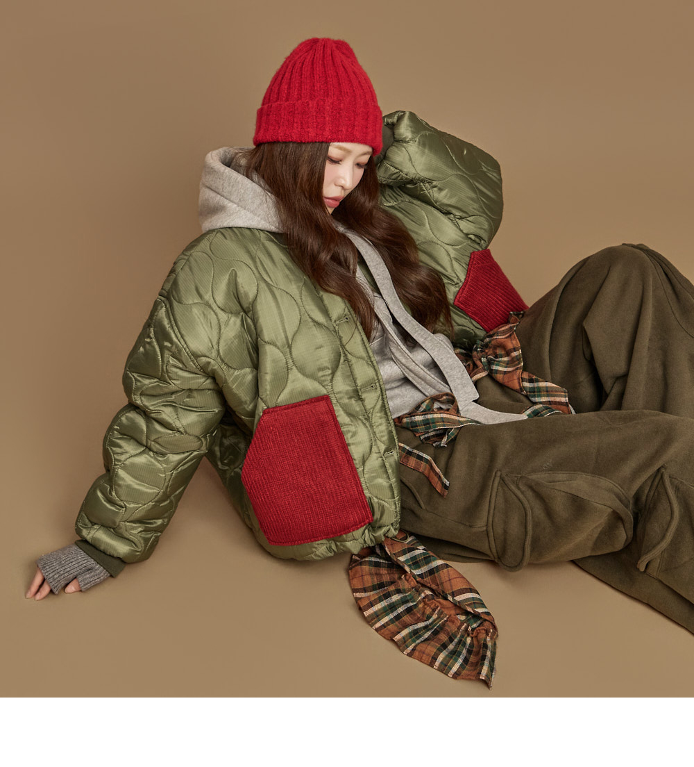 休闲氛围的口袋拼接绗缝外套。