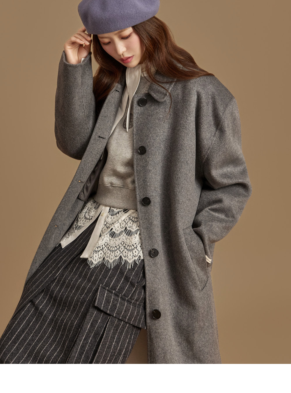 采用羊毛 80%、羊绒 10%、聚酯纤维 10% 混纺面料制作,