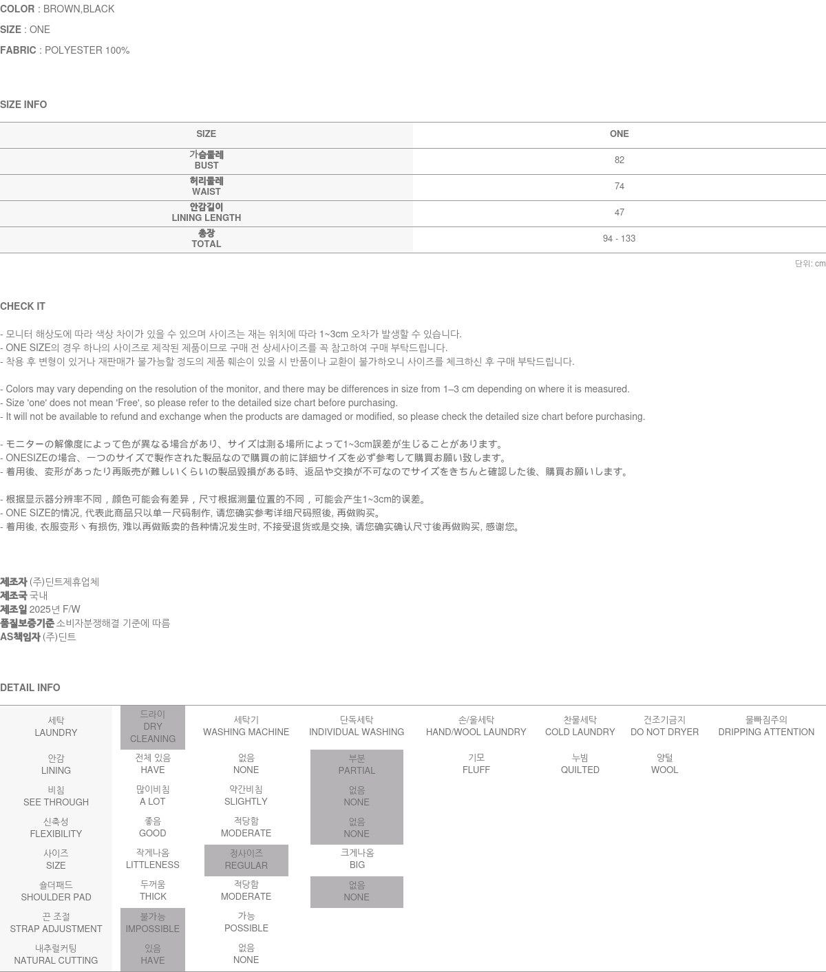 換貨 與 退貨 收到商品後, 7日內能在我的頁面申請交換或退貨, 申請後請將商品寄回DINT. 申請後, 請填寫包裹裡一同寄去的撤回申請書, 再將包裹包裝成一開始您收到時的狀態(包裝袋、衣架、贈品皆要一起寄送回來)發送至DINT即可. 因爲顧客變心所申請的換貨與退貨, 運費將由顧客負擔;誤送或是商品瑕疵的部分, 將由DINT負擔運費. 退貨住所爲:首爾市 衿川區 加山洞 459-8號 大韓通運 7樓 DINT股份有限公司 品質保證標準說明:符合電子商務等有關消費者保護法律規定的消費者可申請交換或是退貨.