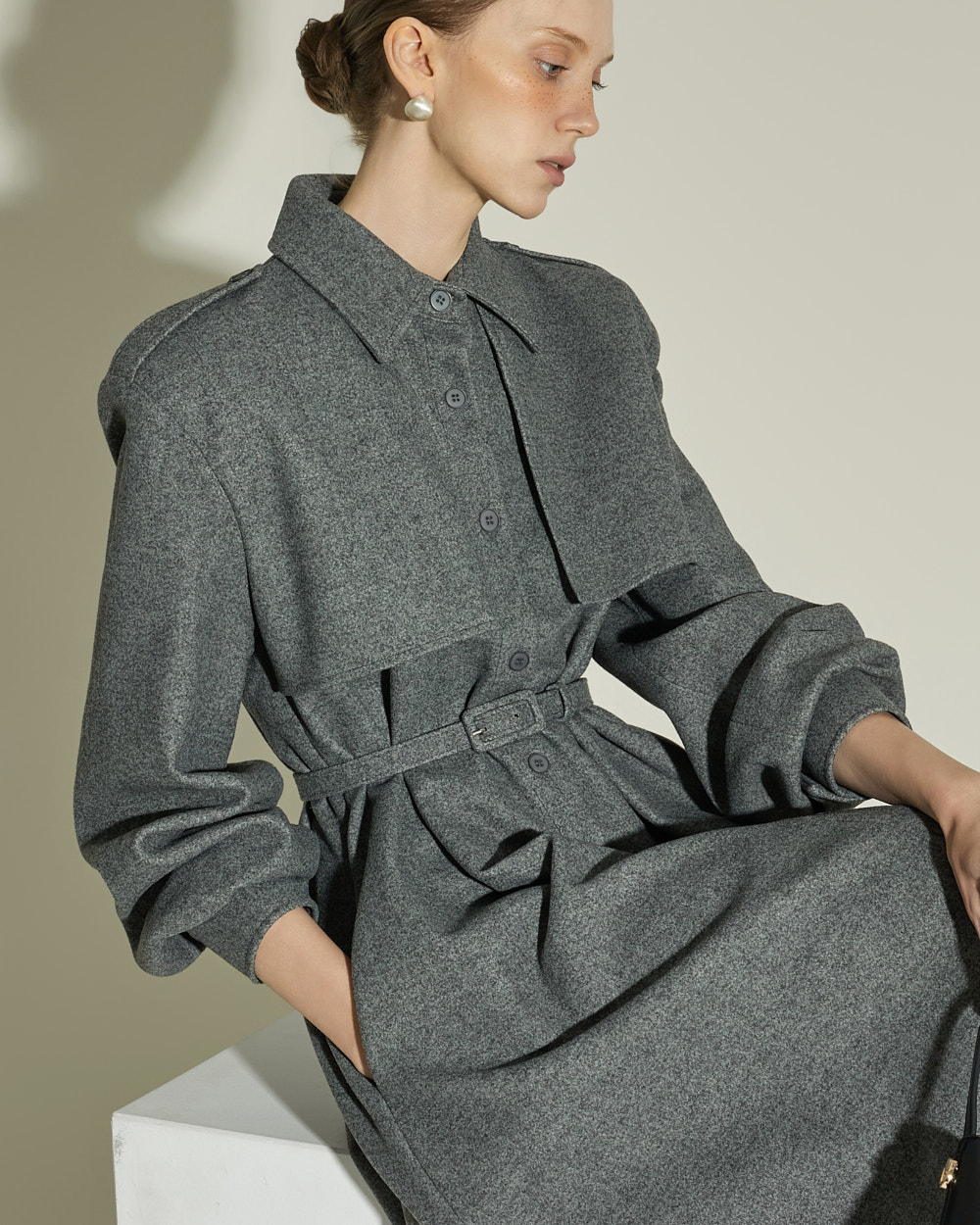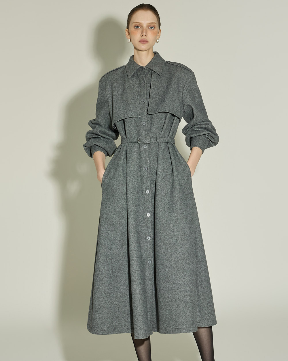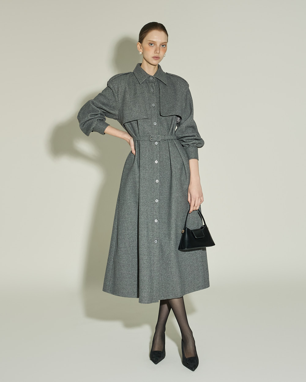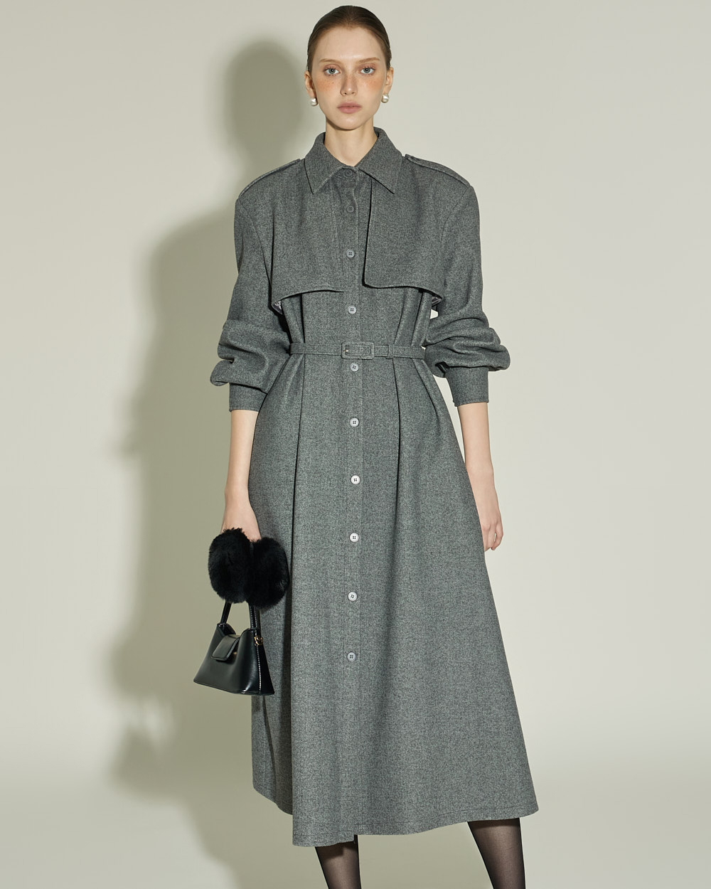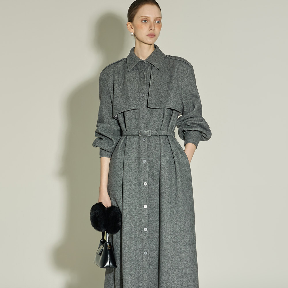 这是一款带有优雅氛围的腰带套装风衣连衣裙。