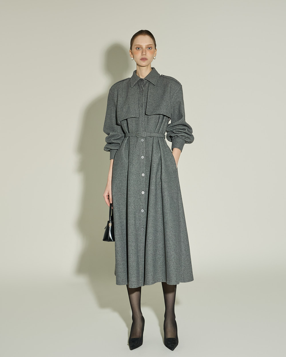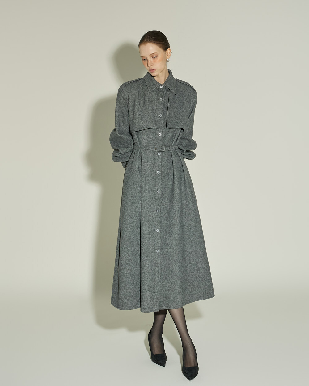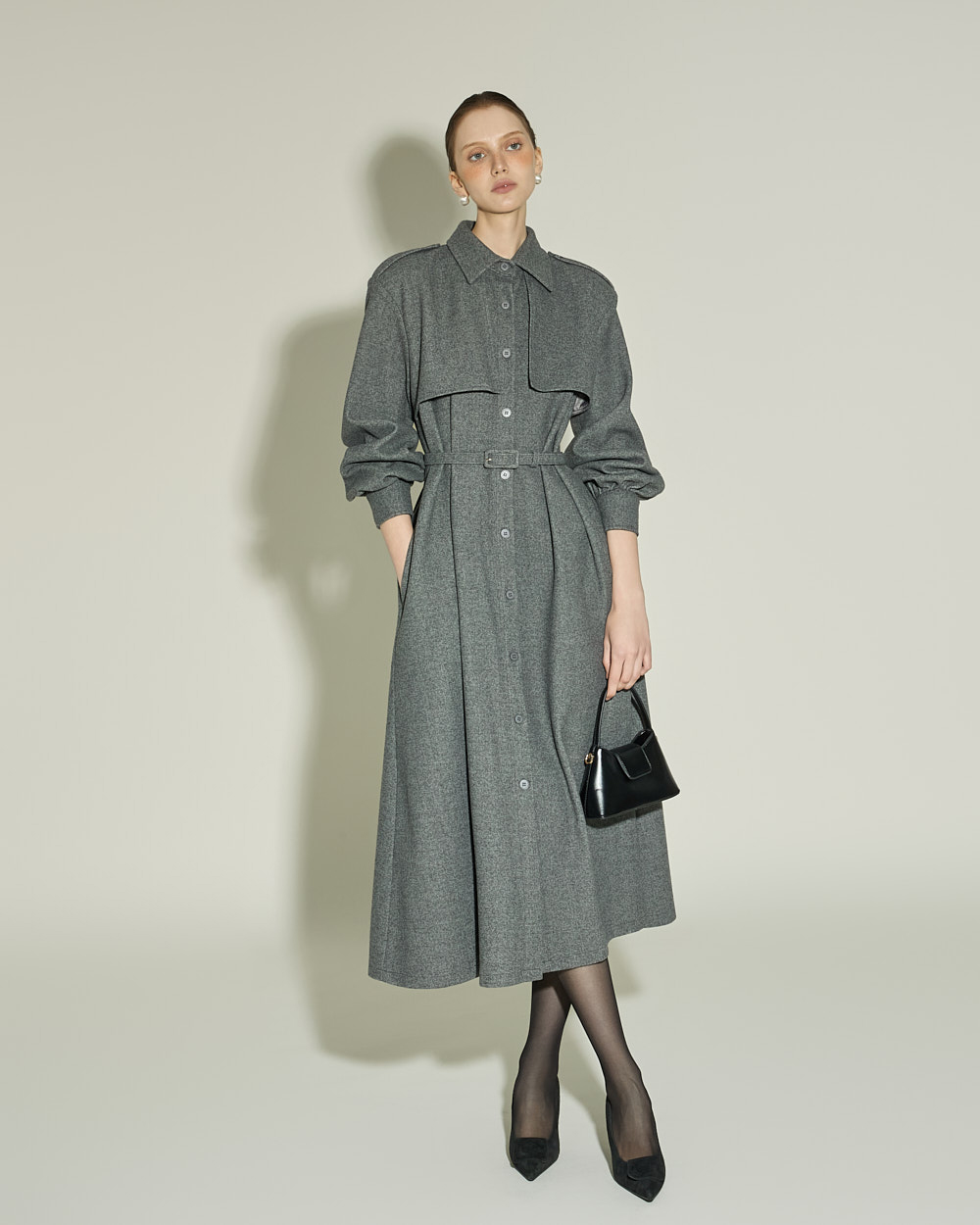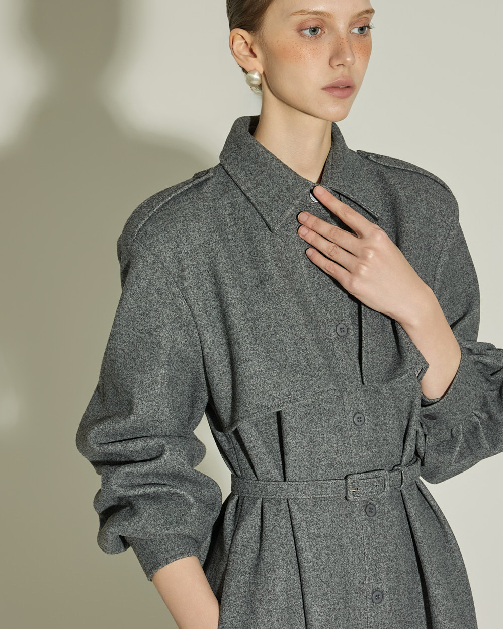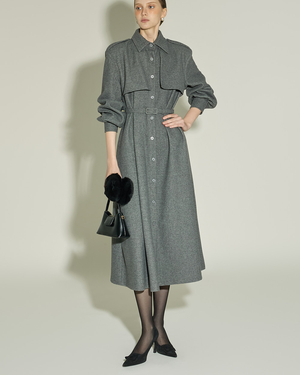 这是一款带有优雅氛围的腰带套装风衣连衣裙。