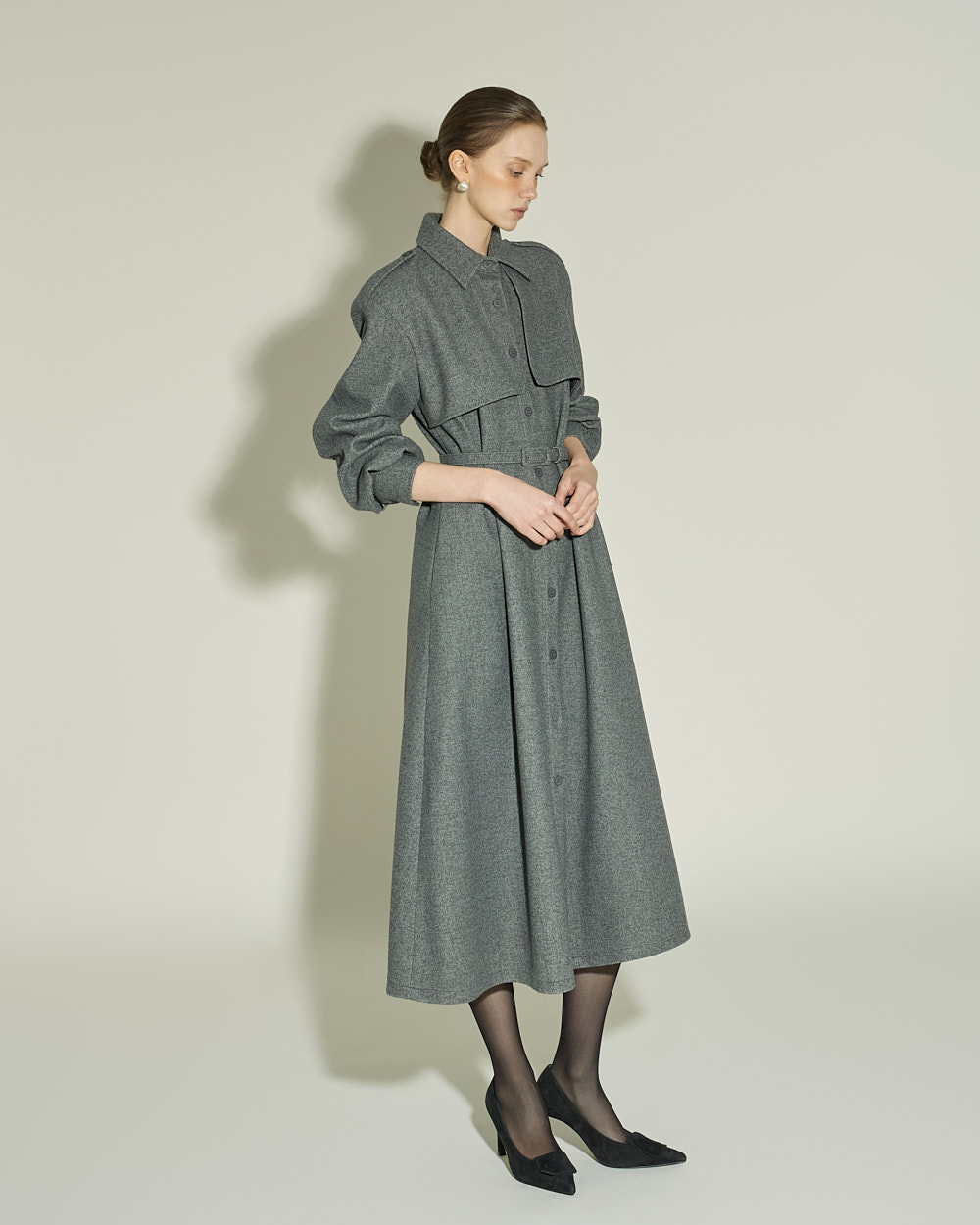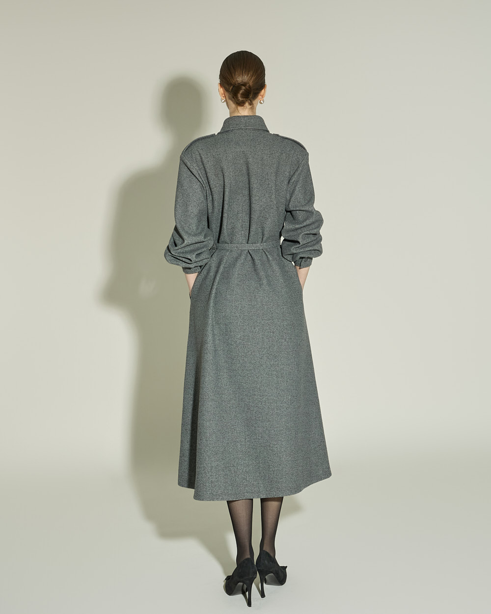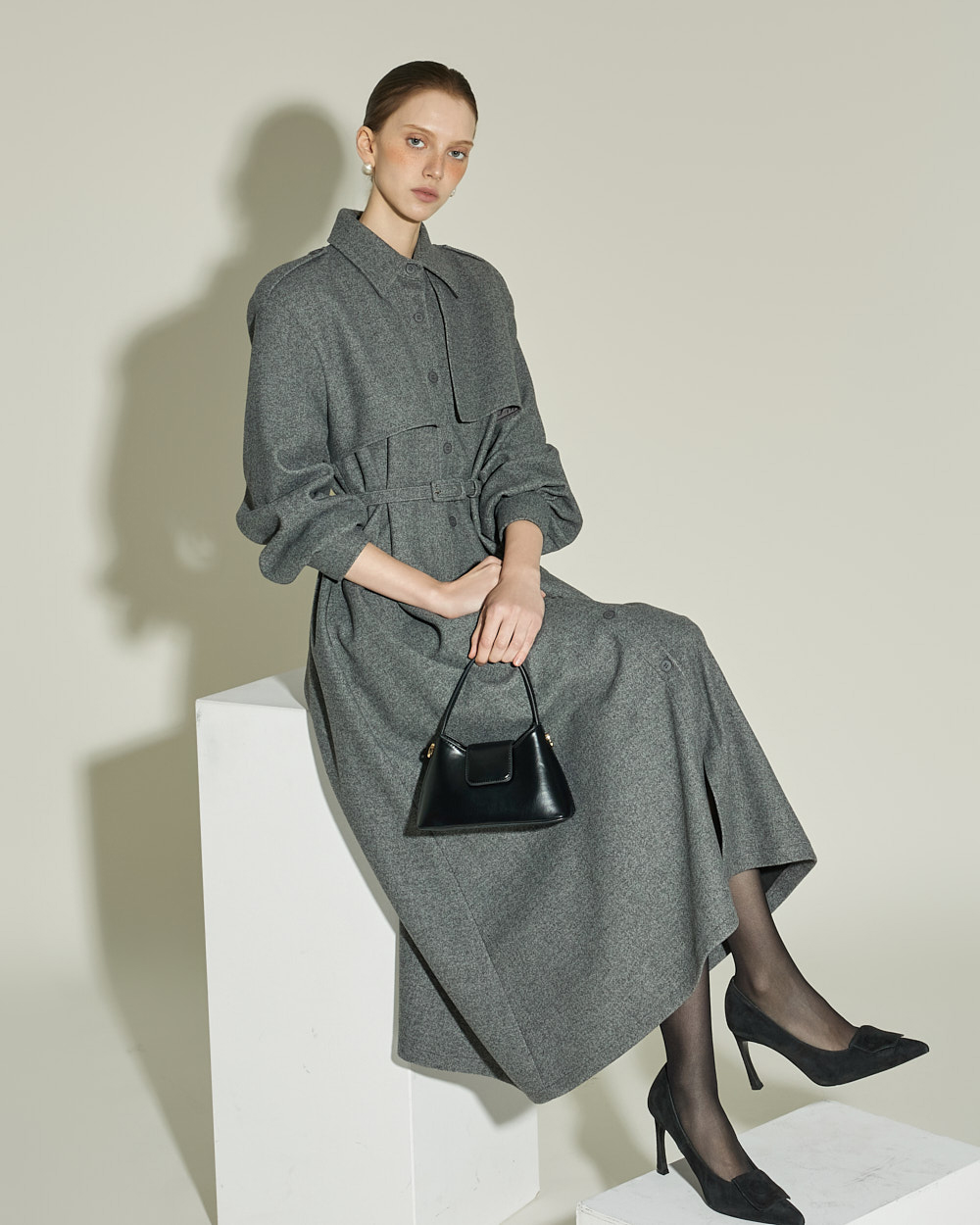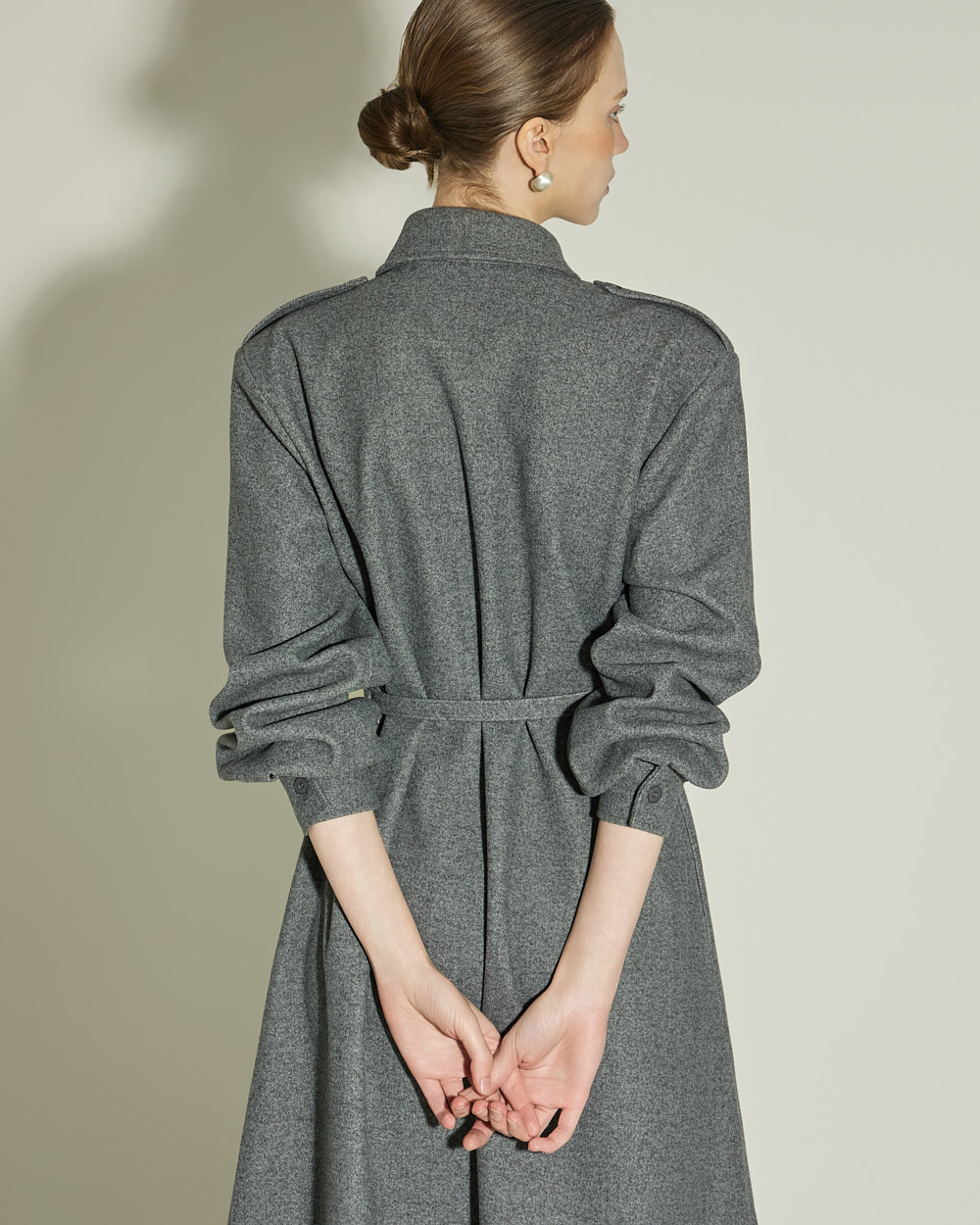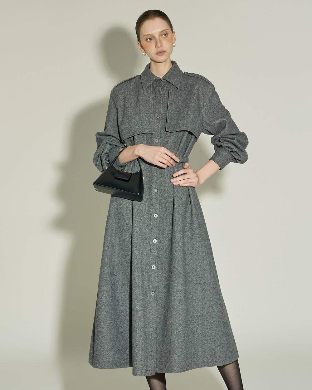 这是一款带有优雅氛围的腰带套装风衣连衣裙。