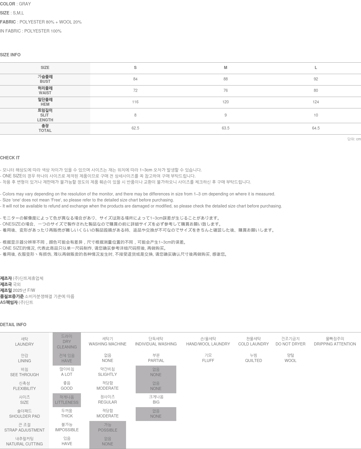 171CM 모델 S 사이즈, GRAY 컬러 착용하였습니다.