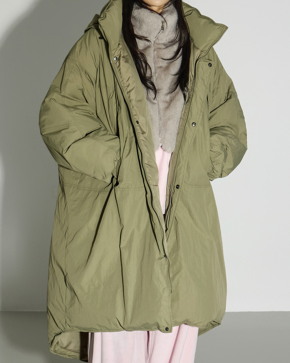 这是一款具有休闲氛围的鸭绒长款羽绒外套。
