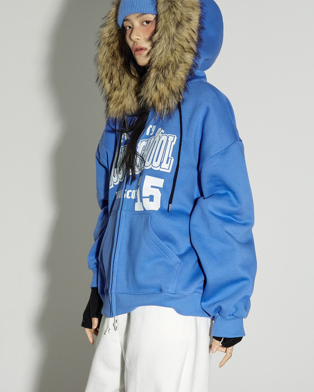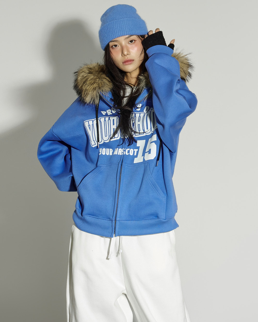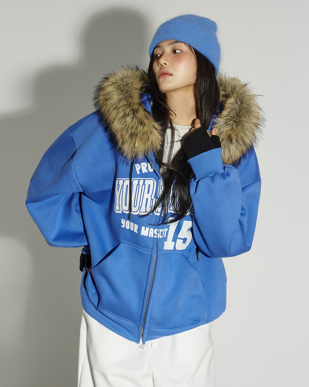 这是一款休闲风格的貉子毛抓绒连帽拉链外套。