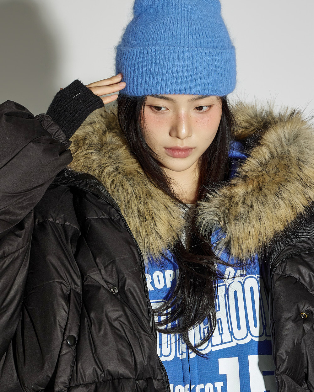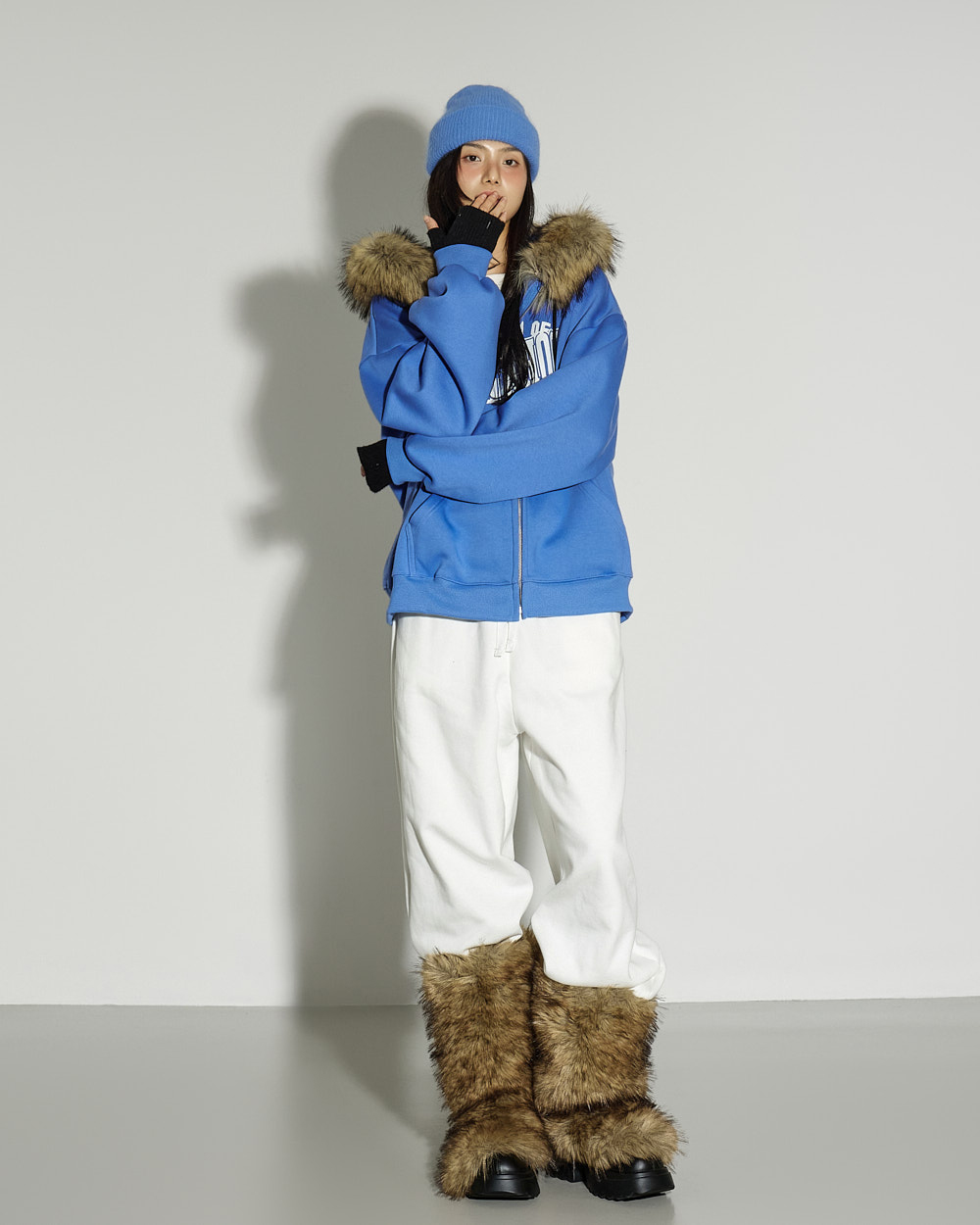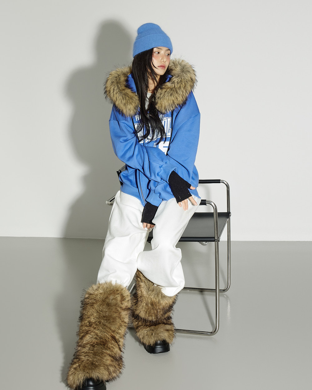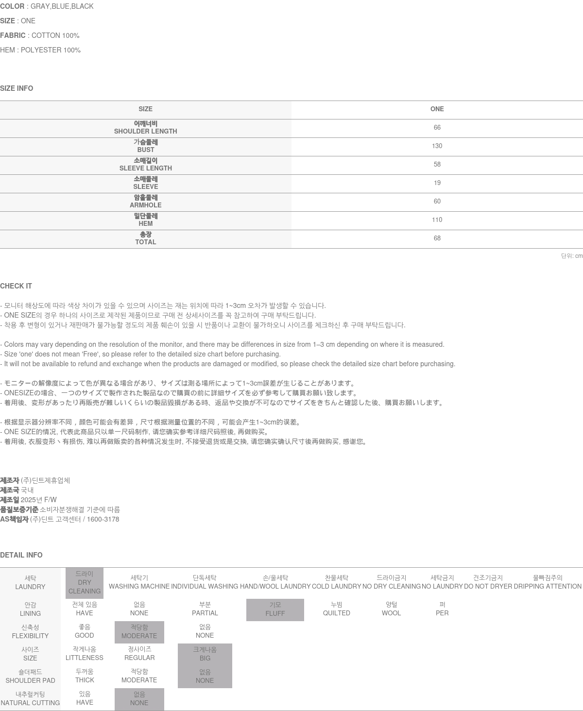模特身高 171CM,穿着 ONE SIZE,颜色为 BLUE。