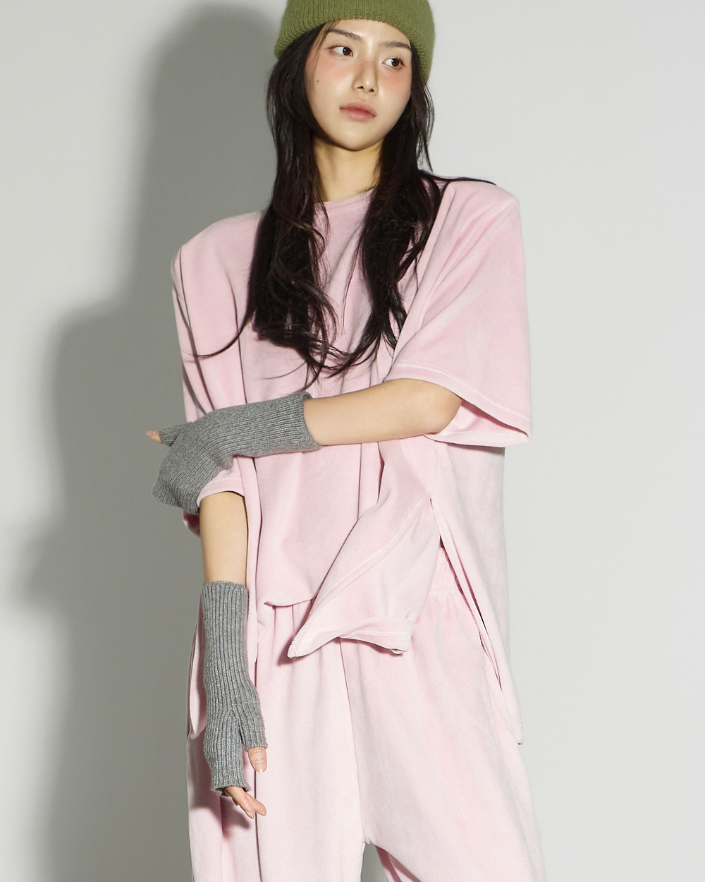 这是一款充满休闲氛围的天鹅绒垫肩上衣。