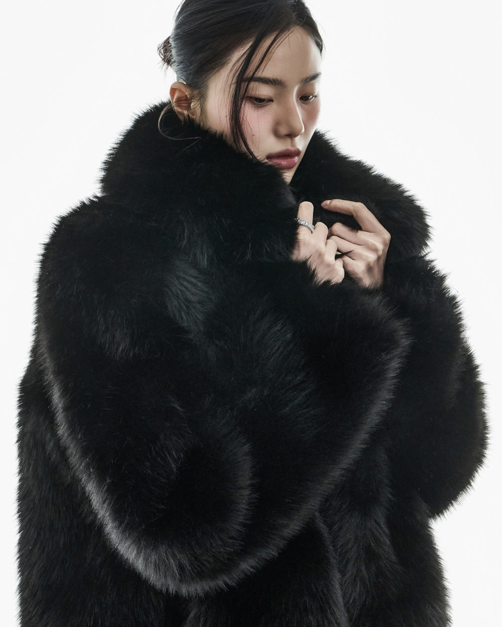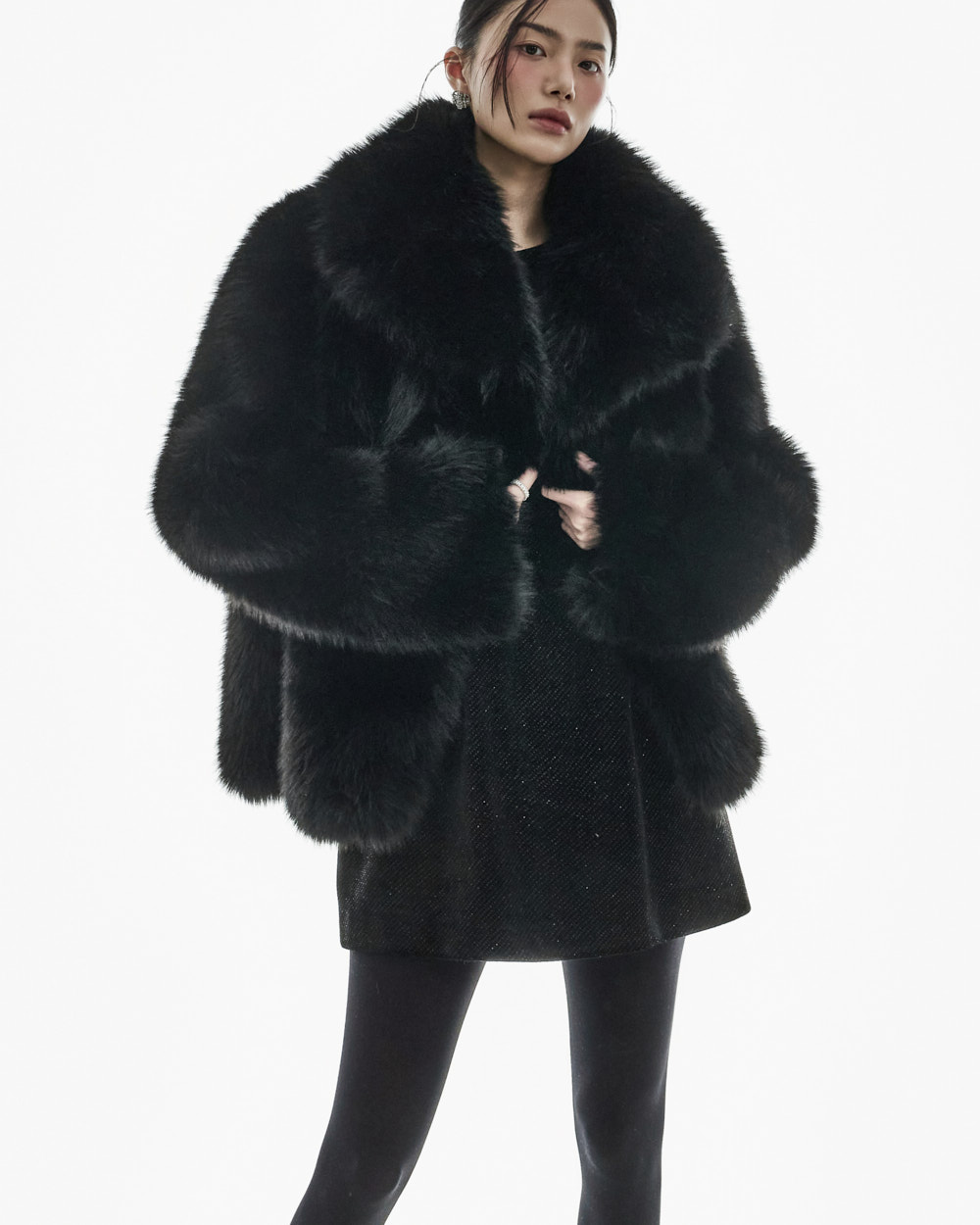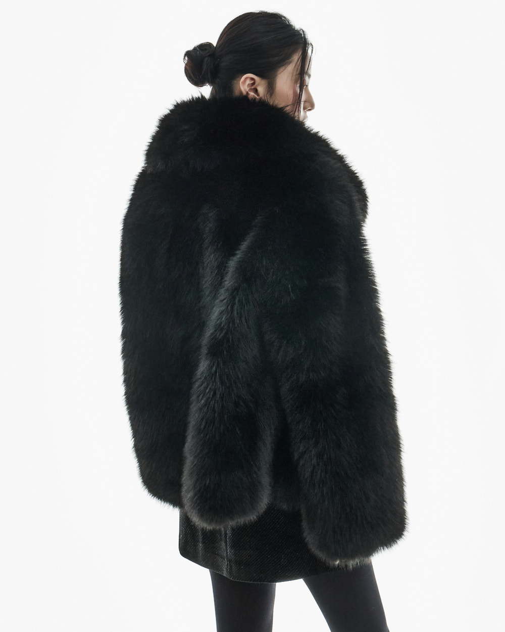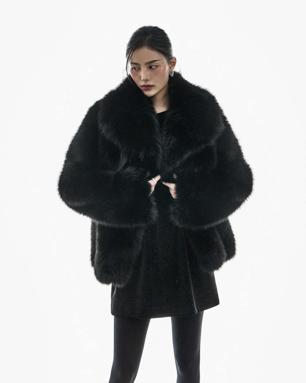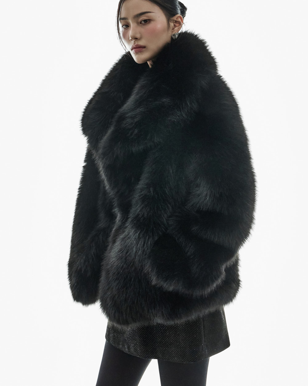 这是一款呈现极简氛围的大翻领毛绒外套,