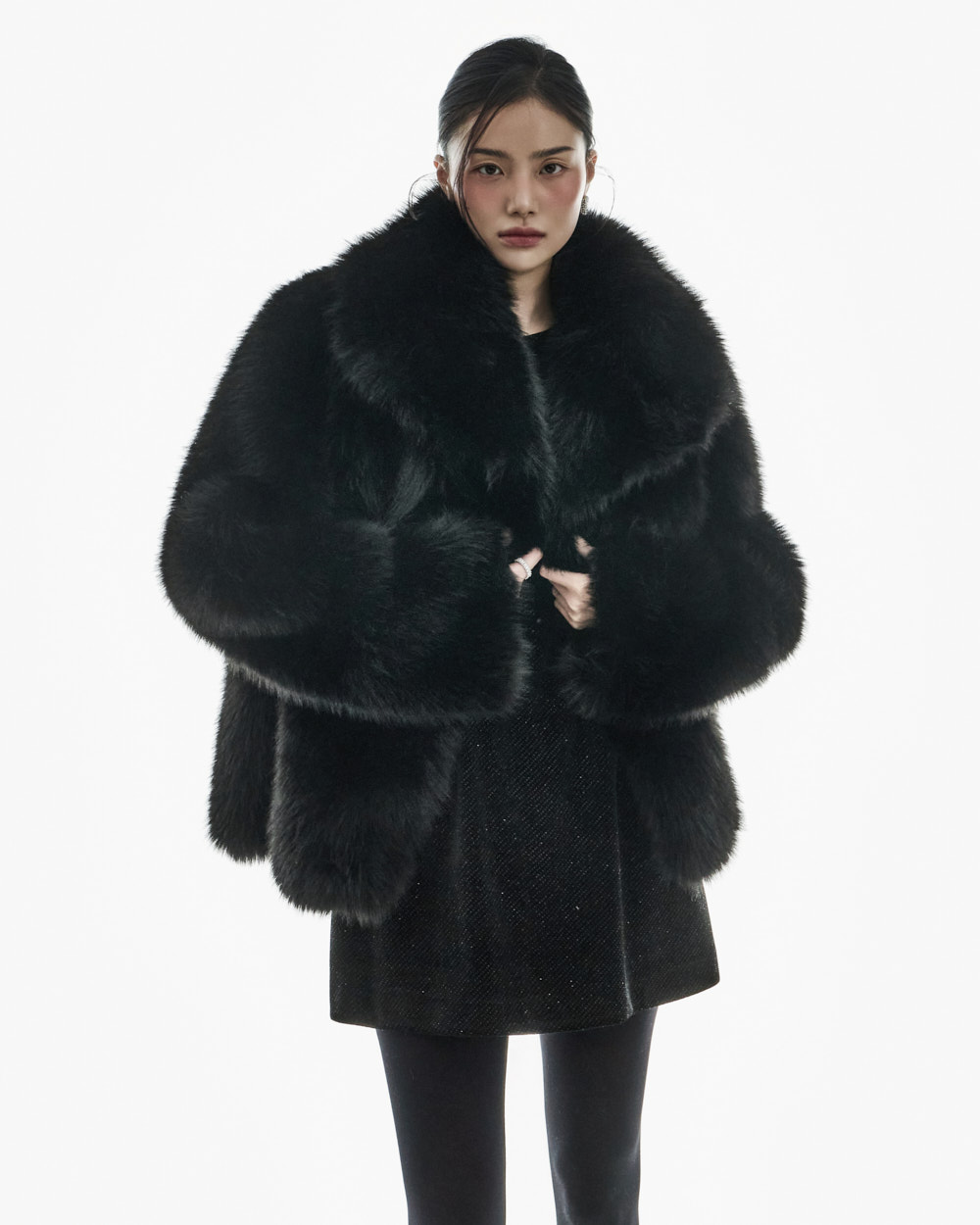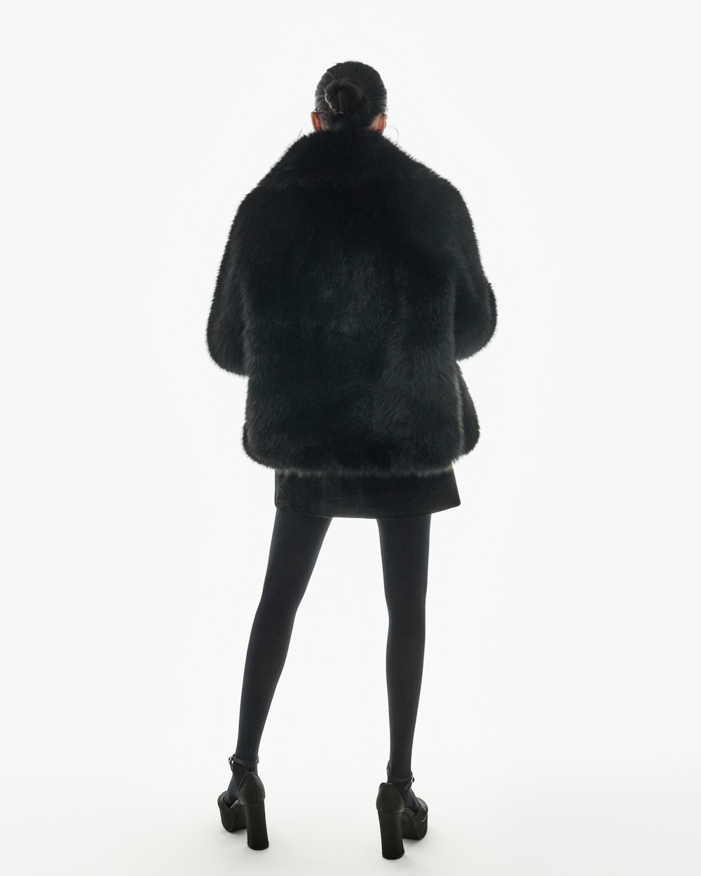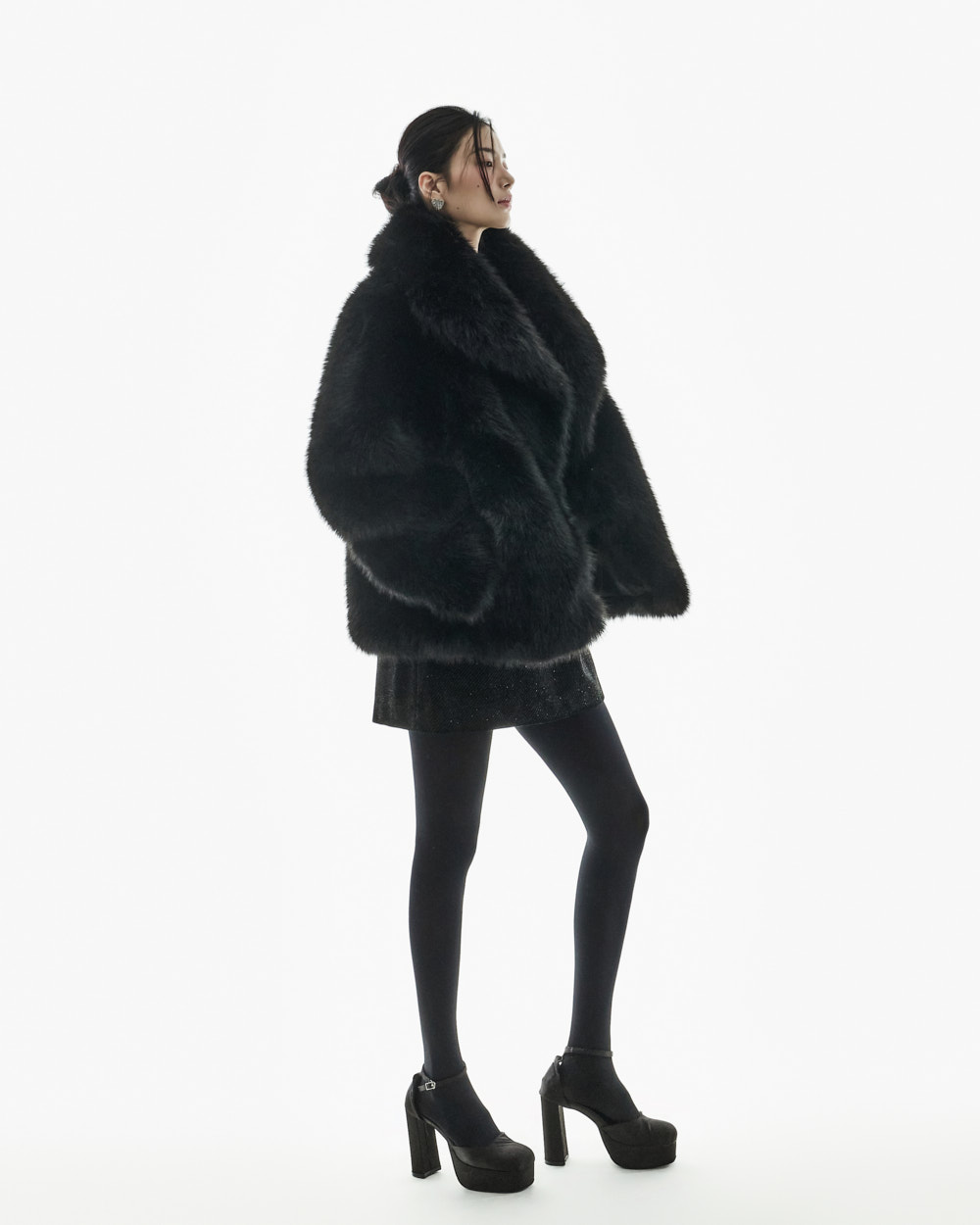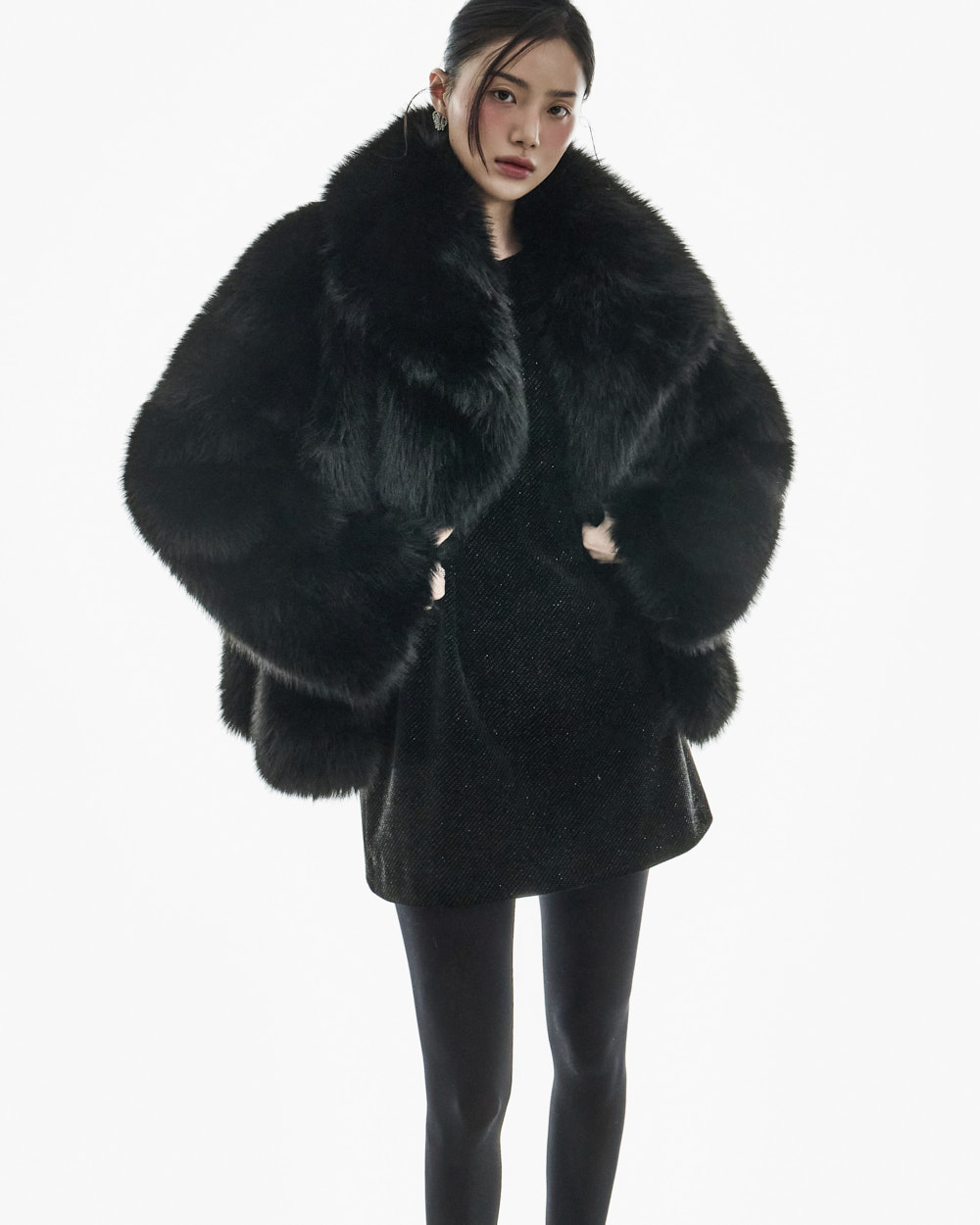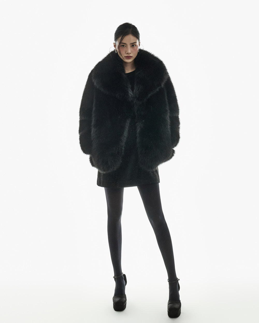 这是一款呈现极简氛围的大翻领毛绒外套,
