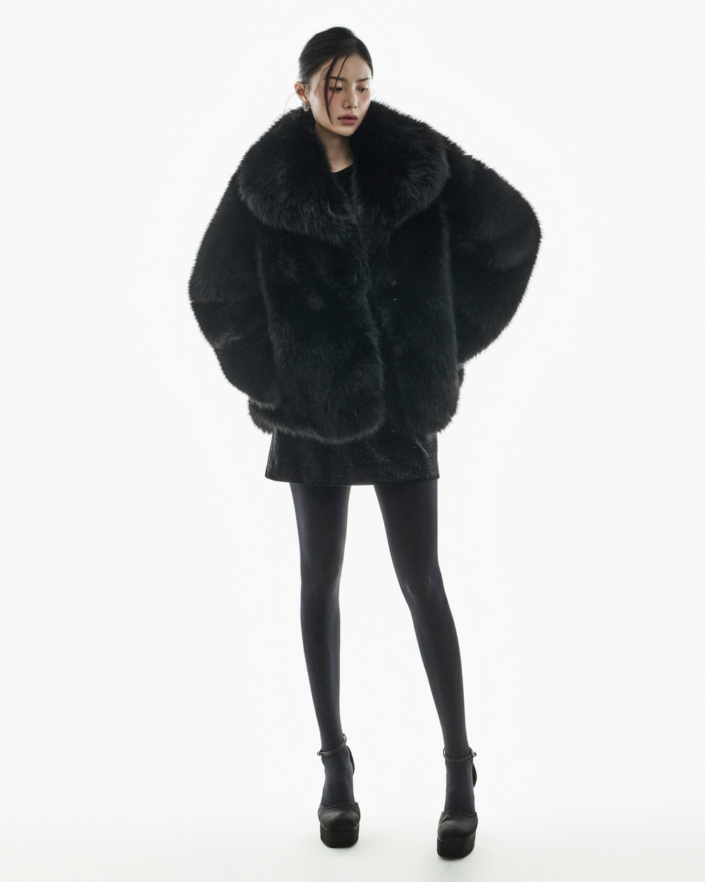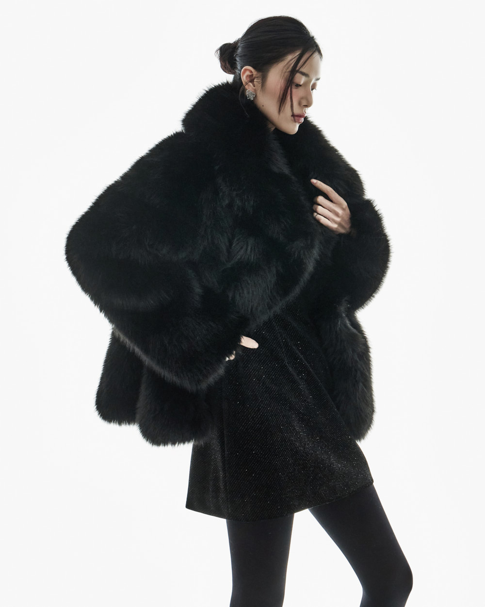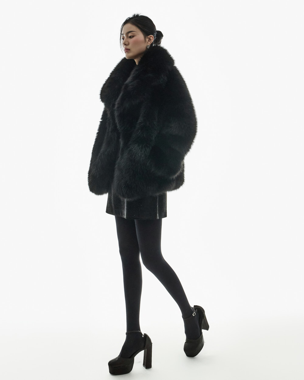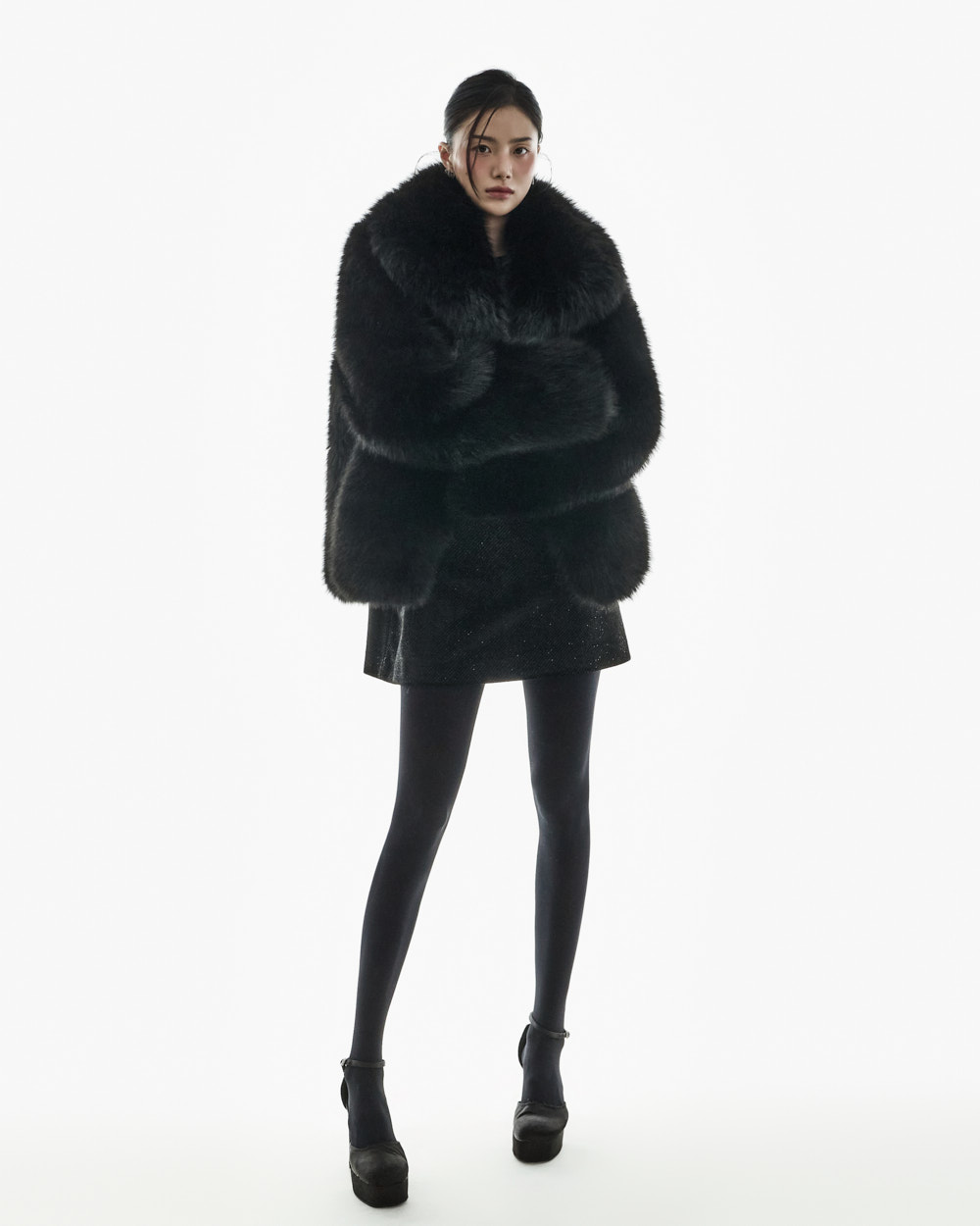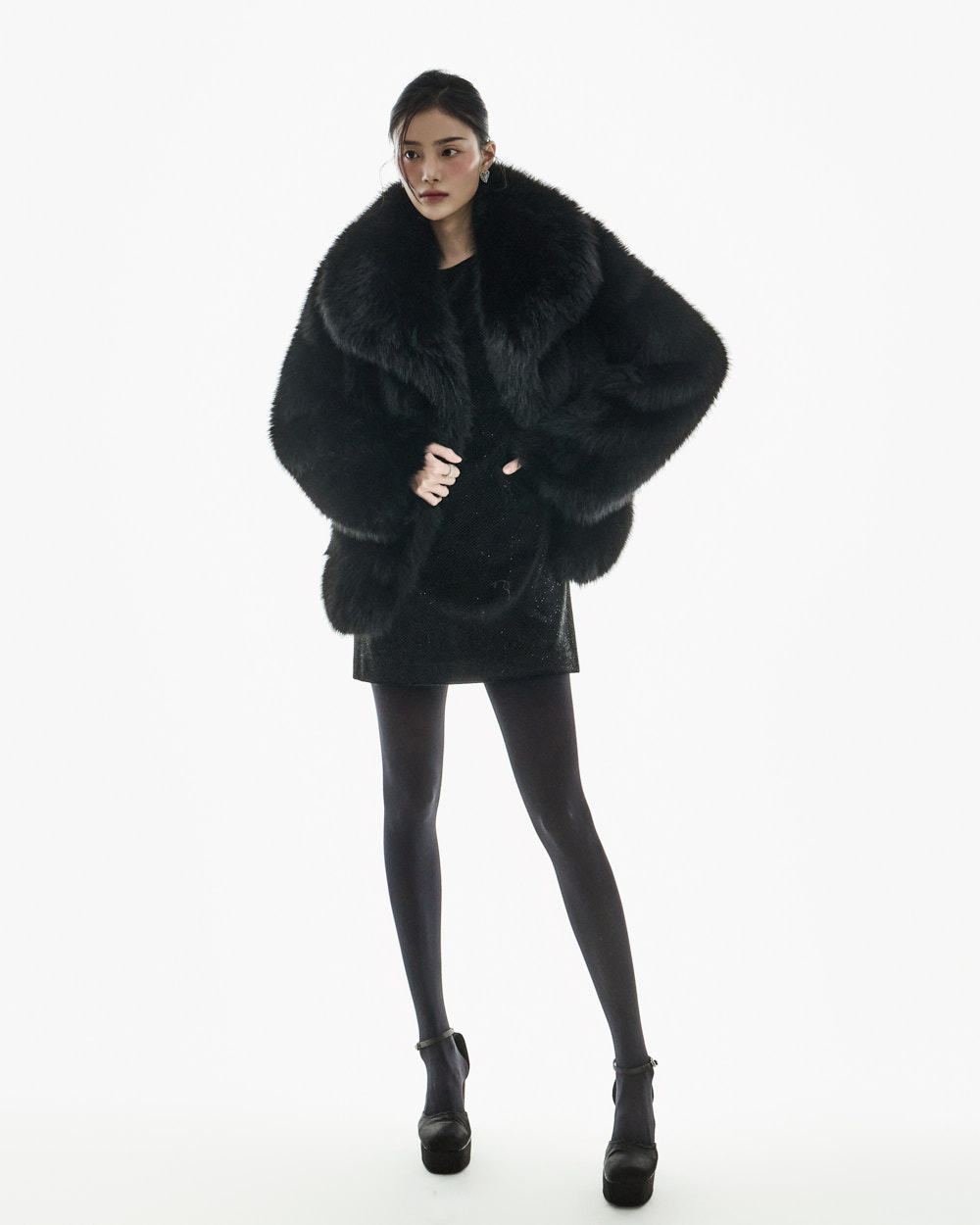 这是一款呈现极简氛围的大翻领毛绒外套,