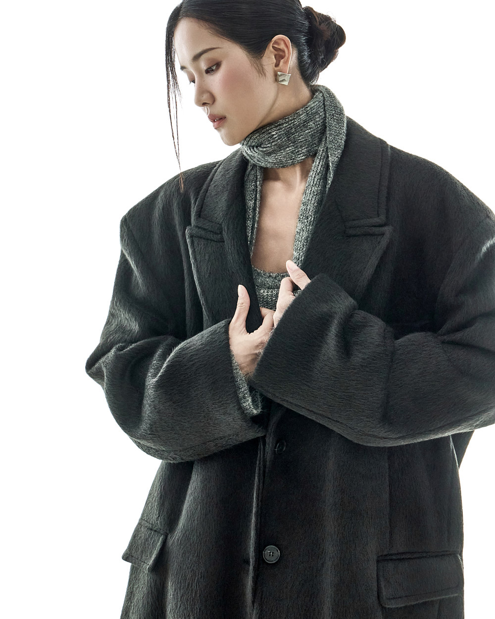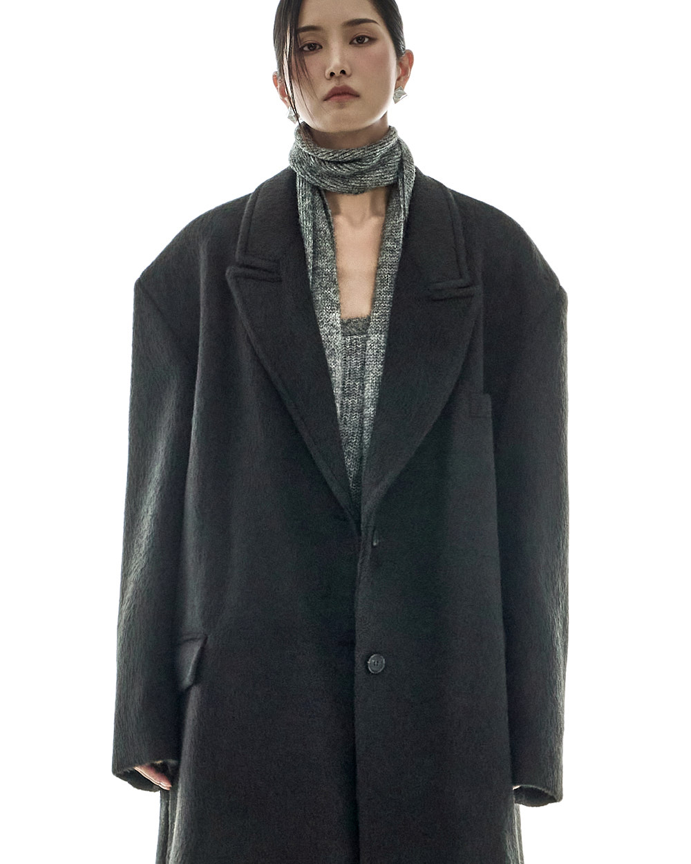 西装领设计和肩垫加持的宽松版型,