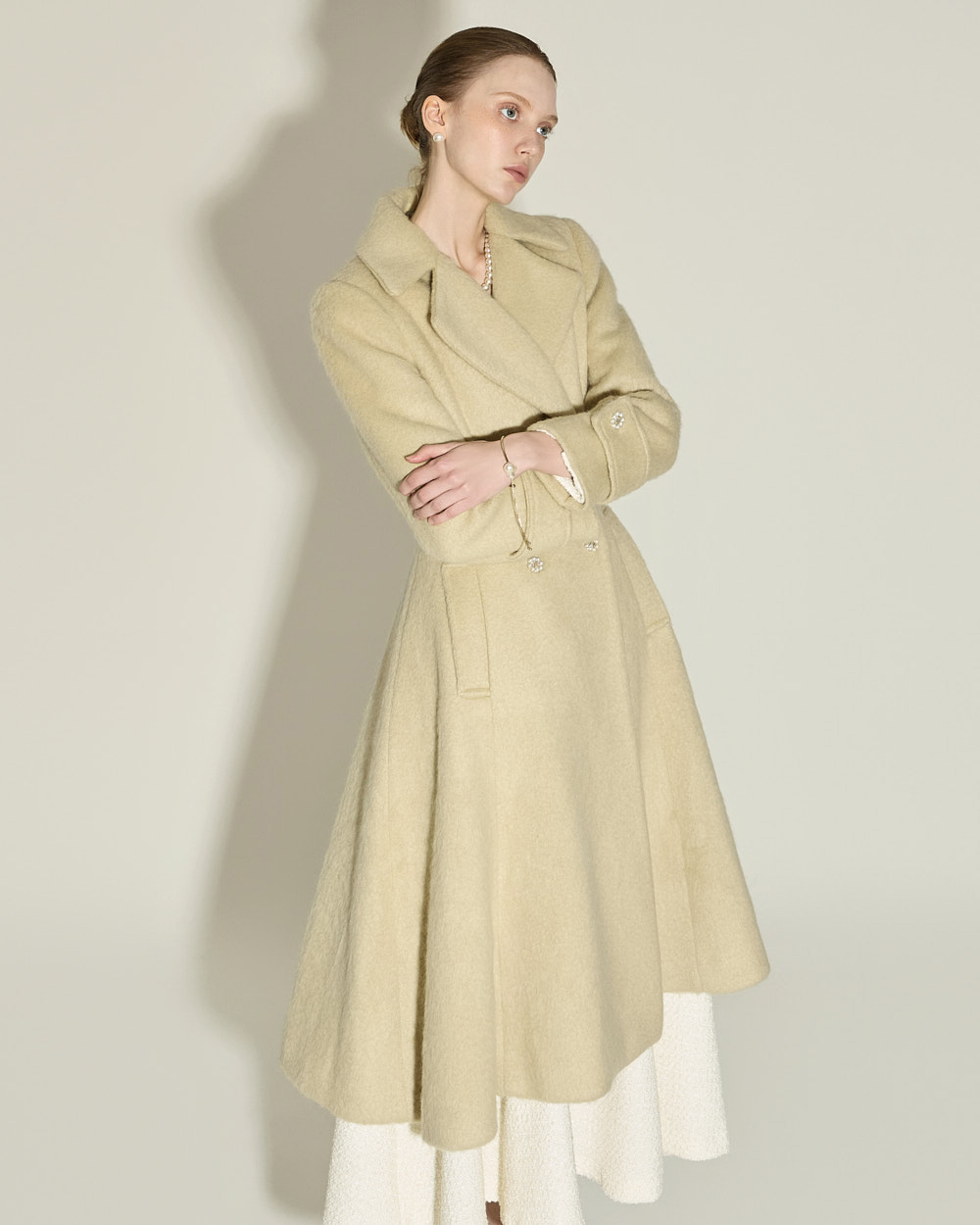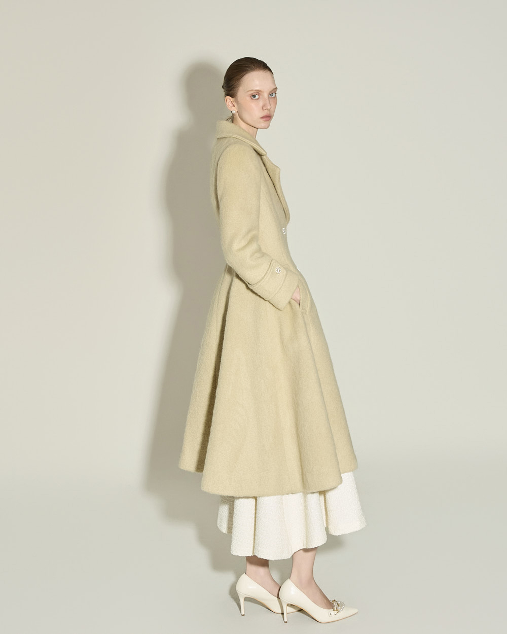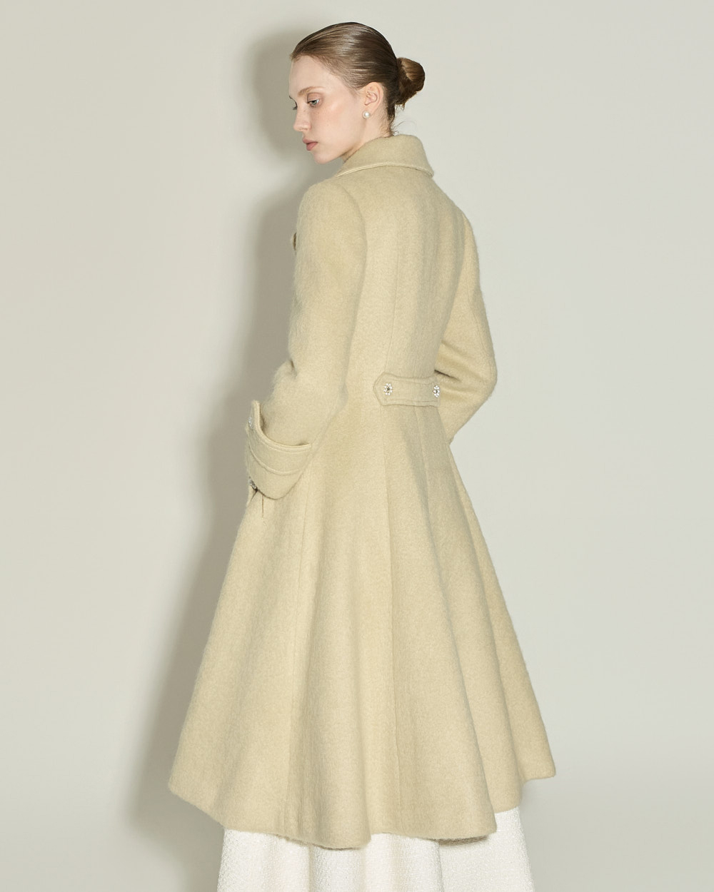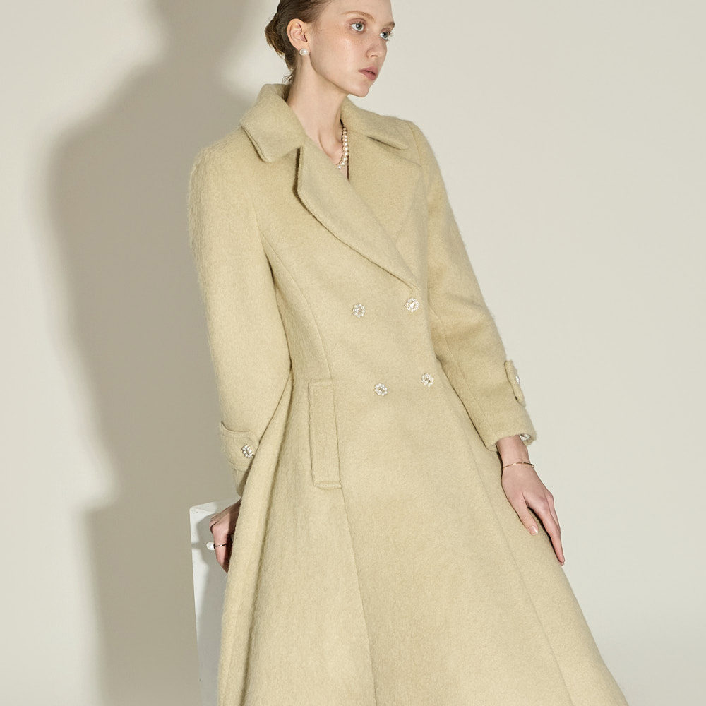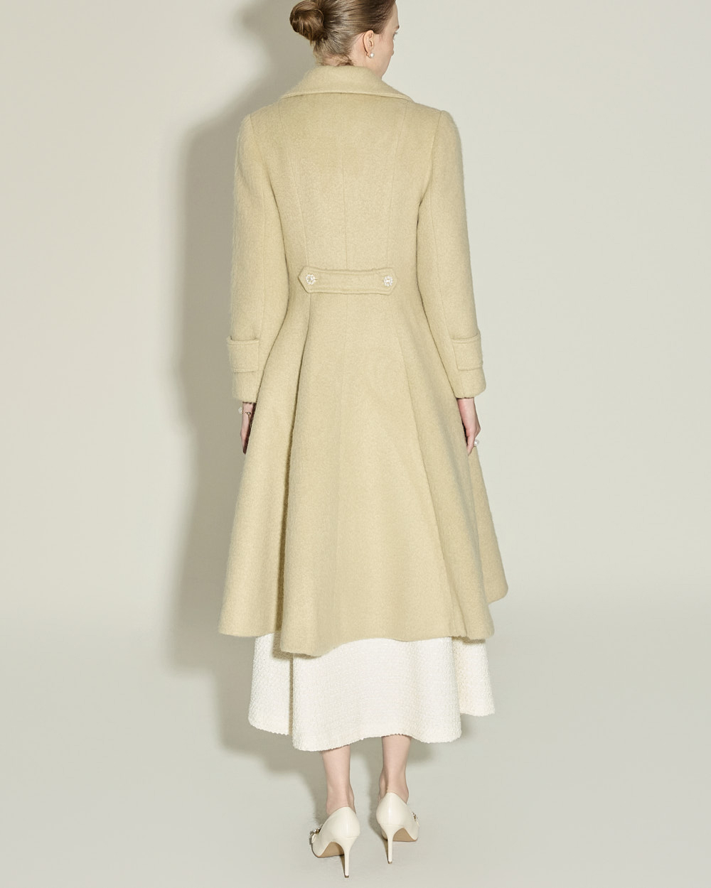 充满女性魅力的喇叭型羊毛大衣。
