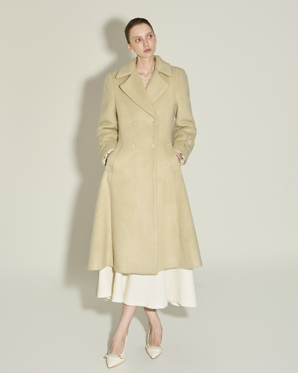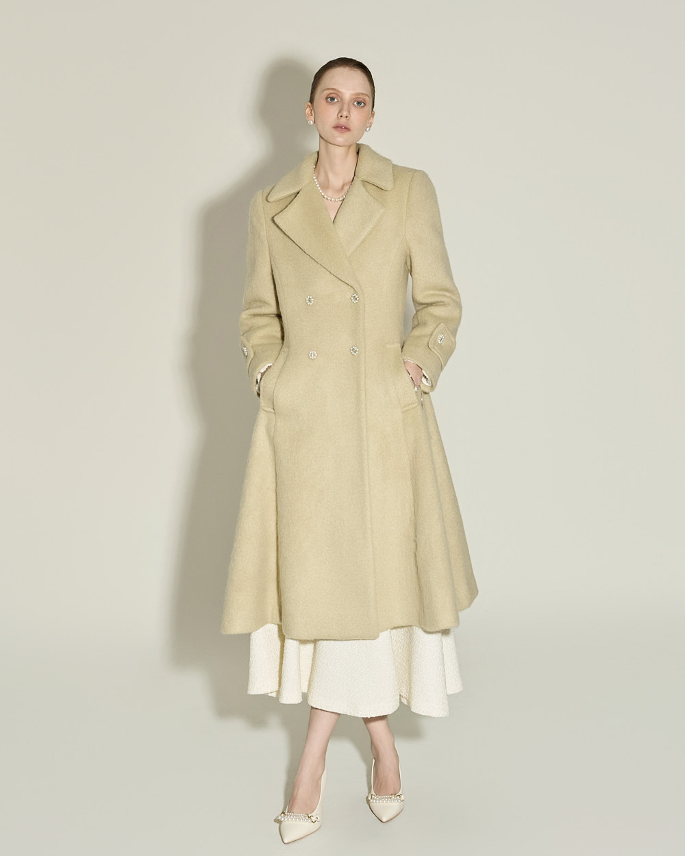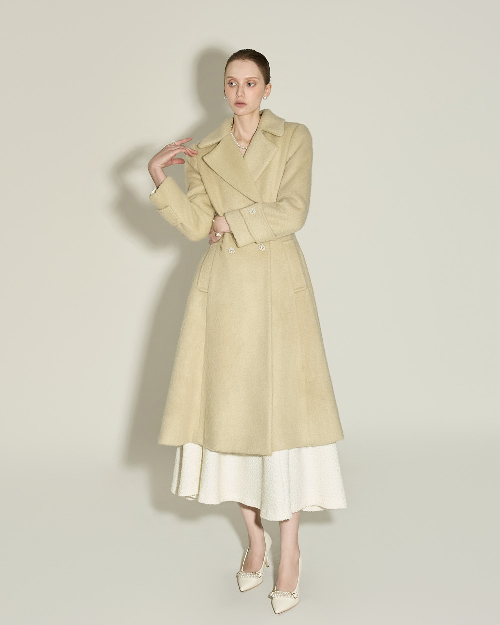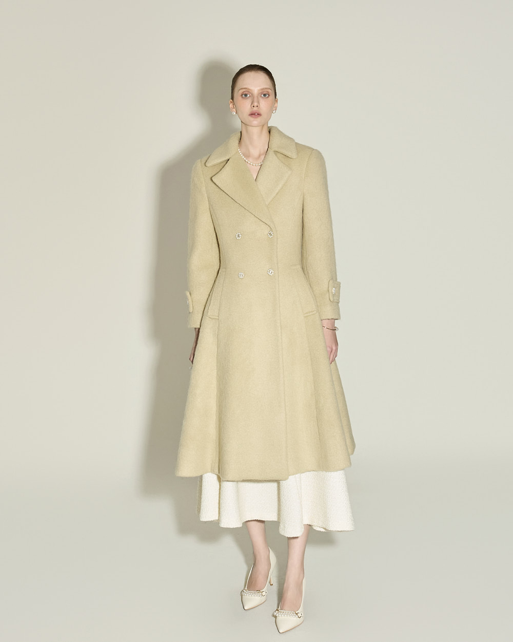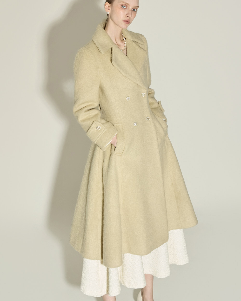 充满女性魅力的喇叭型羊毛大衣。