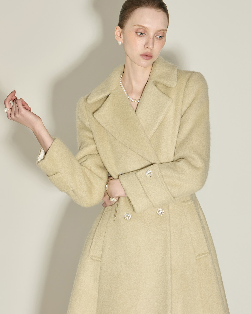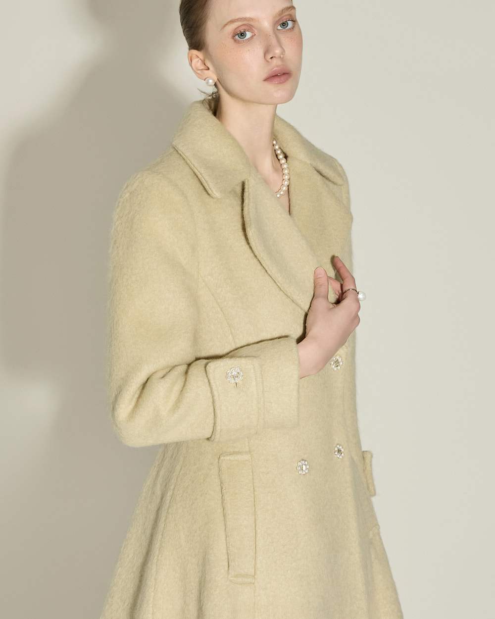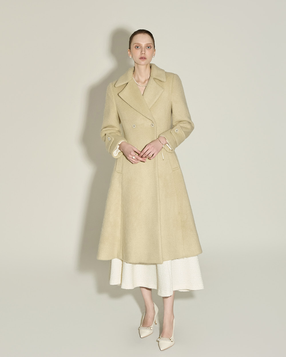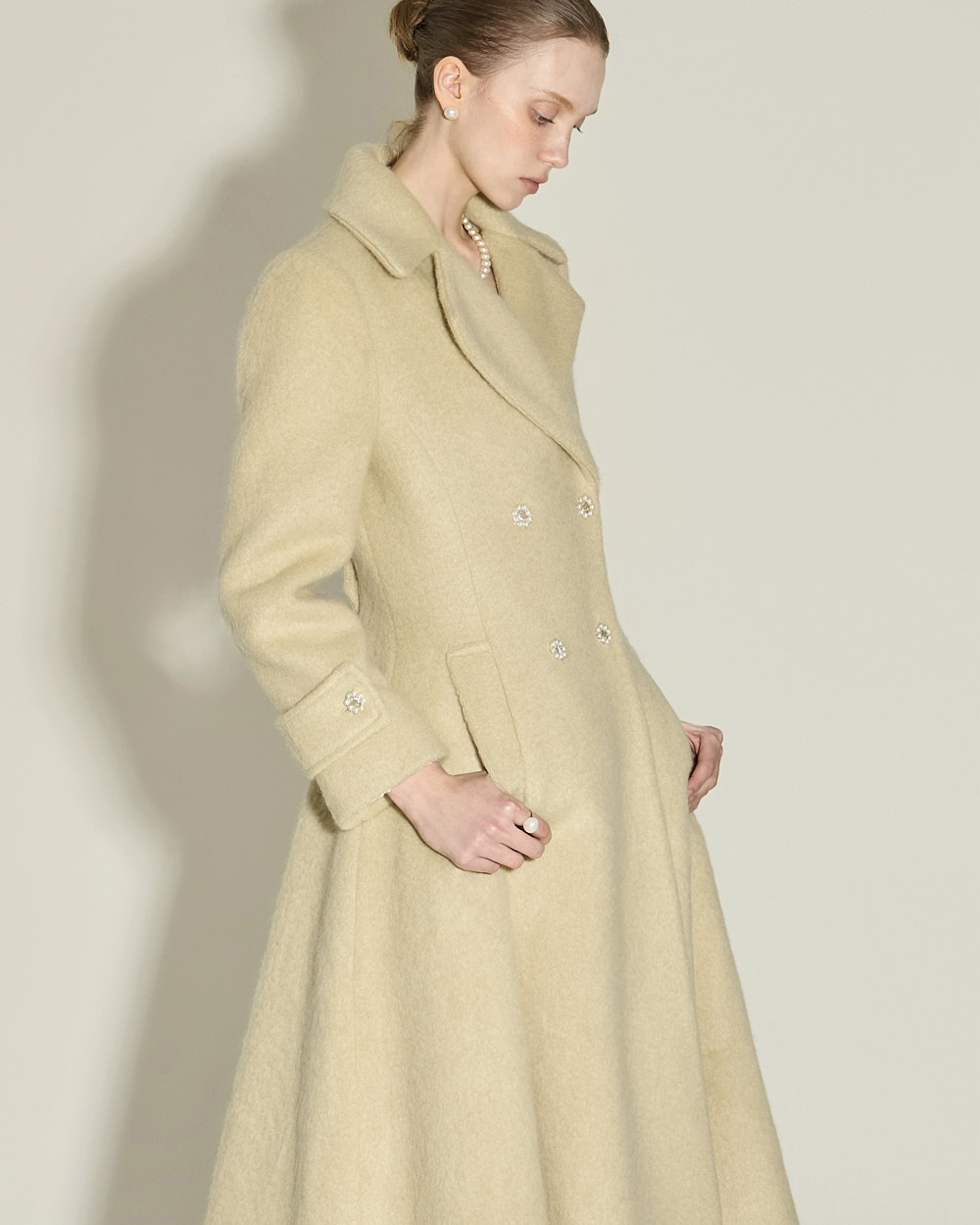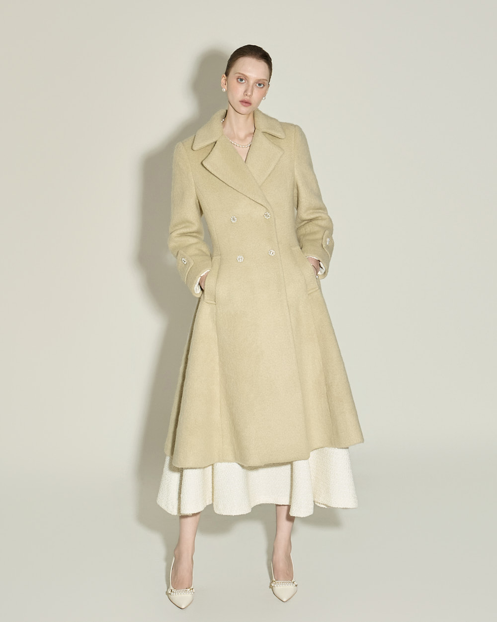 充满女性魅力的喇叭型羊毛大衣。