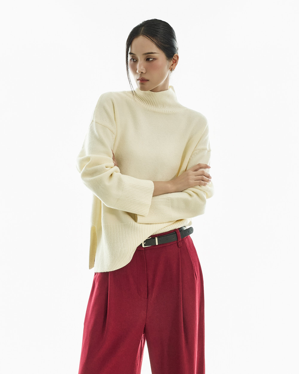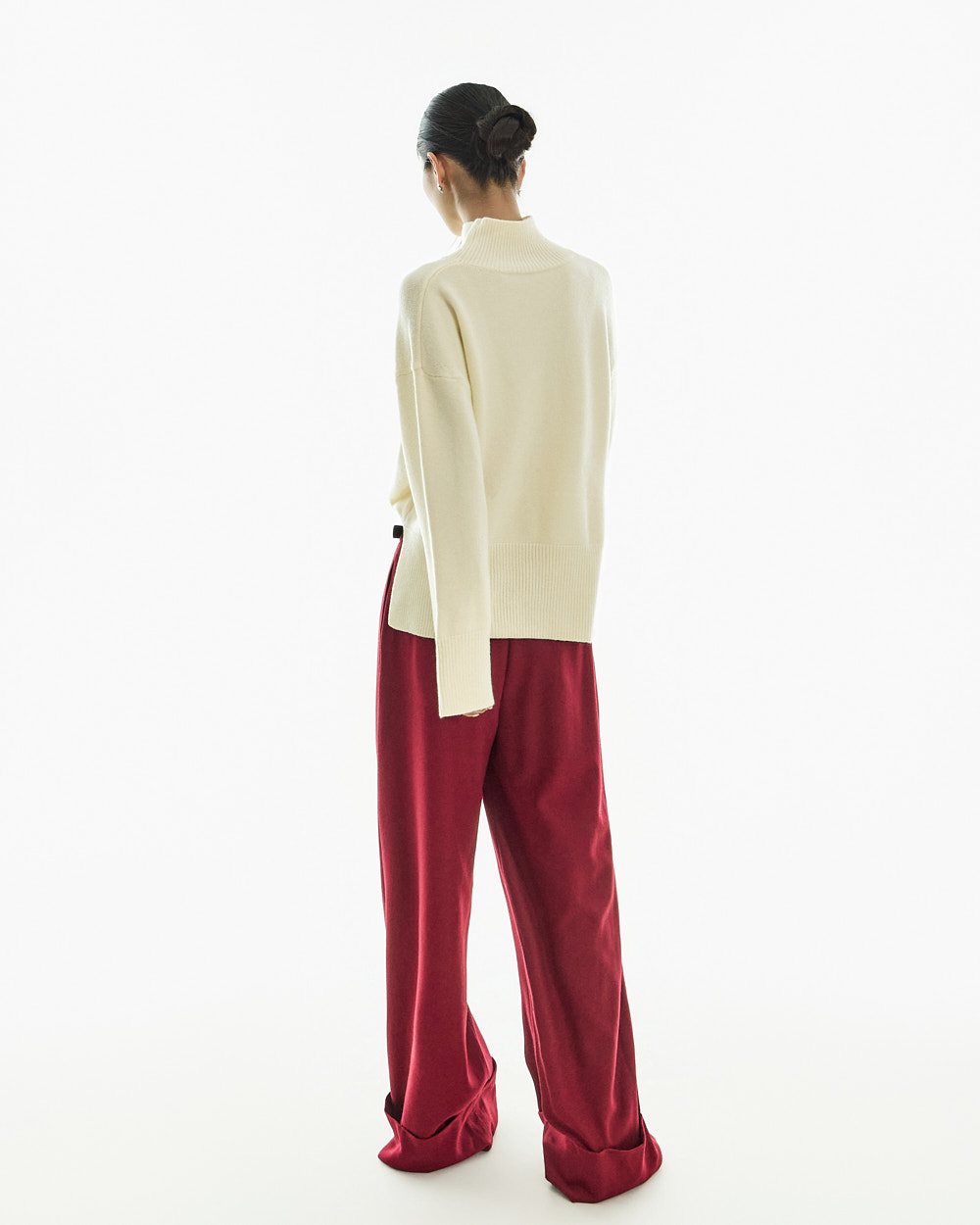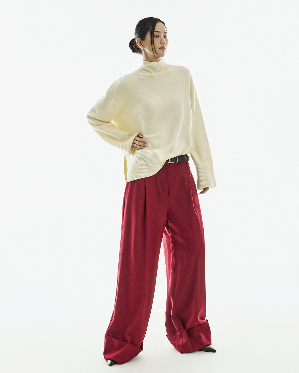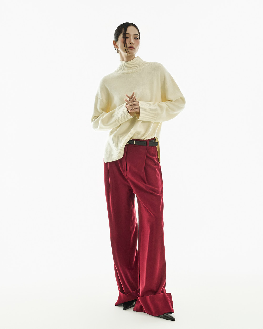 宽松阔腿版型自然垂落,前侧褶皱设计使腿部看起来修长纤细。