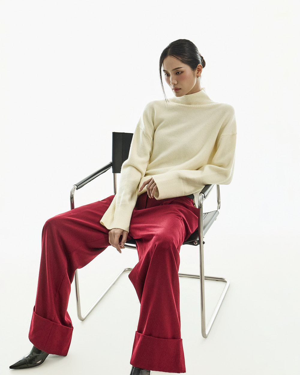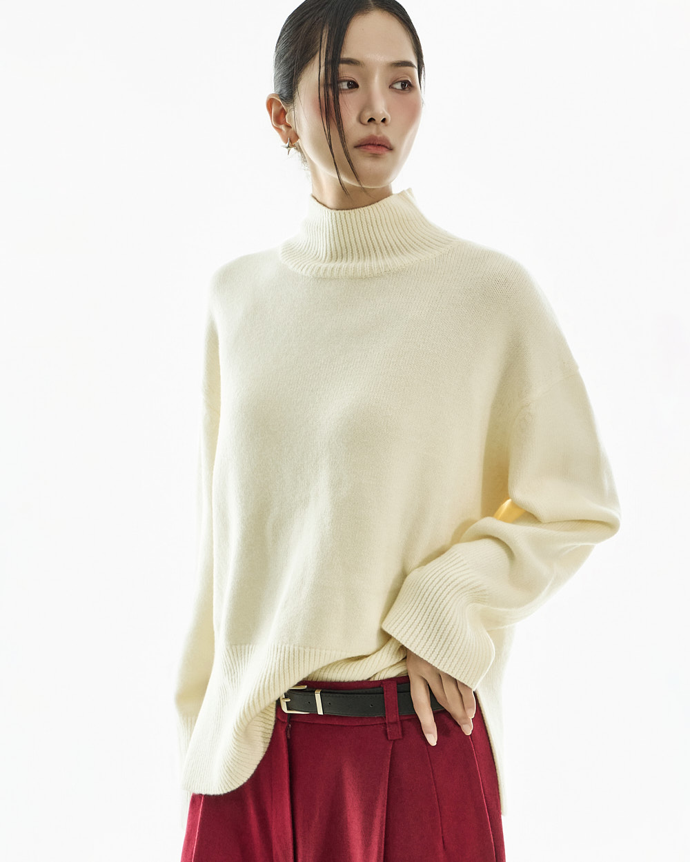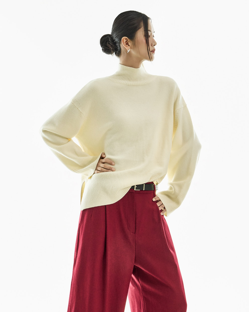 宽松阔腿版型自然垂落,前侧褶皱设计使腿部看起来修长纤细。