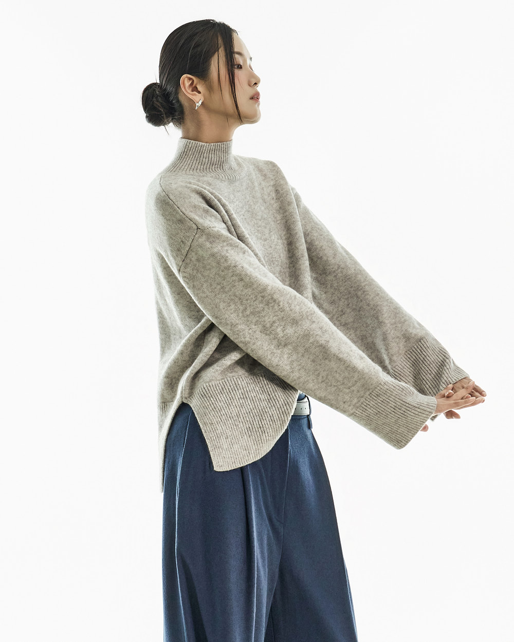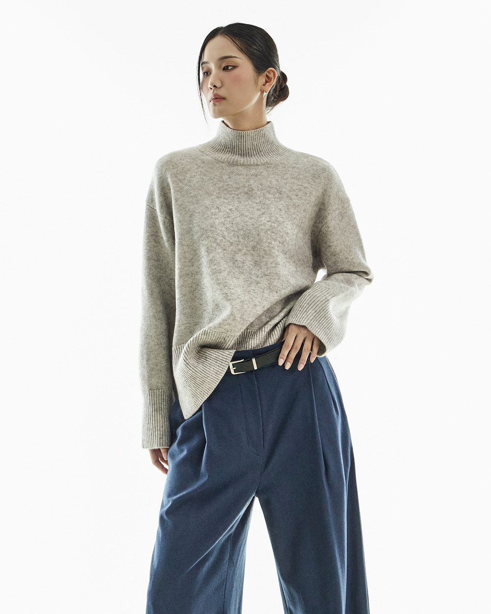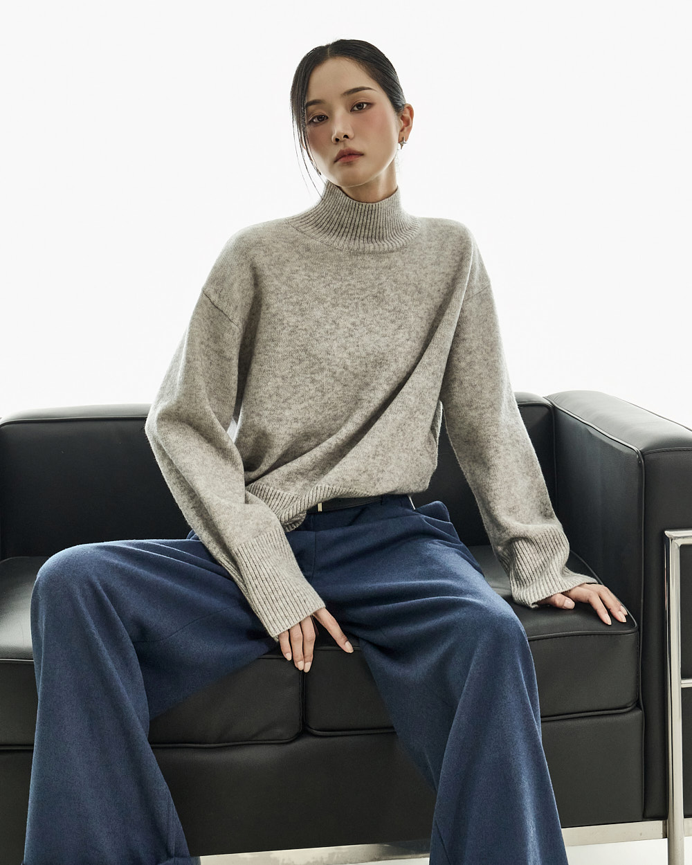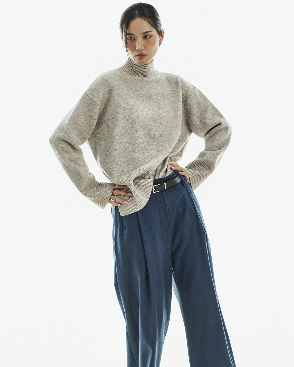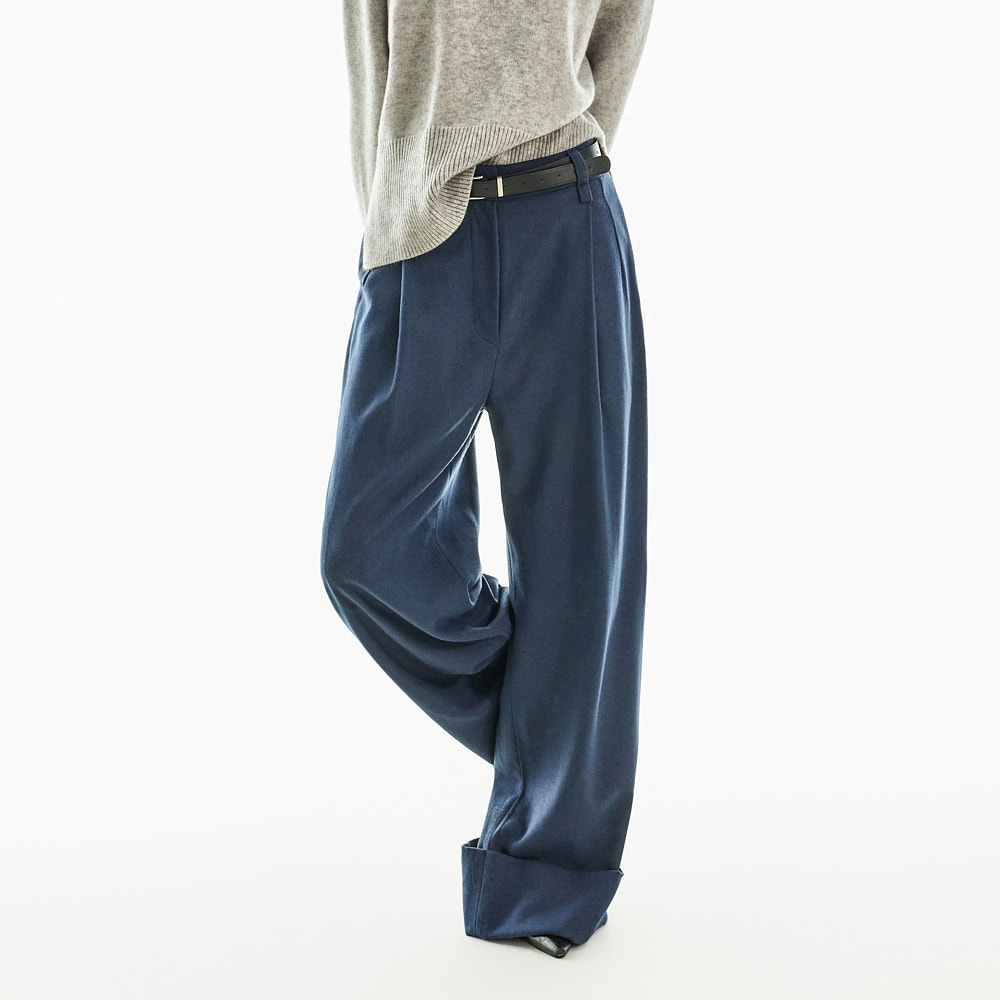 宽松阔腿版型自然垂落,前侧褶皱设计使腿部看起来修长纤细。