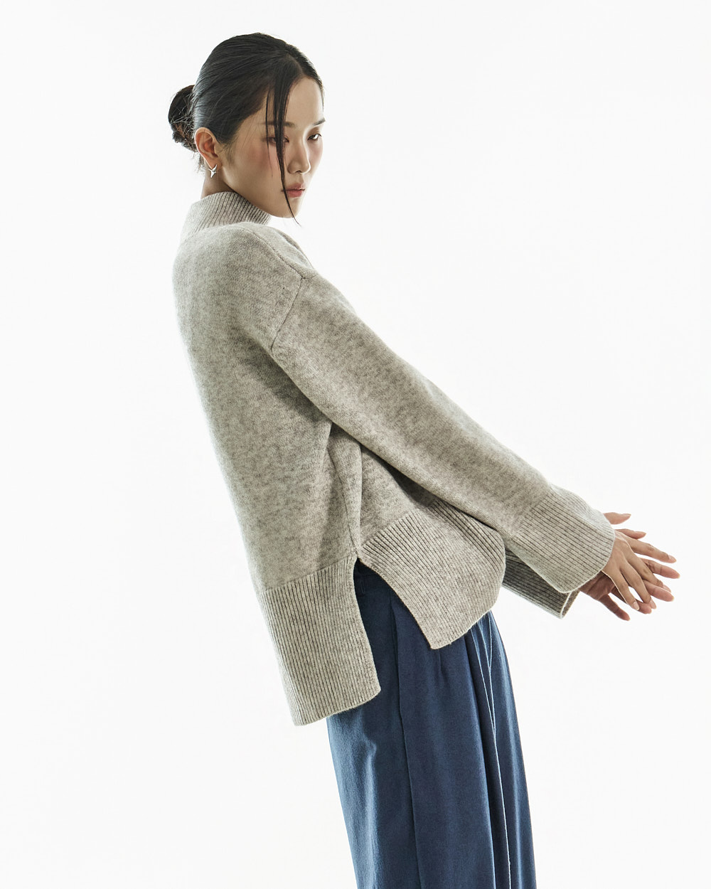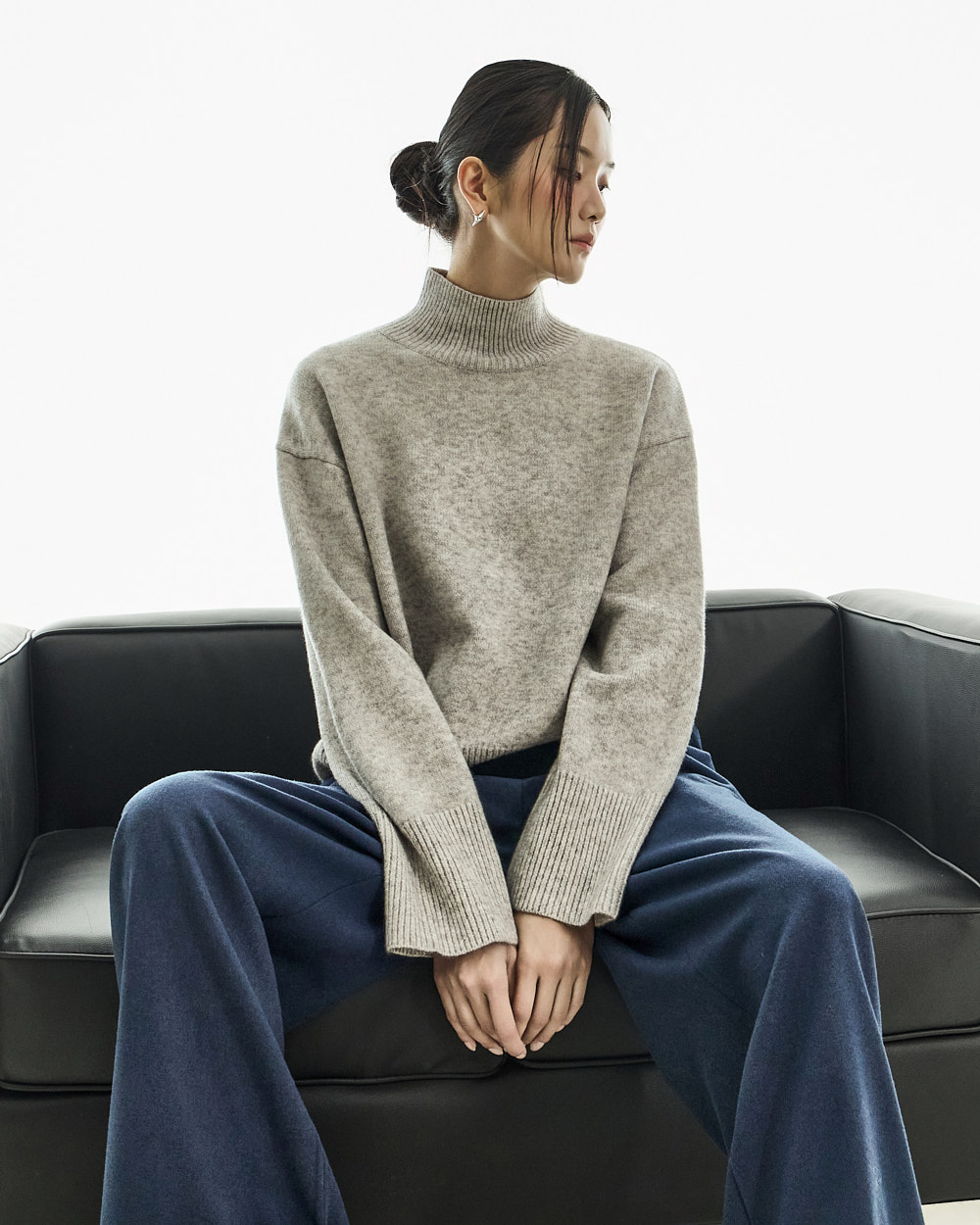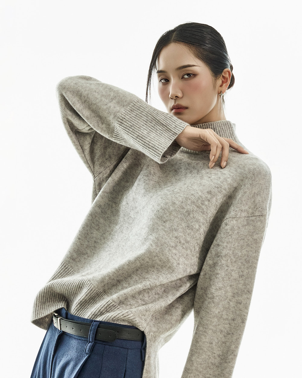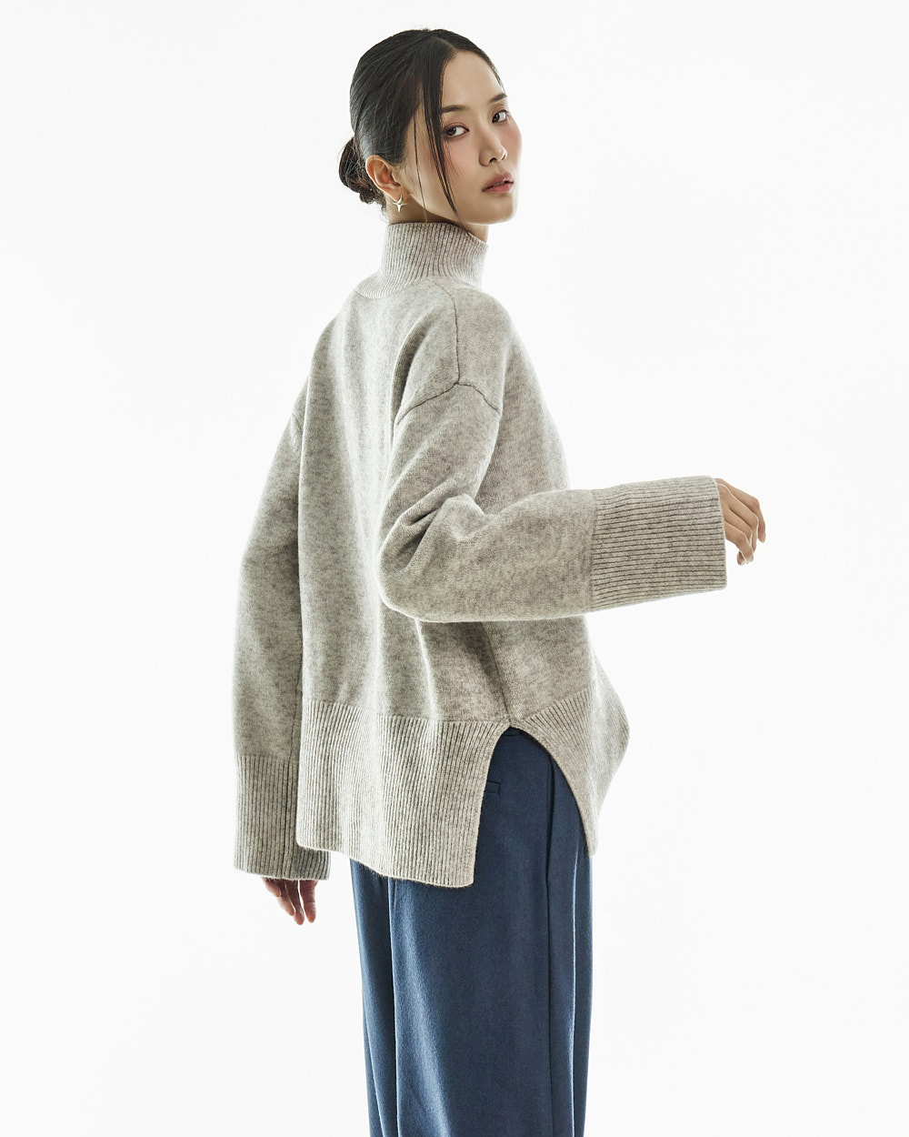 宽松阔腿版型自然垂落,前侧褶皱设计使腿部看起来修长纤细。