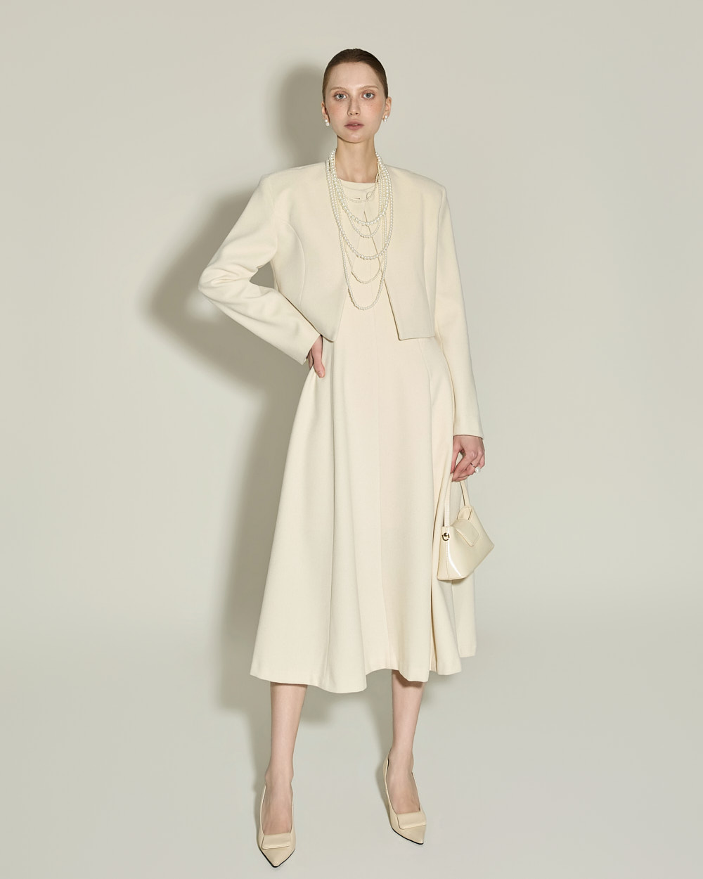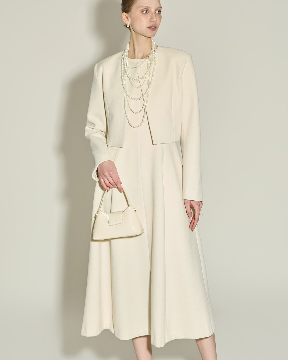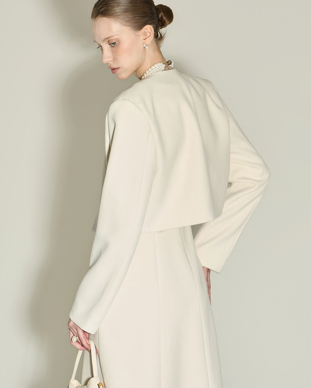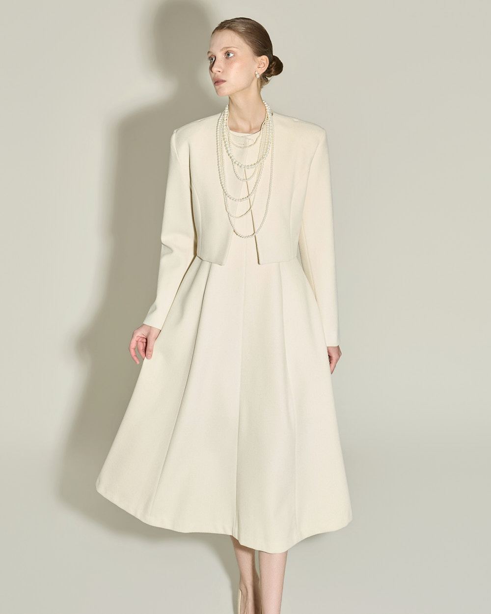 外套为整体内衬设计,连衣裙为局部内衬,穿着效果干净利落。