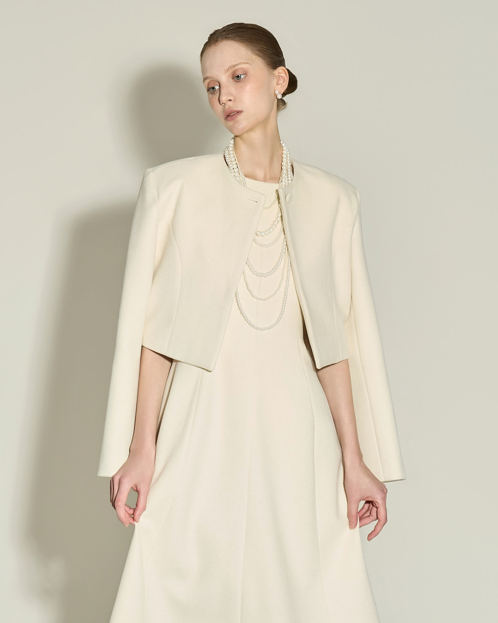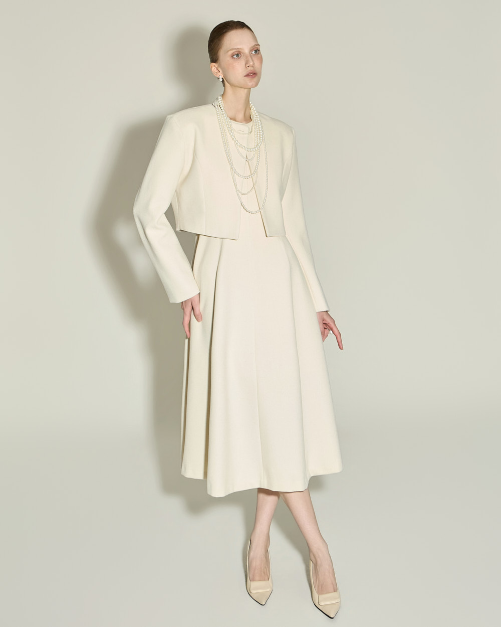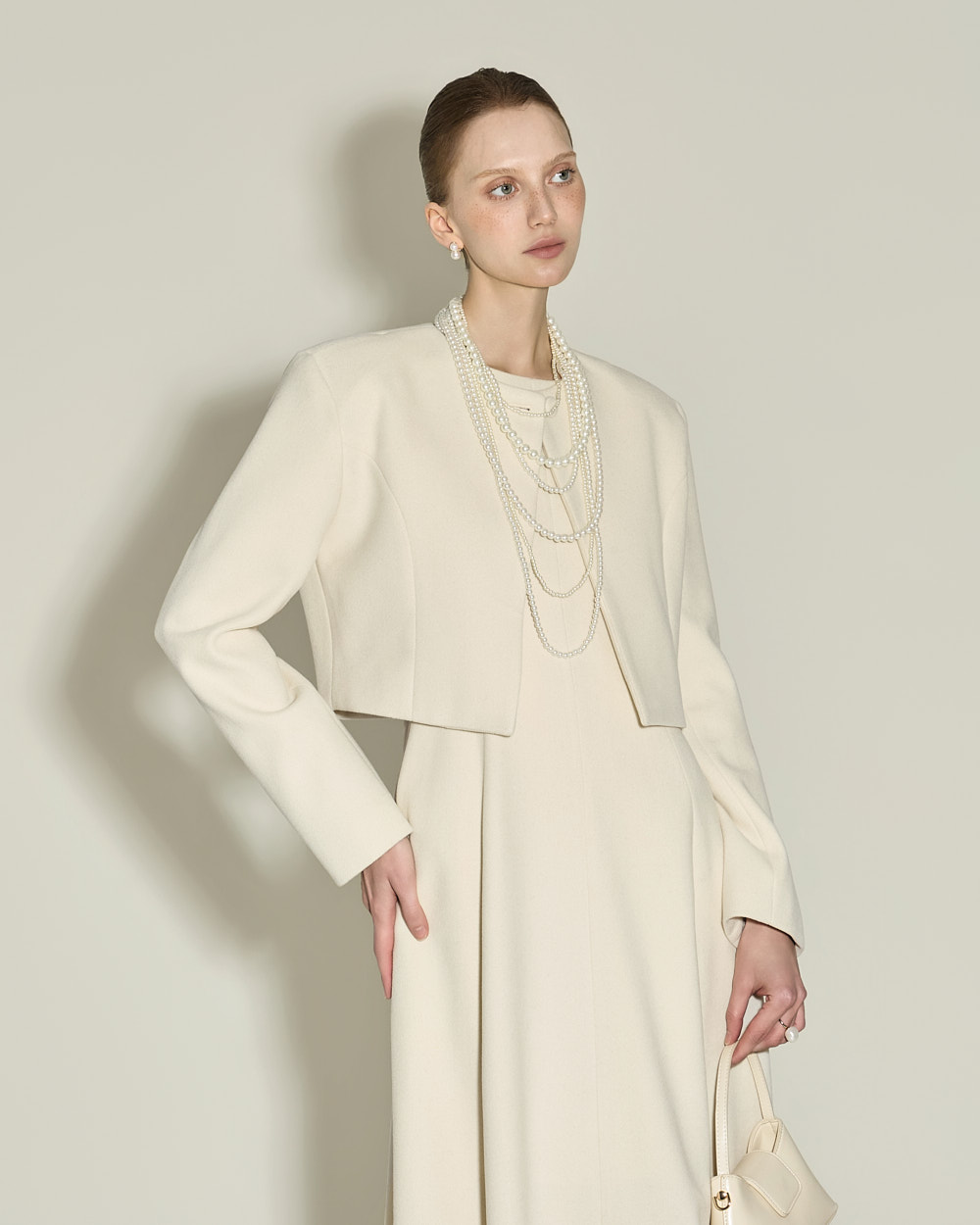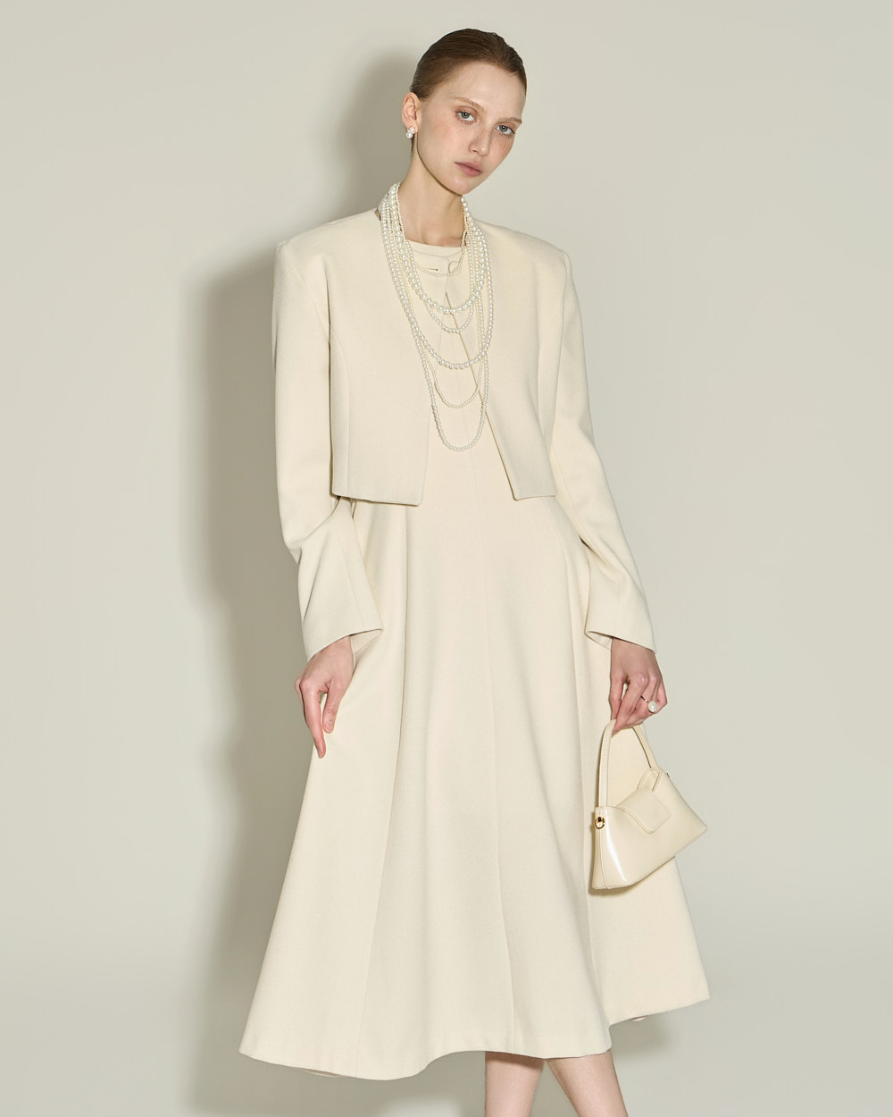 外套为整体内衬设计,连衣裙为局部内衬,穿着效果干净利落。