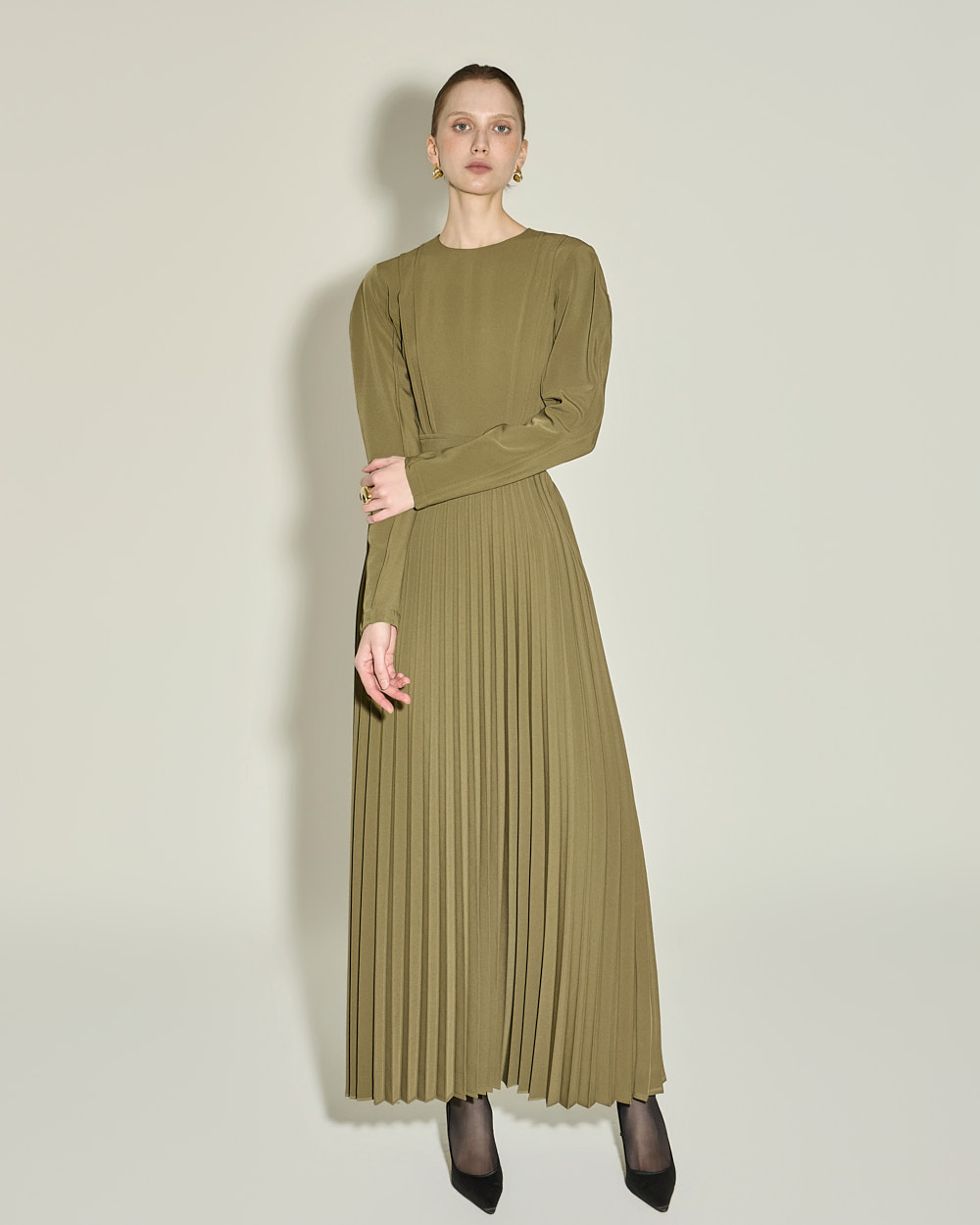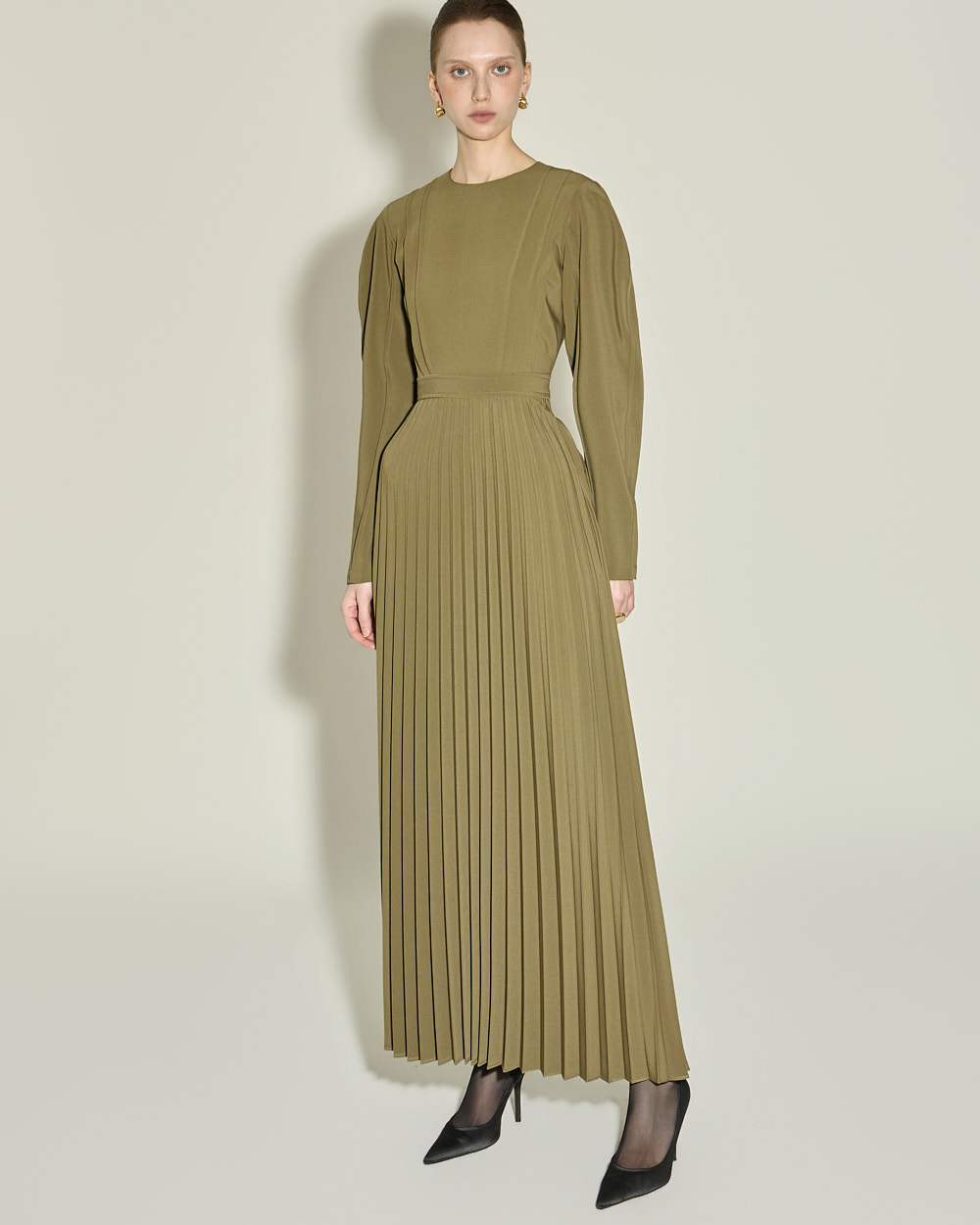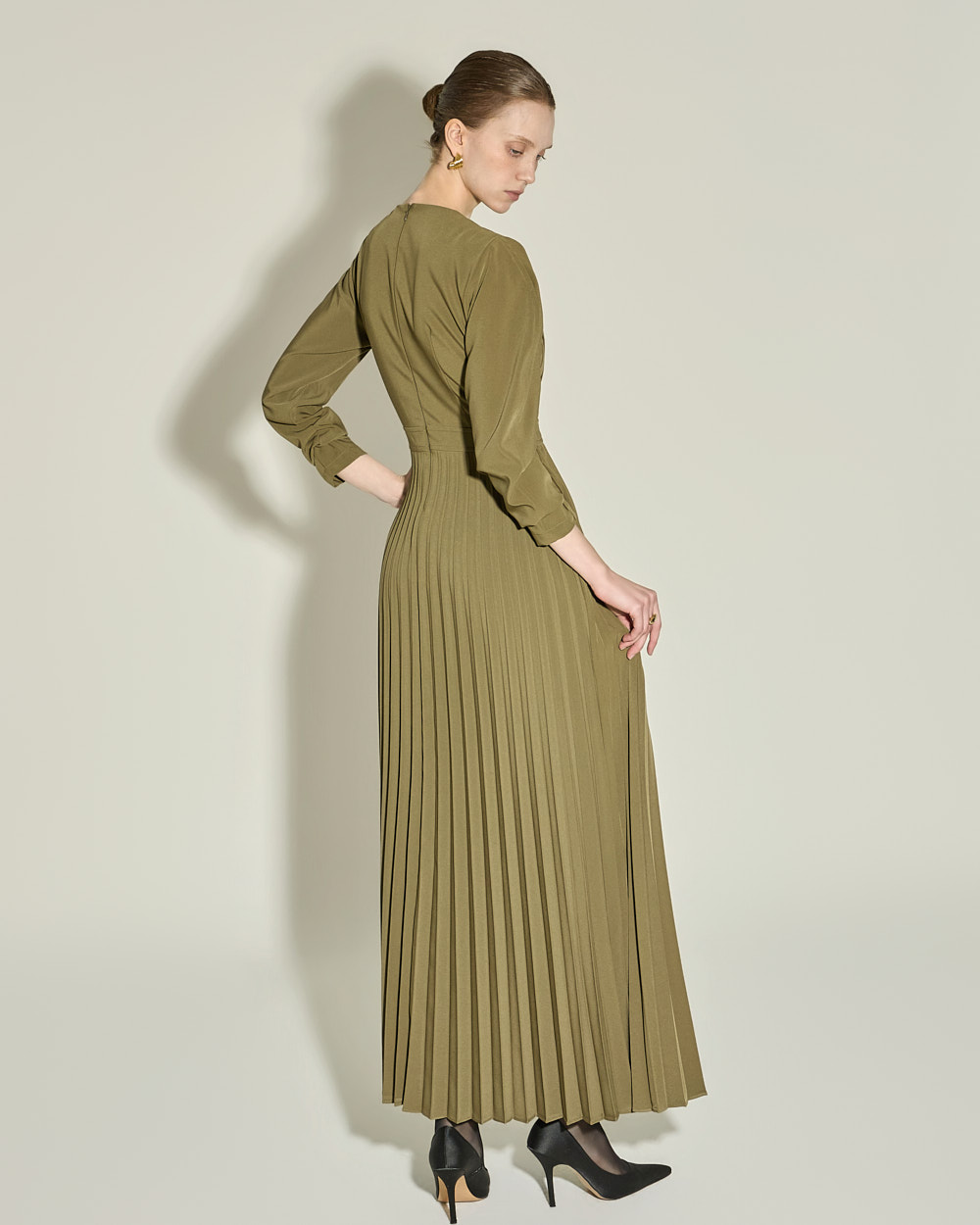 腰线以下自然展开的细密百褶,