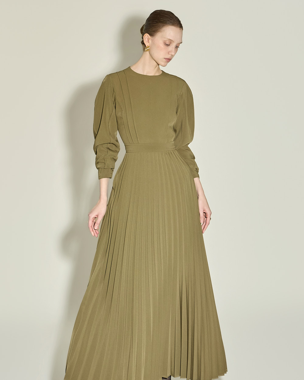 优雅氛围的百褶泡泡袖连衣裙。