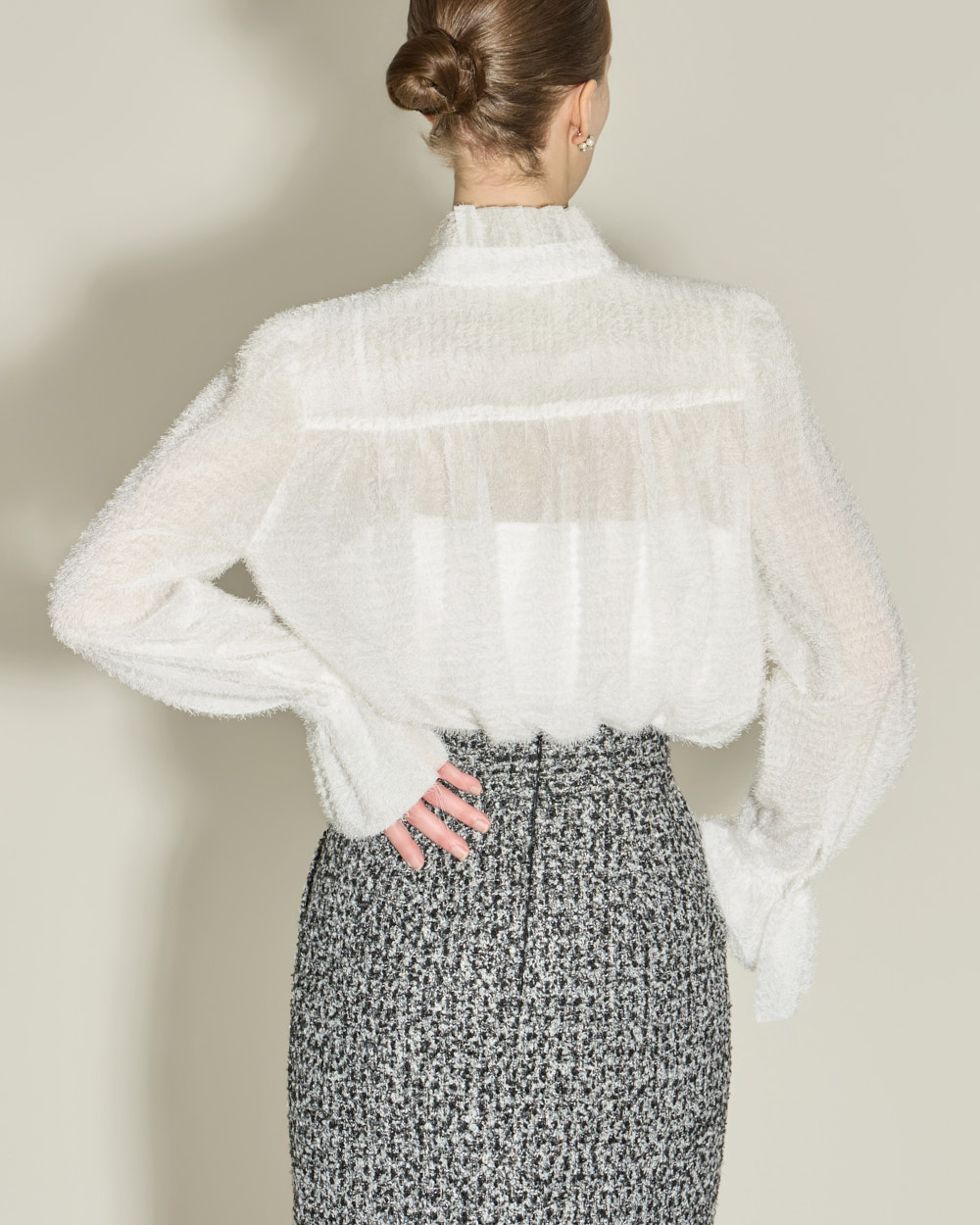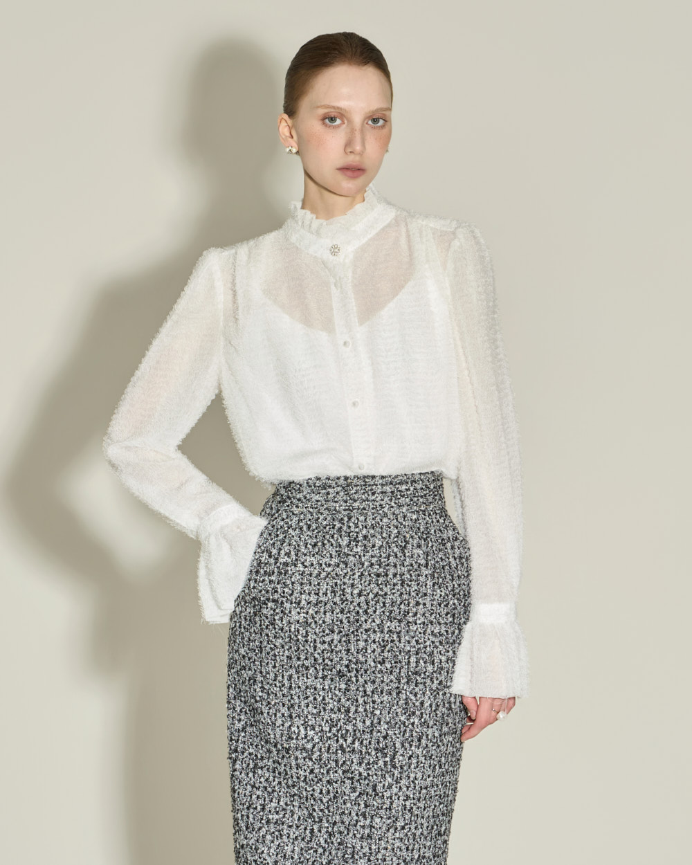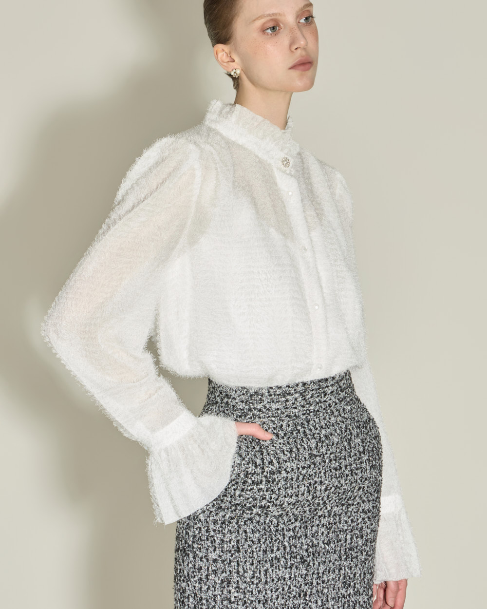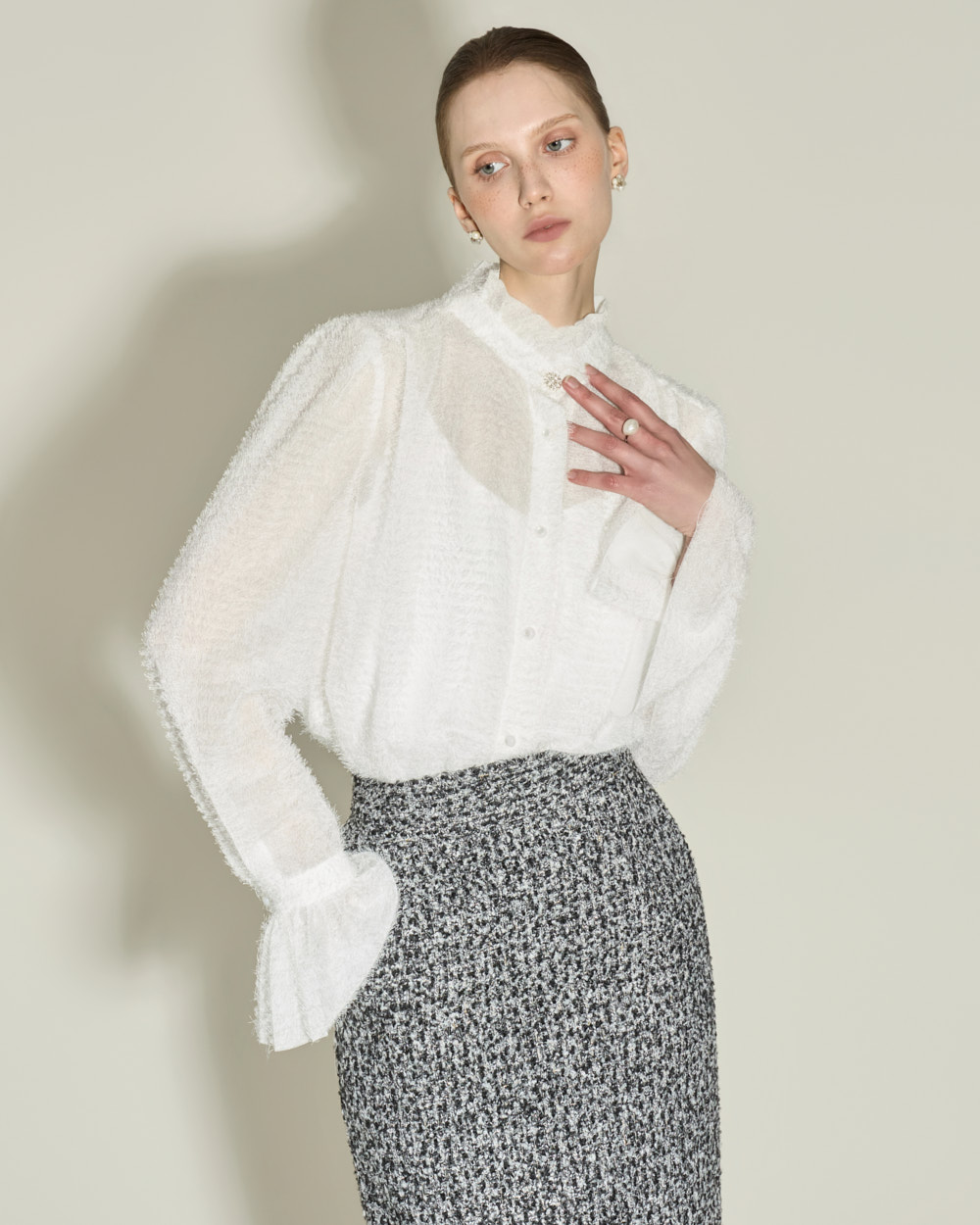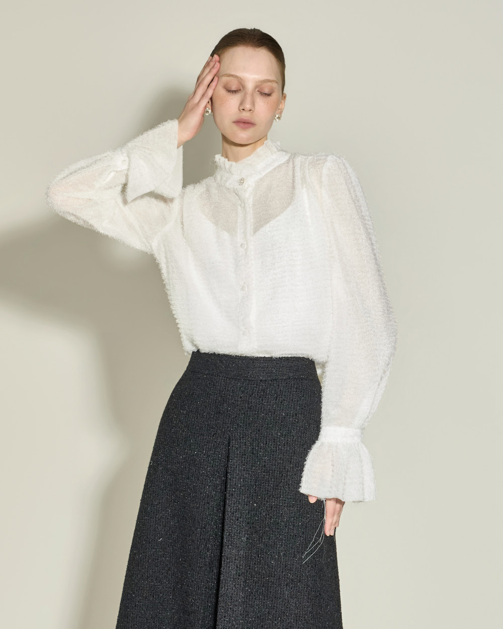 优雅氛围的荷叶边高领衬衫。