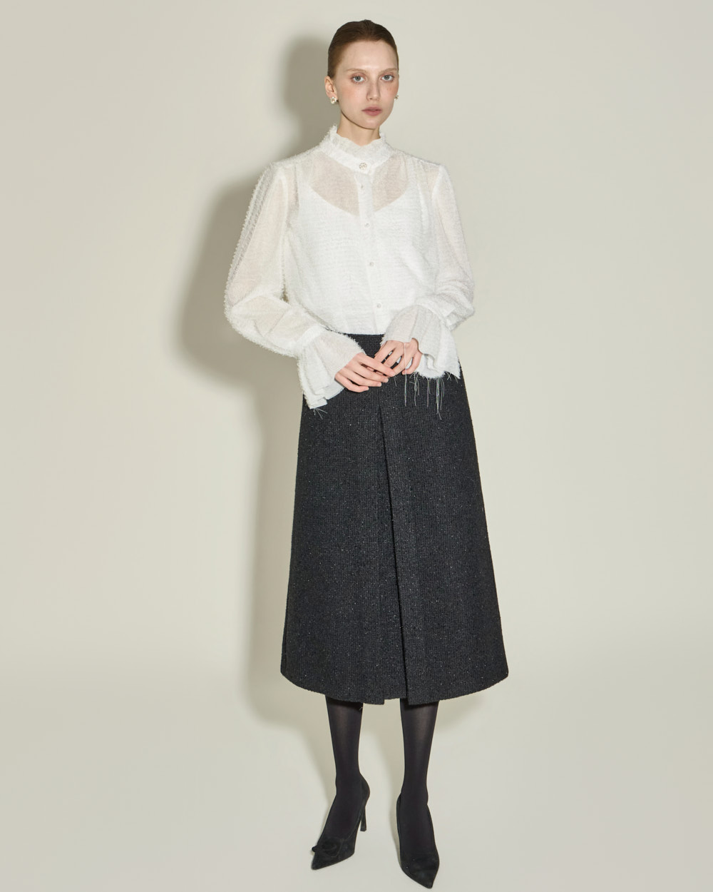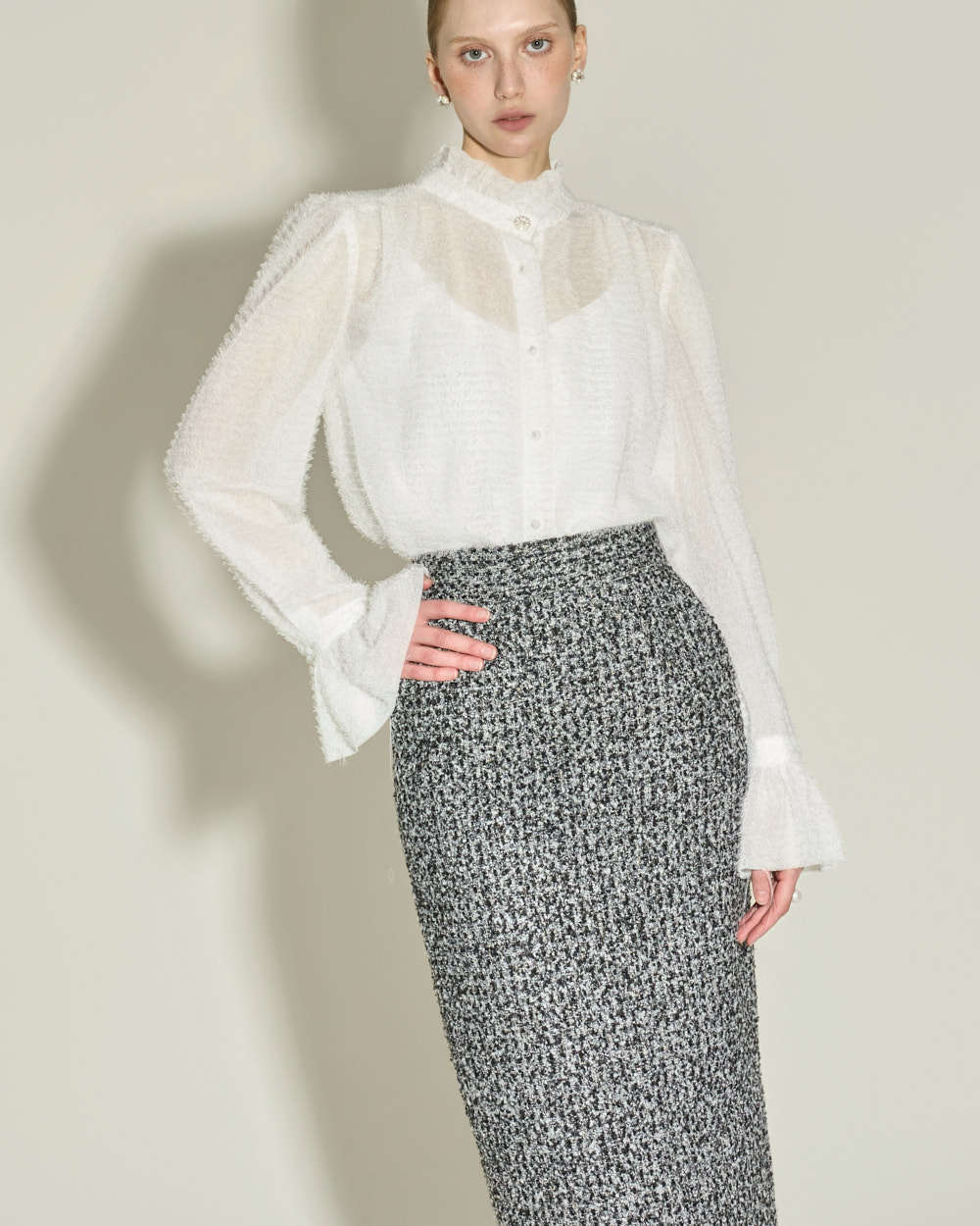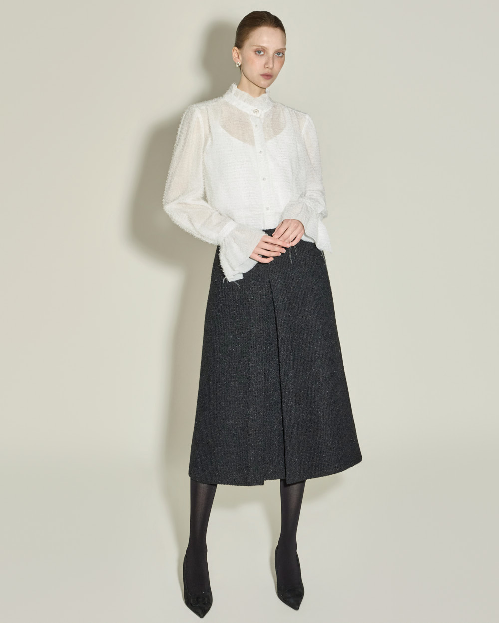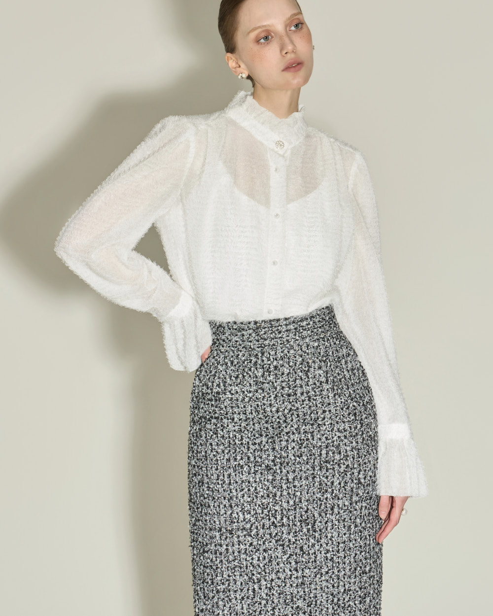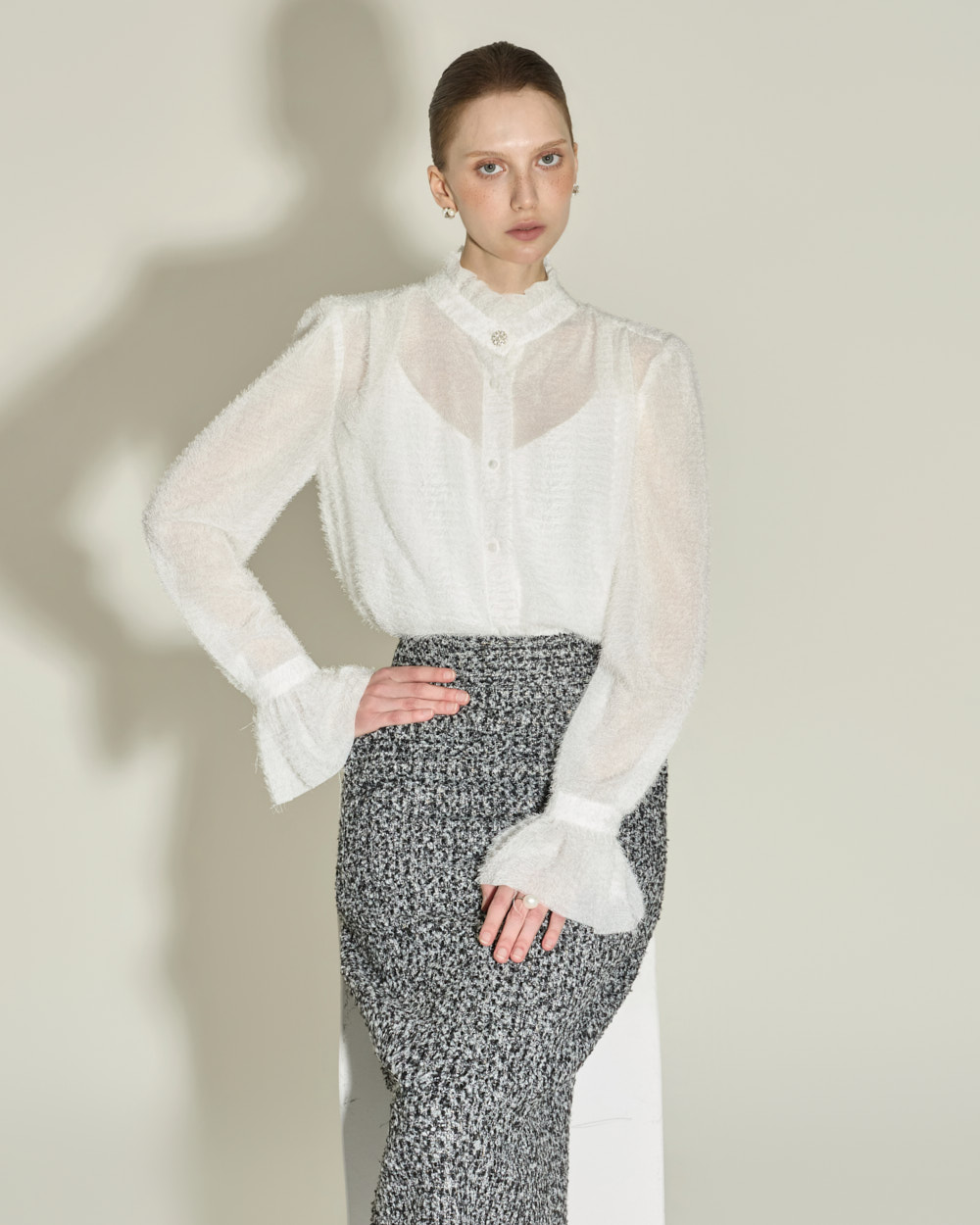 优雅氛围的荷叶边高领衬衫。
