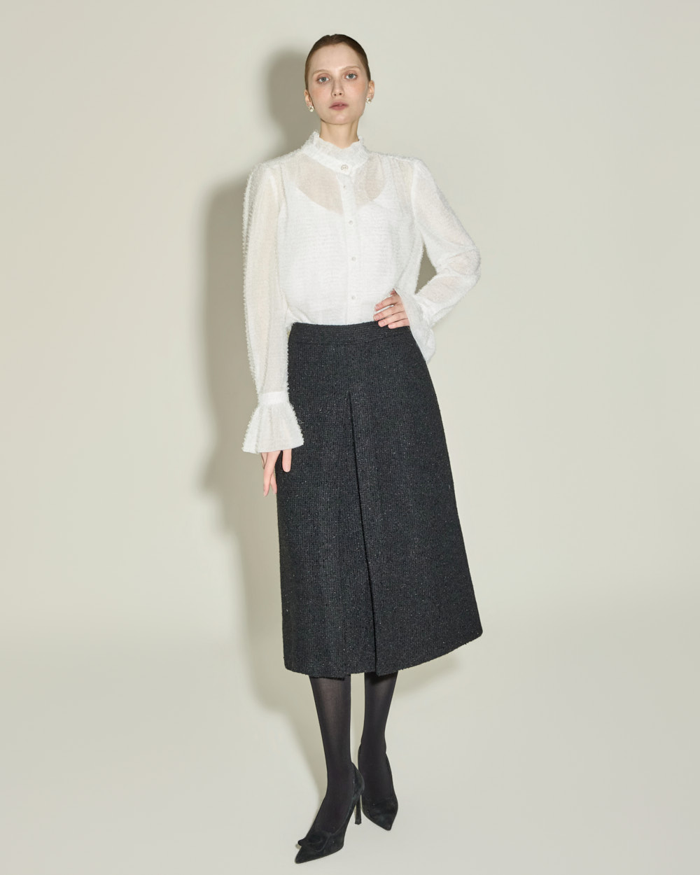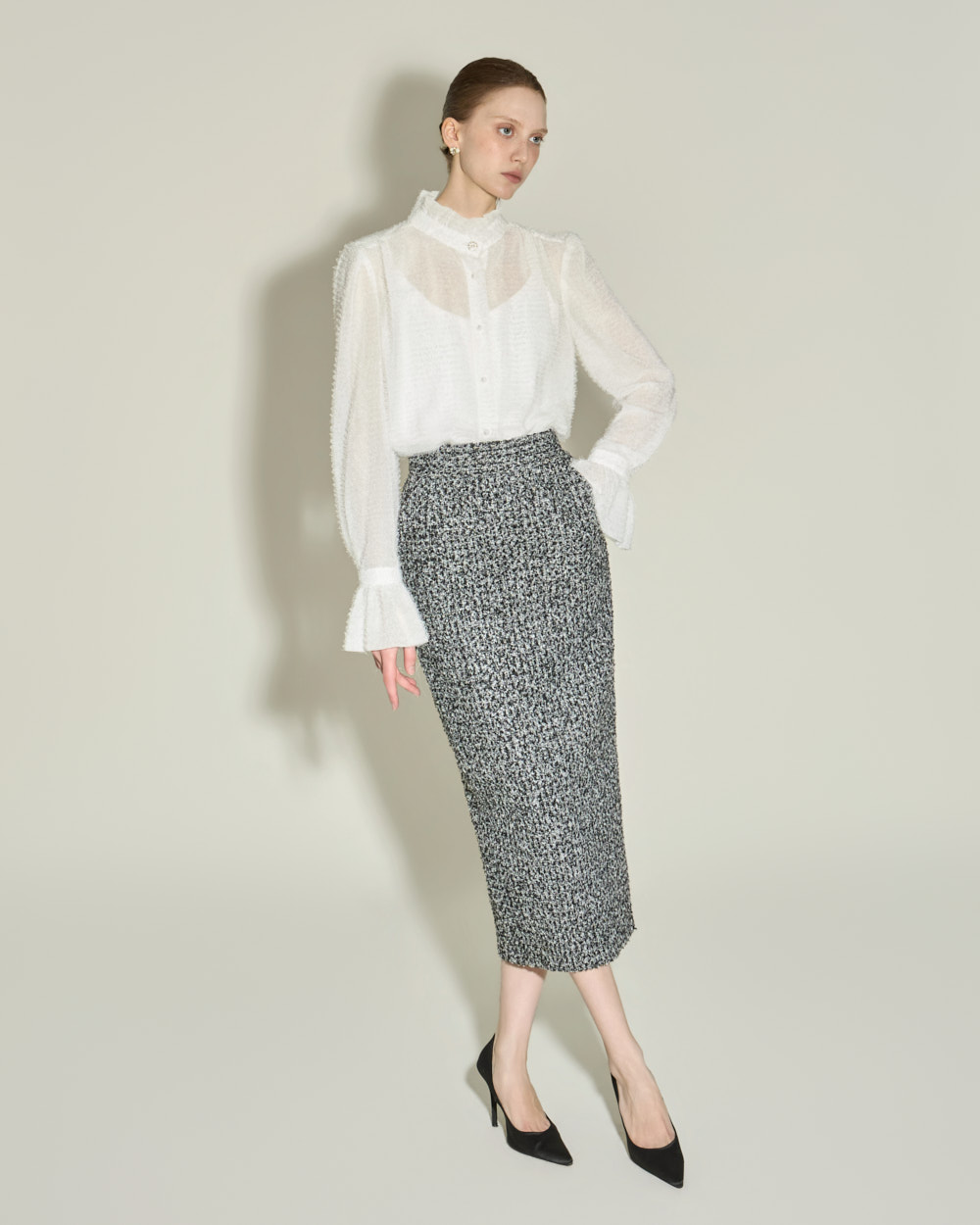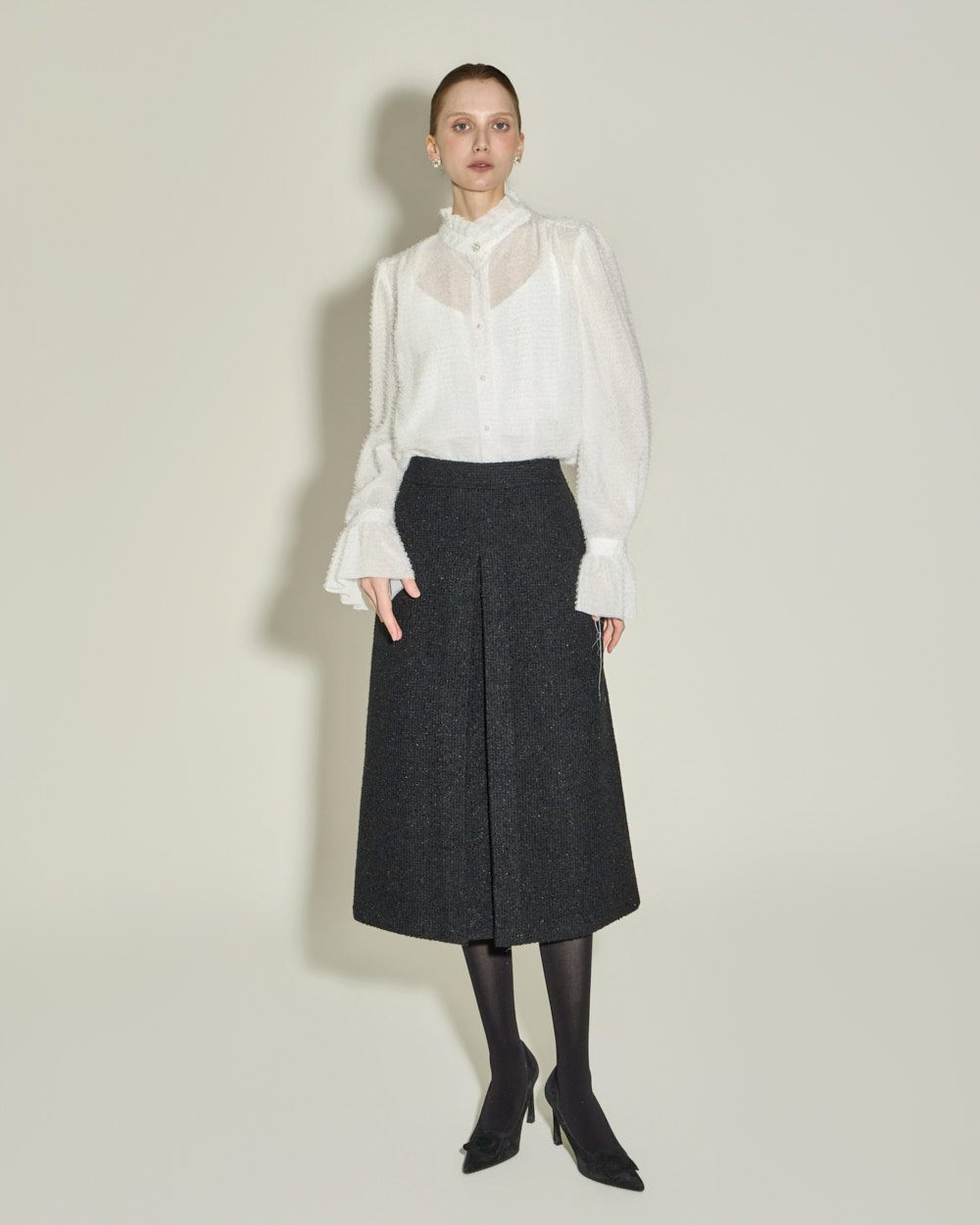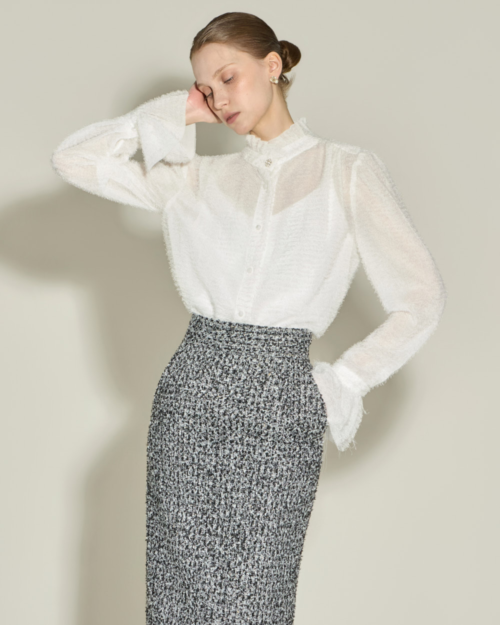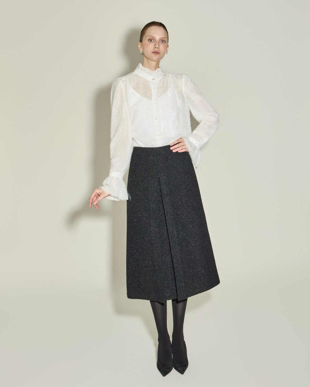 优雅氛围的荷叶边高领衬衫。