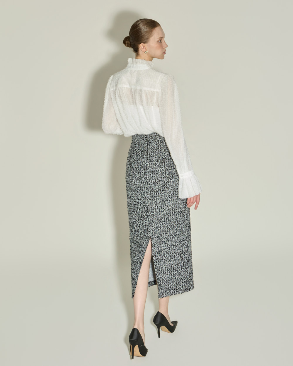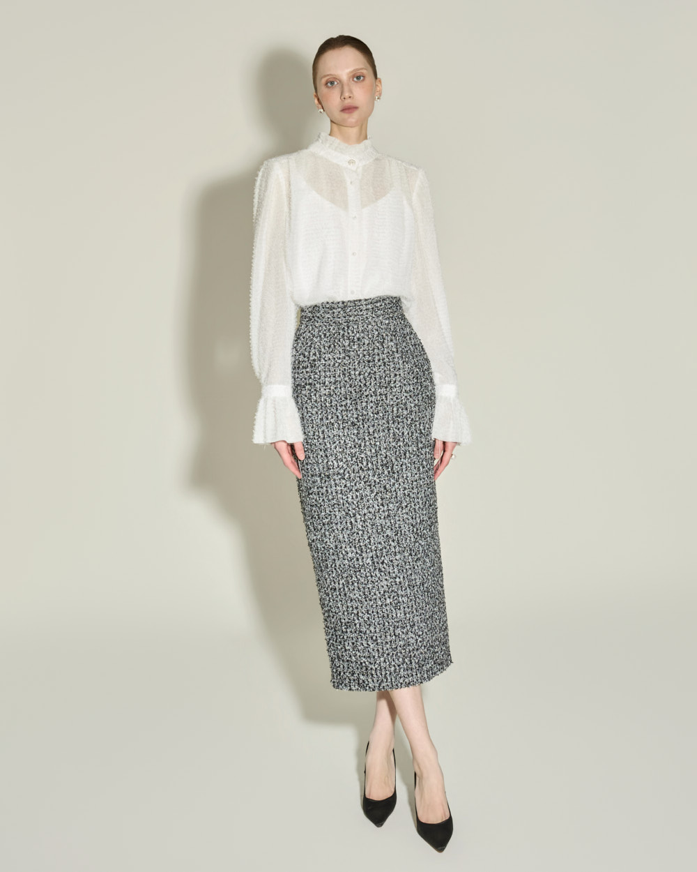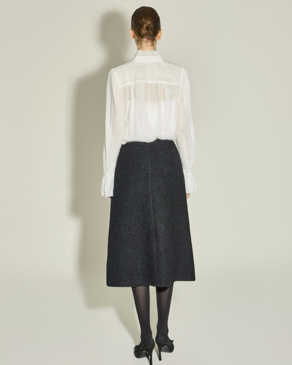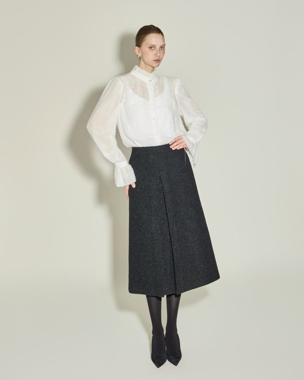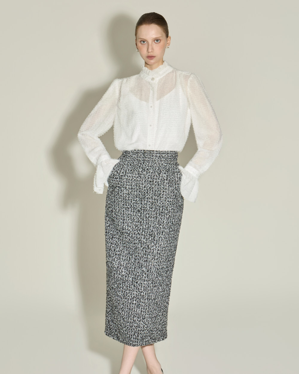 优雅氛围的荷叶边高领衬衫。