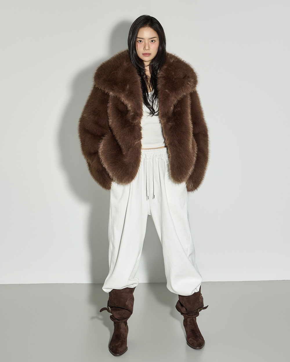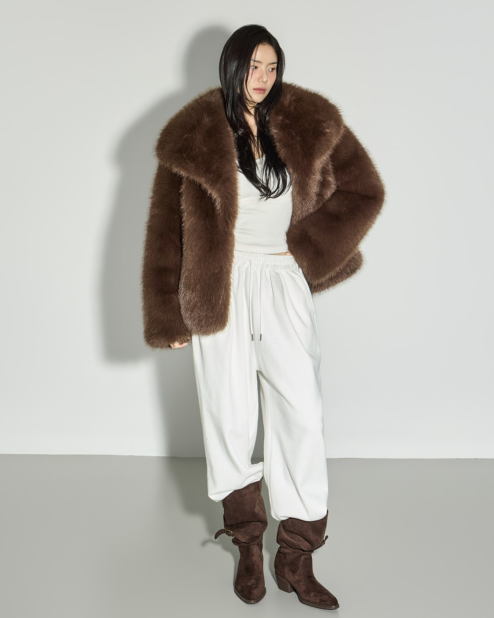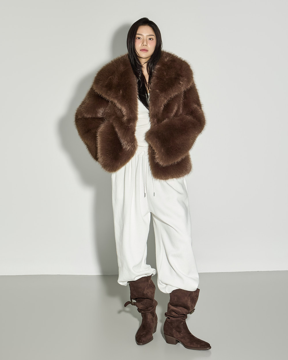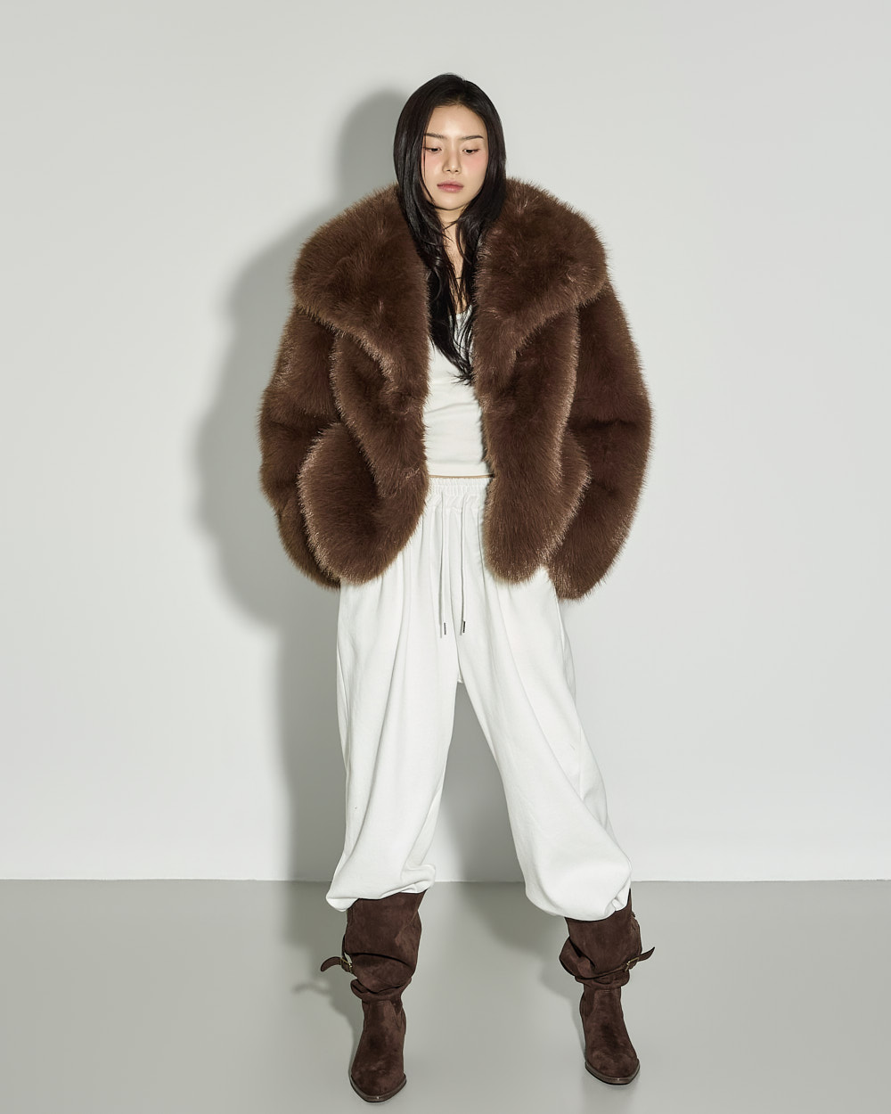 미니멀한 무드의 빅 카라 퍼 자켓이며,
