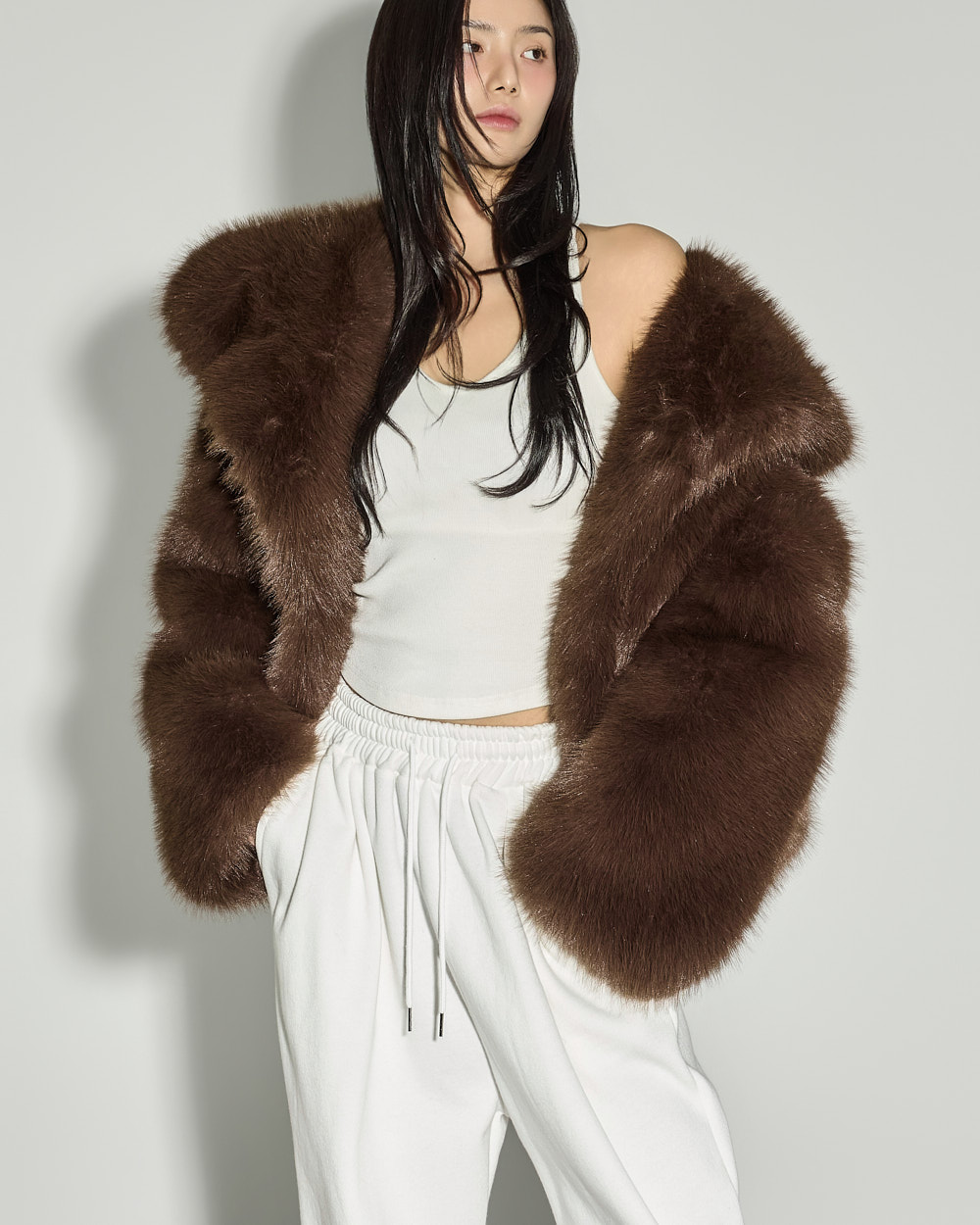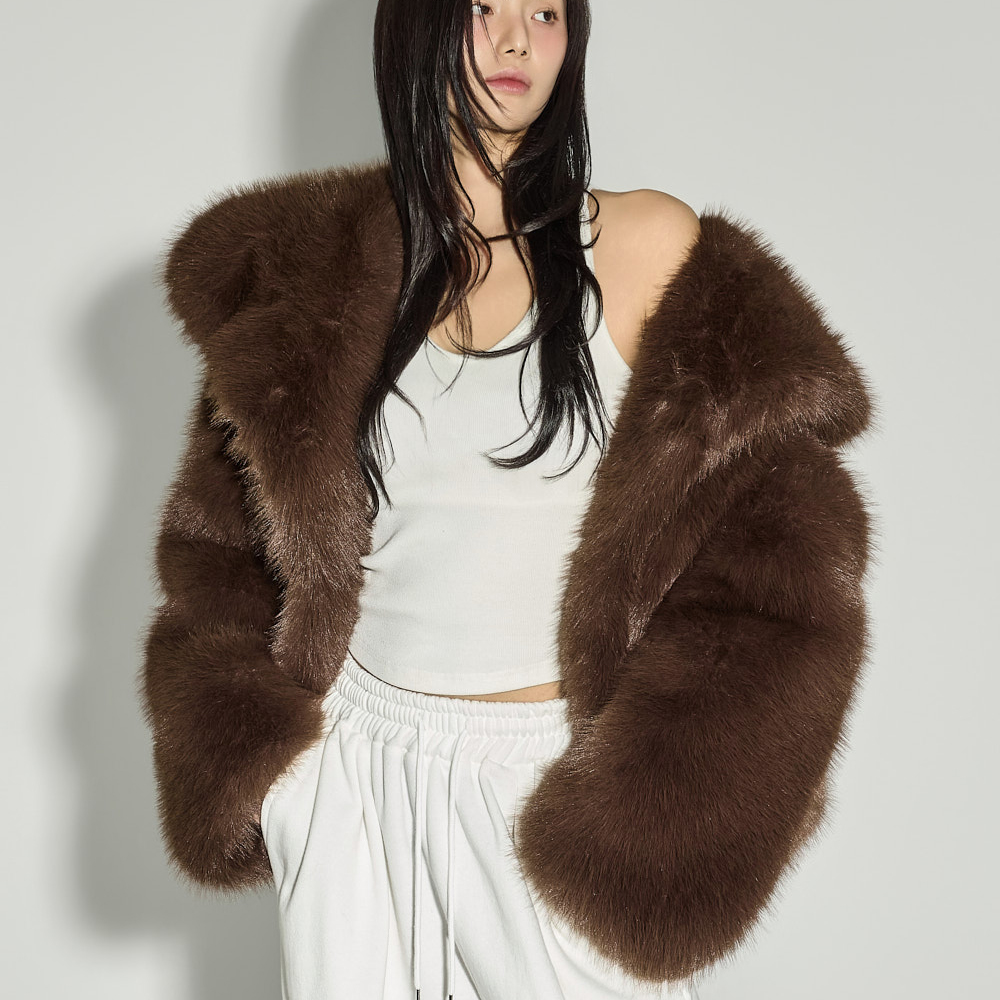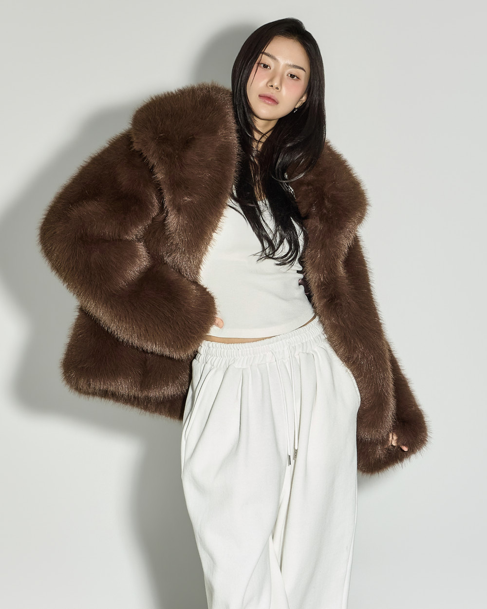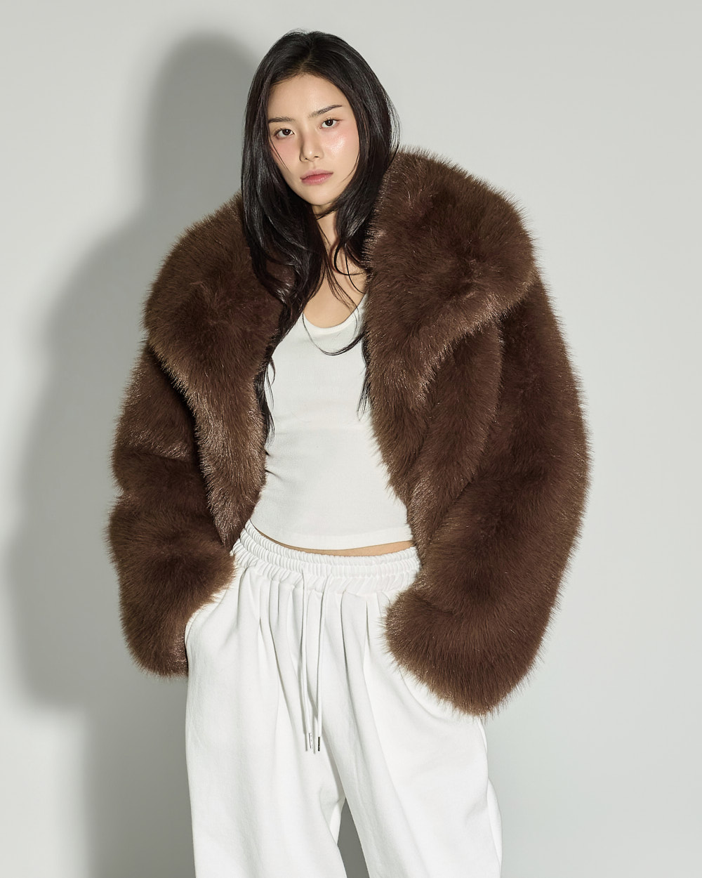 미니멀한 무드의 빅 카라 퍼 자켓이며,